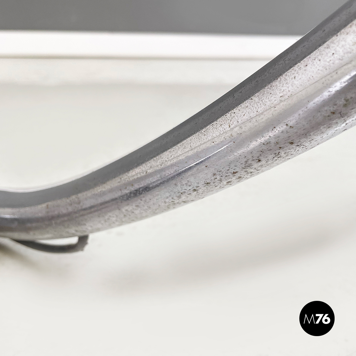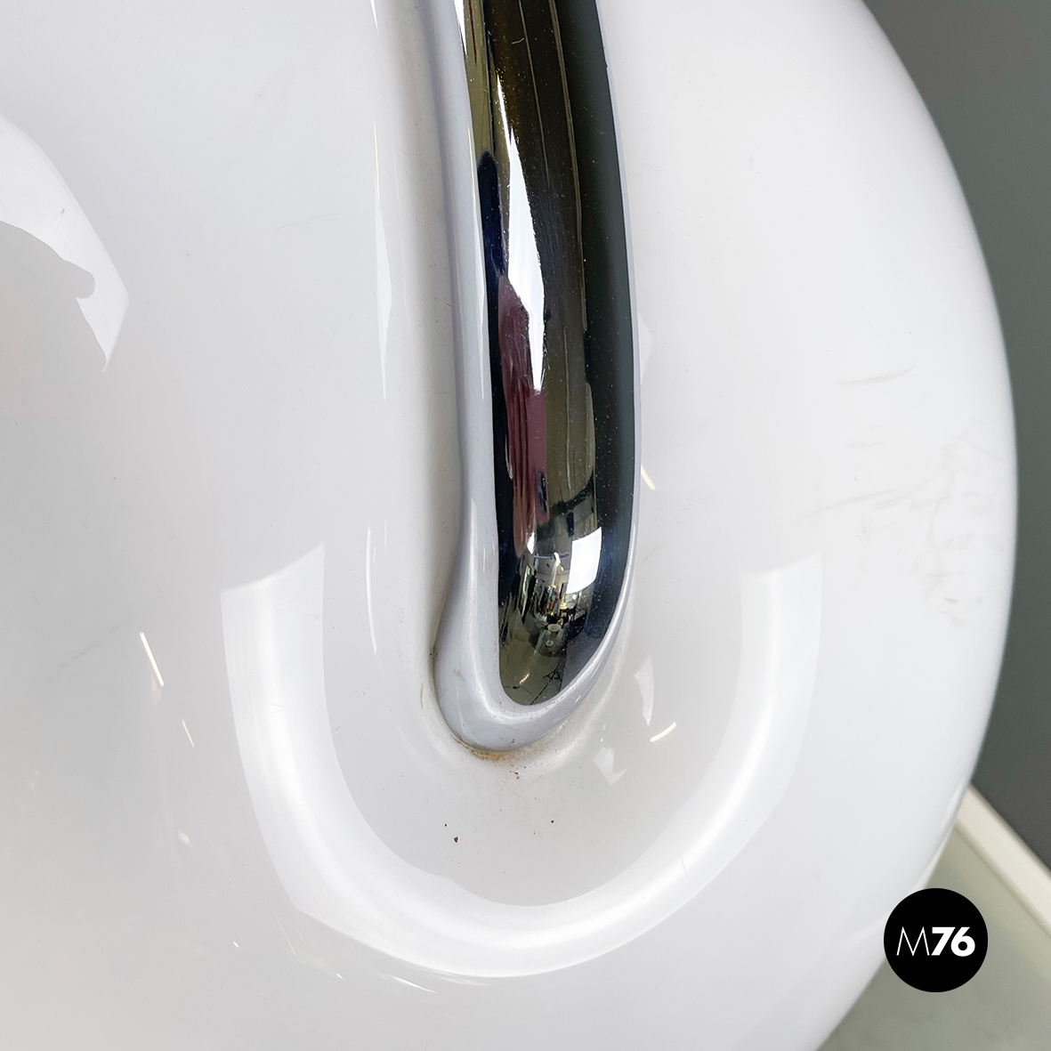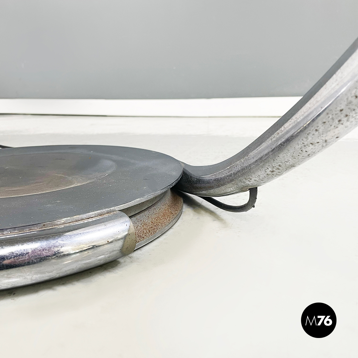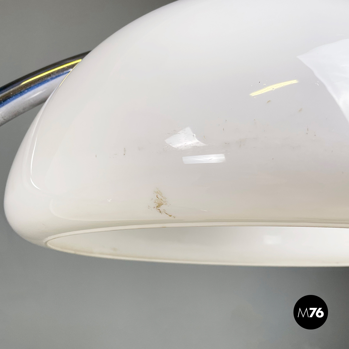 Lampada da terra modello 2131 Serpente con struttura orientabile in tubolare di metallo. Il paralume semi-sferico è in plexiglass opalino. La struttura tondeggiante presenta nel mezzo il perno per poter ruotare il paralume a 360 gradi. La base tonda è in metallo.