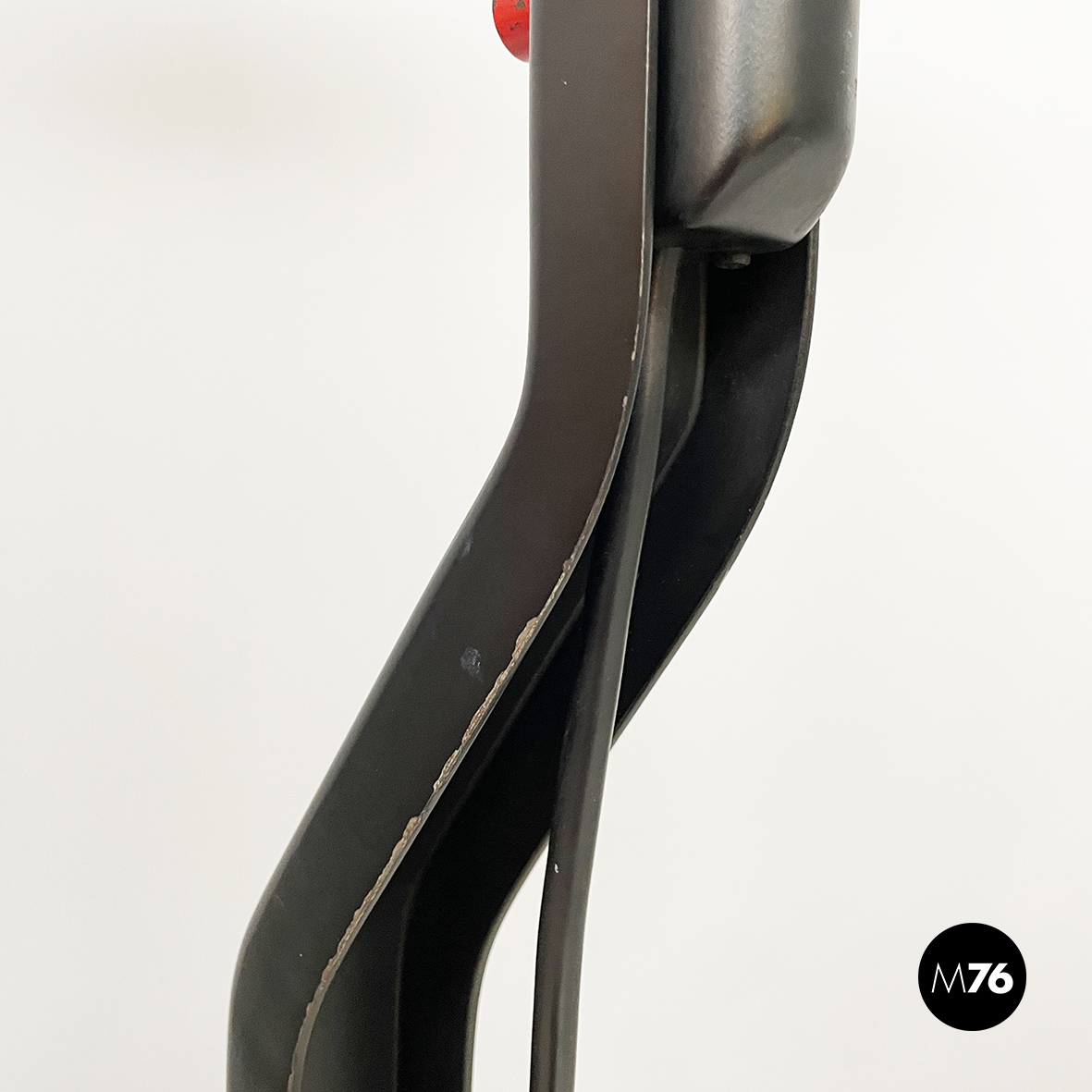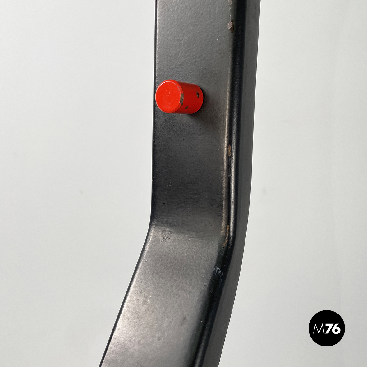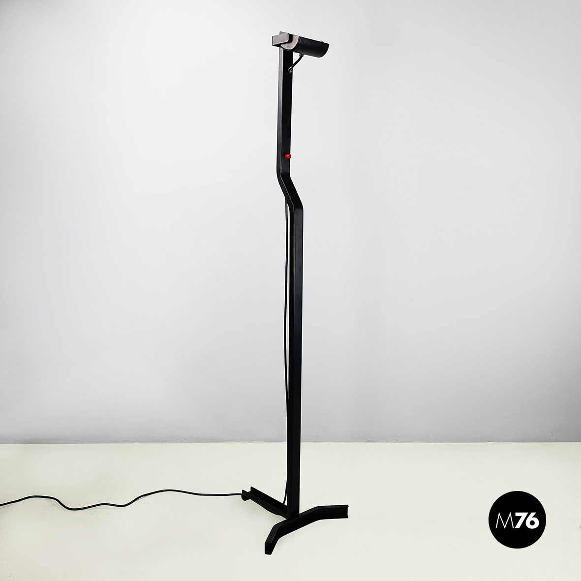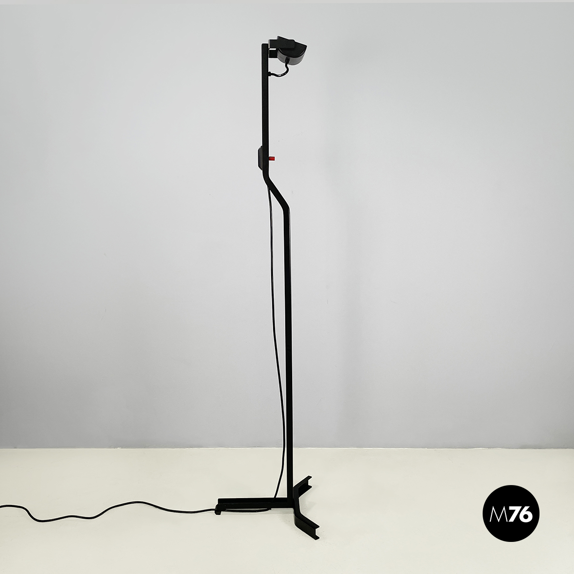 Lampada da terra modello Sirio con diffusore orientabile, interamente in metallo nero. La struttura centrale è composta da una lamina in metallo incurvata a C. Al centro della struttura è presente l’interruttore dimmerabile cilindrico e rosso. La base è composta da tre zampe.