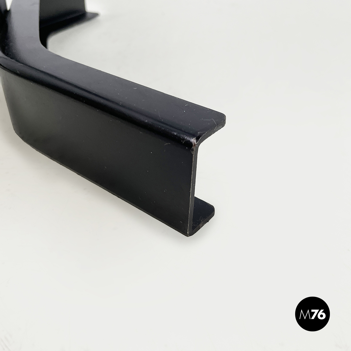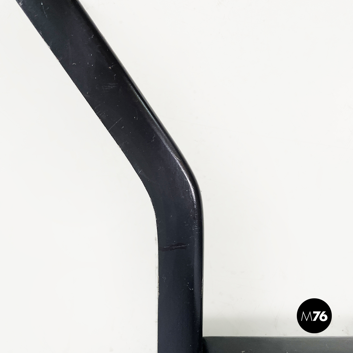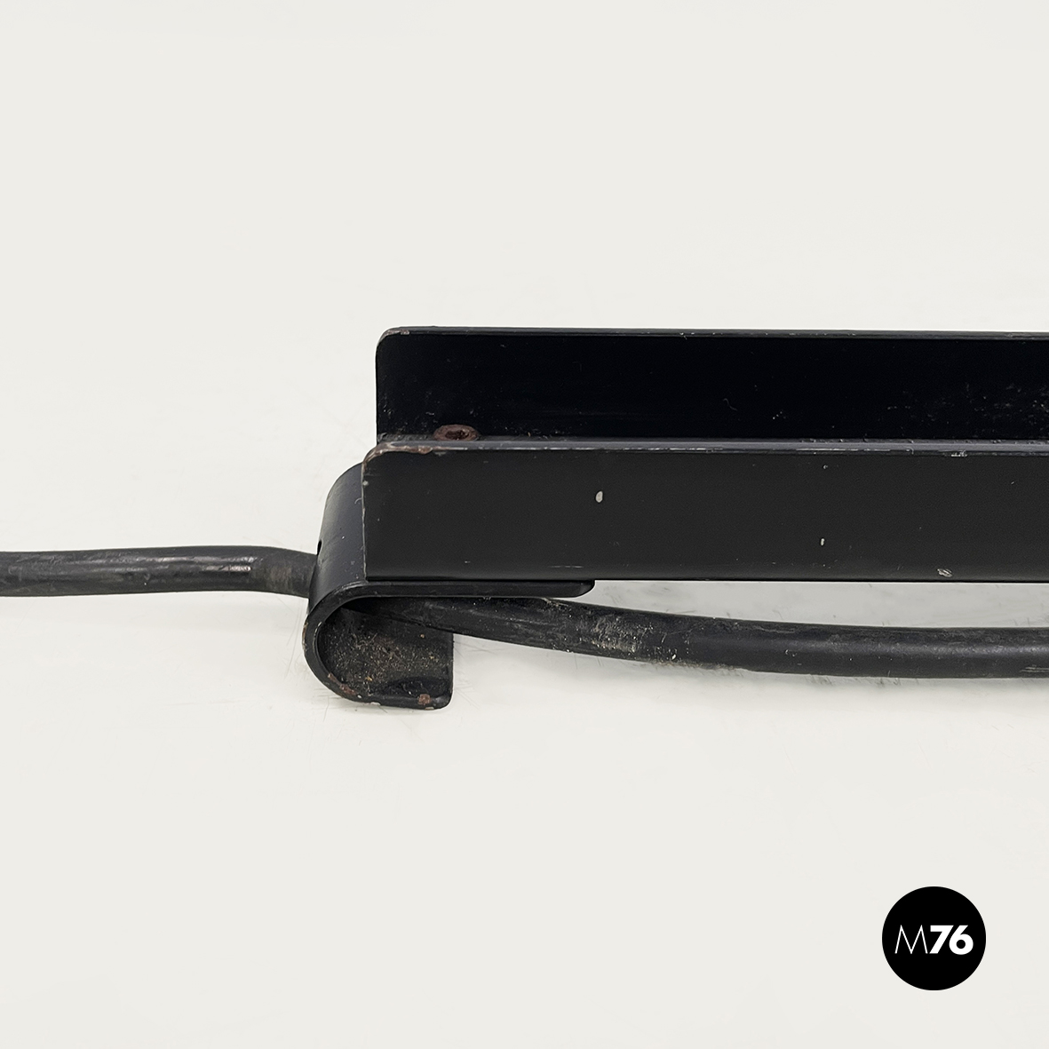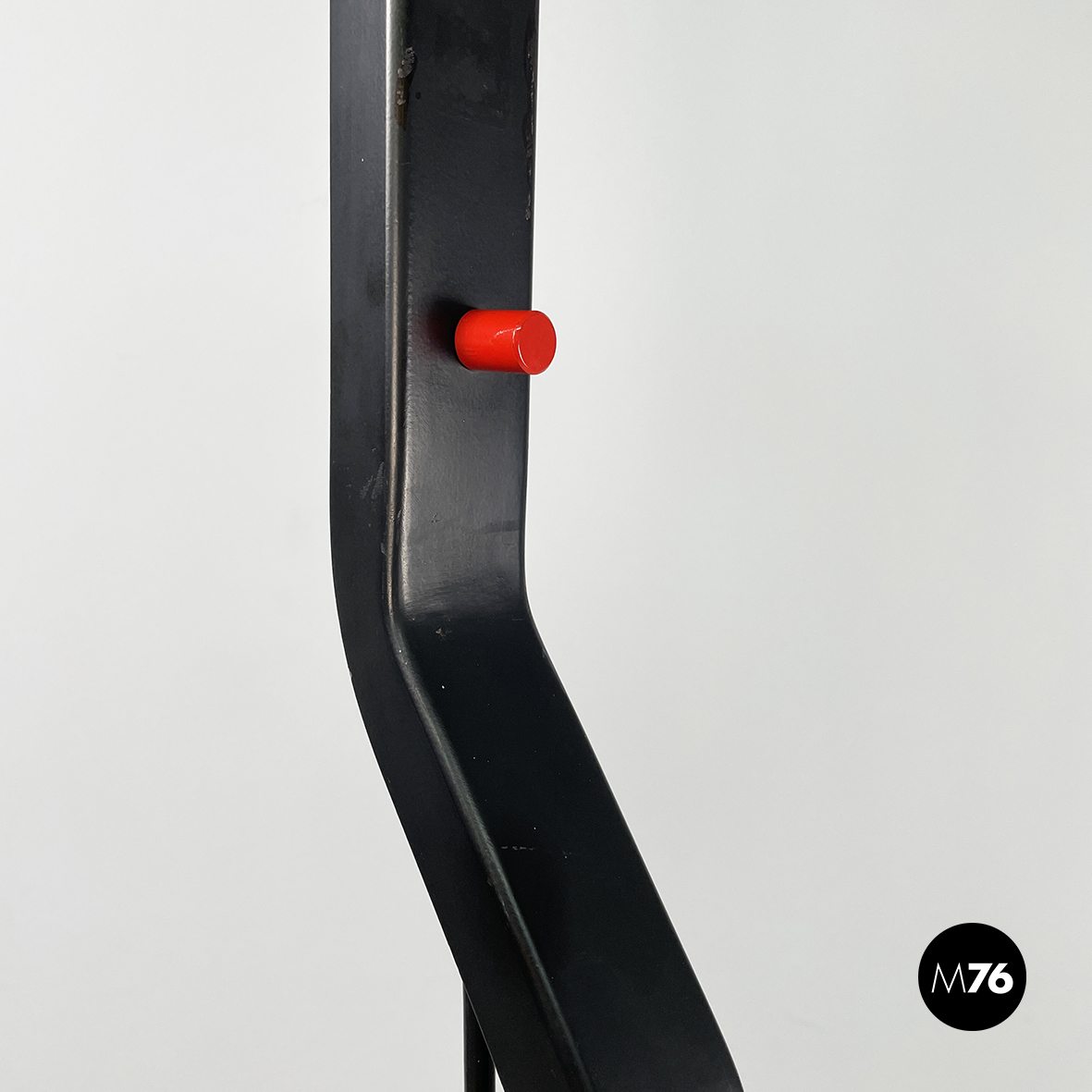 Lampada da terra modello Sirio con diffusore orientabile, interamente in metallo nero. La struttura centrale è composta da una lamina in metallo incurvata a C. Al centro della struttura è presente l’interruttore dimmerabile cilindrico e rosso. La base è composta da tre zampe.