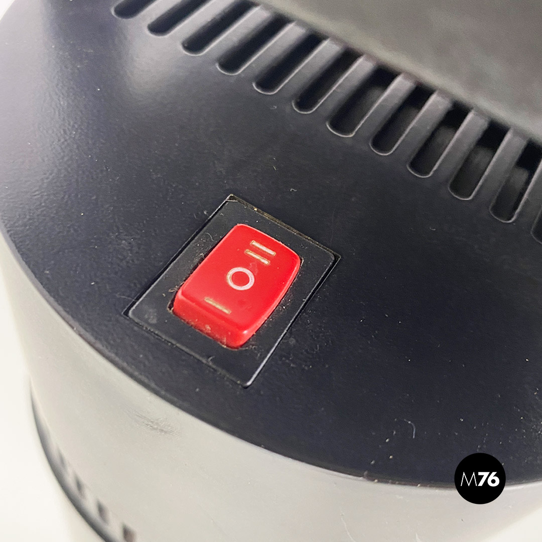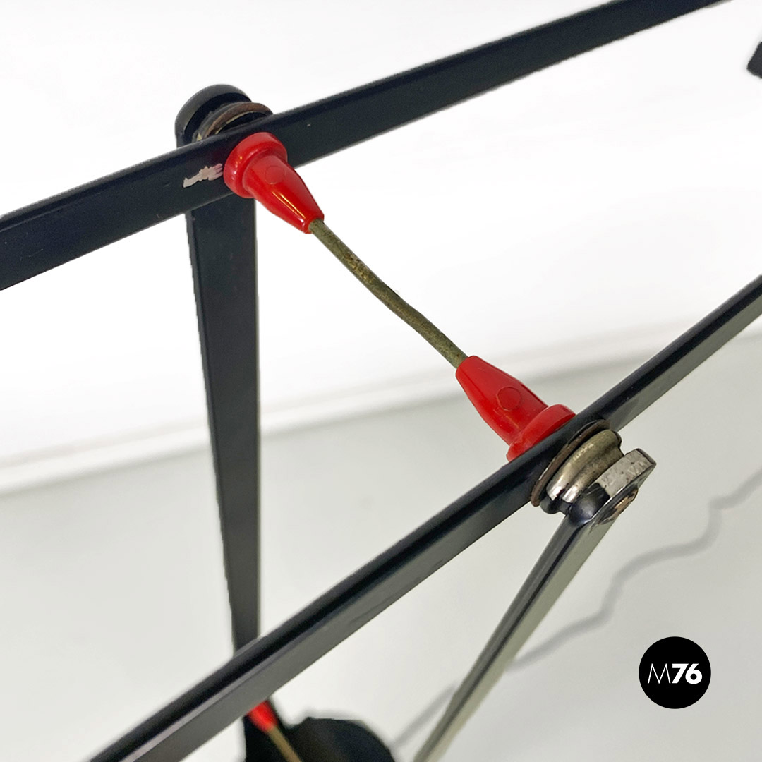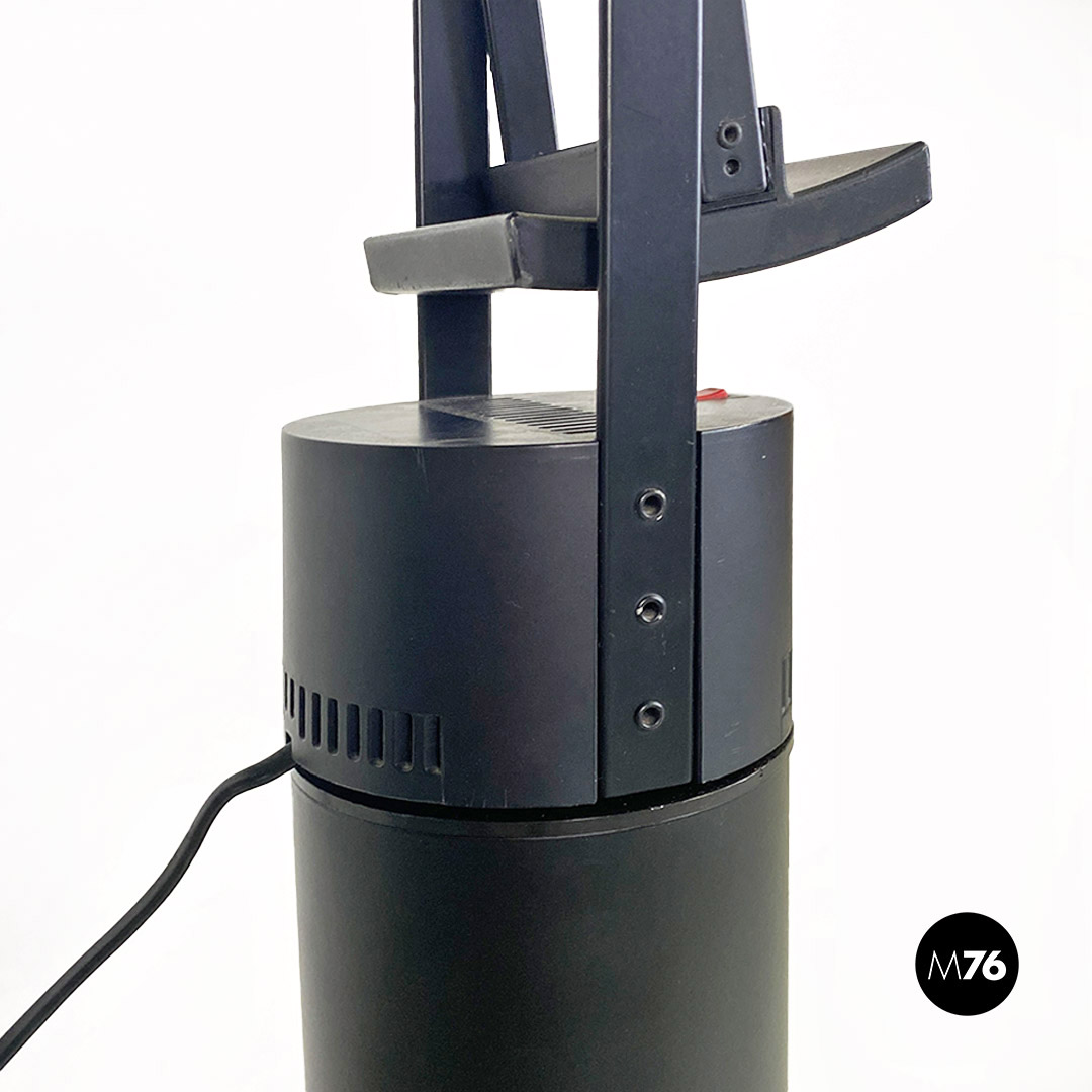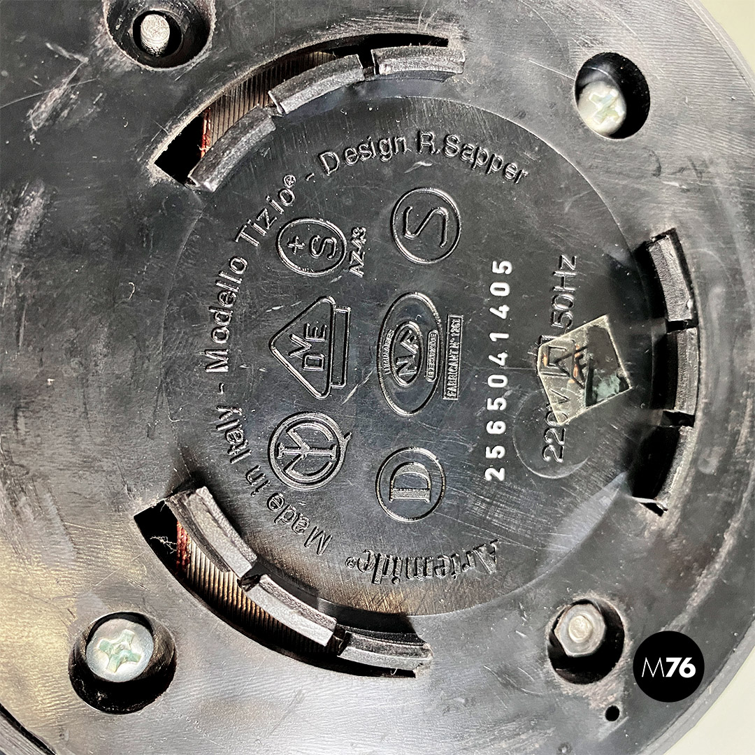 Lampada da terra modello Tizio, con struttura in metallo verniciato nero, con piccoli dettagli rossi, costituita da una base e braccia a due coppie di listelli paralleli, che permettono un’ampia serie di posizioni. In questo modello la base della lampada è provvista di alcune linguette in plastica che consentono alla struttura di agganciarsi al basamento cilindrico a colonna sottostante. La stabilità di queste posizioni è determinata da contrappesi in metallo nero fissati alle estremità dei bracci. Diffusore orientabile con lampada alogena, alimentata da una corrente continua che passa attraverso i bracci metallici.