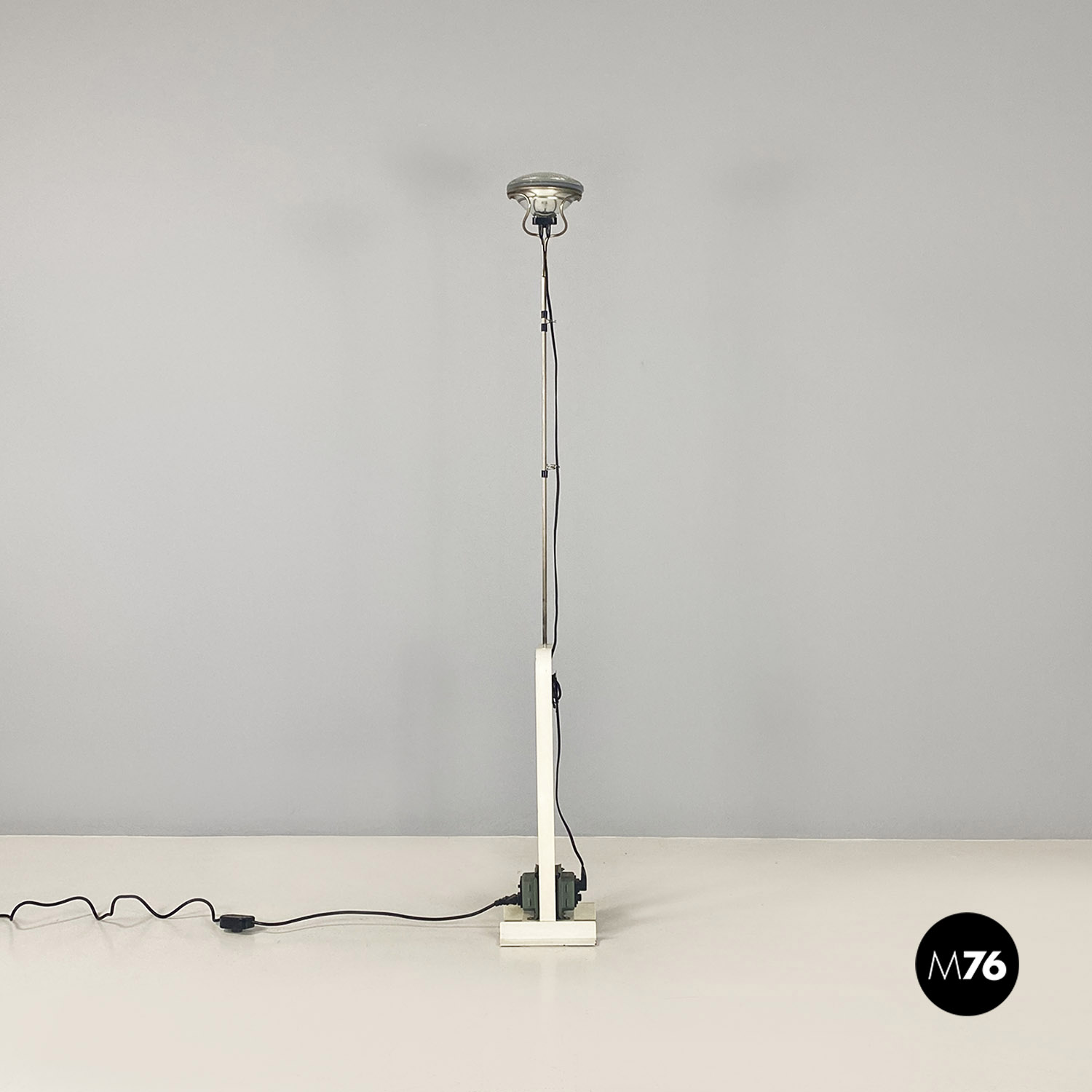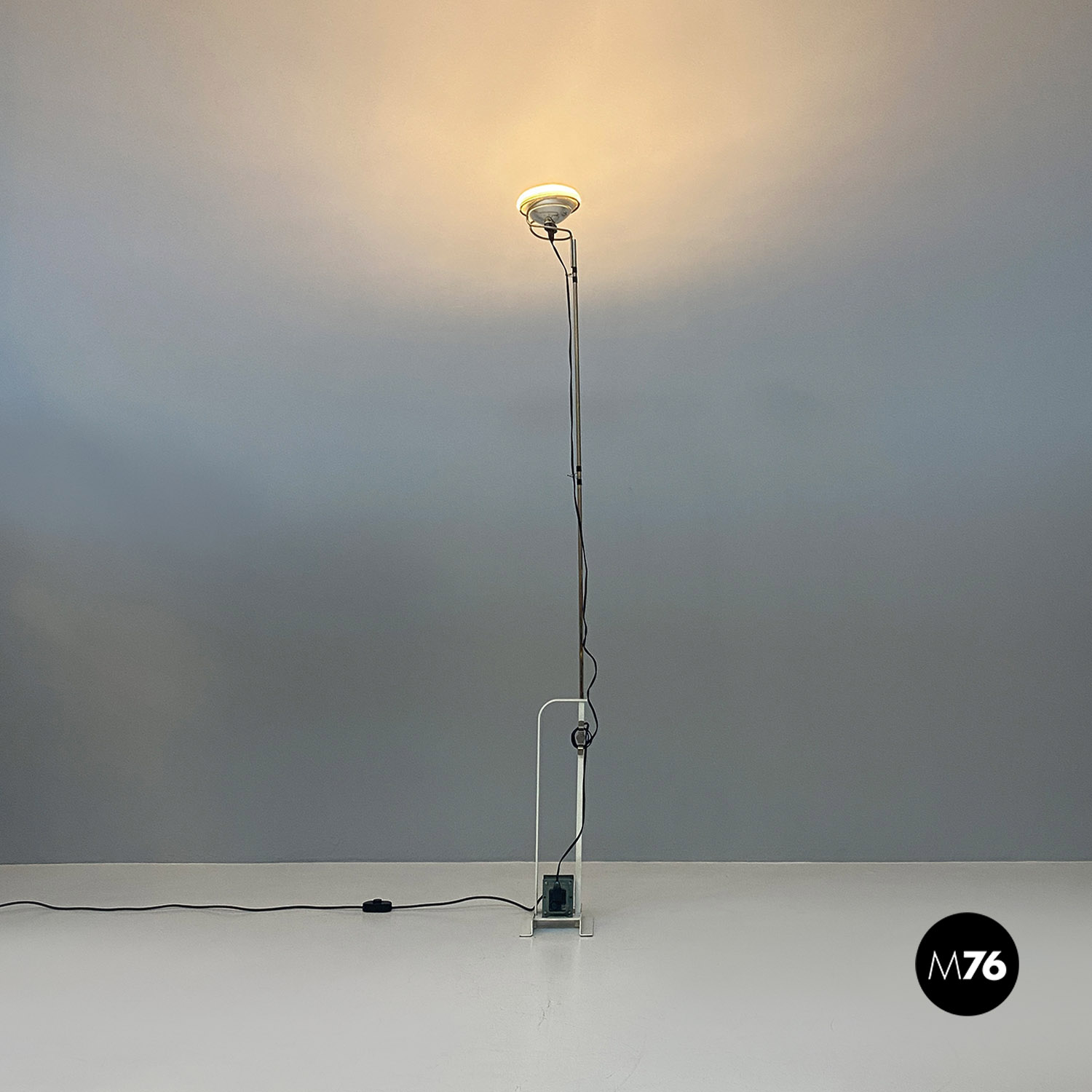 Lampada da terra modello Toio con diffusore a luce indiretta. La struttura è formata da una base in metallo verniciato bianco e uno stelo esagonale in metallo, che supporta il cavo elettrico e può essere regolato in altezza.