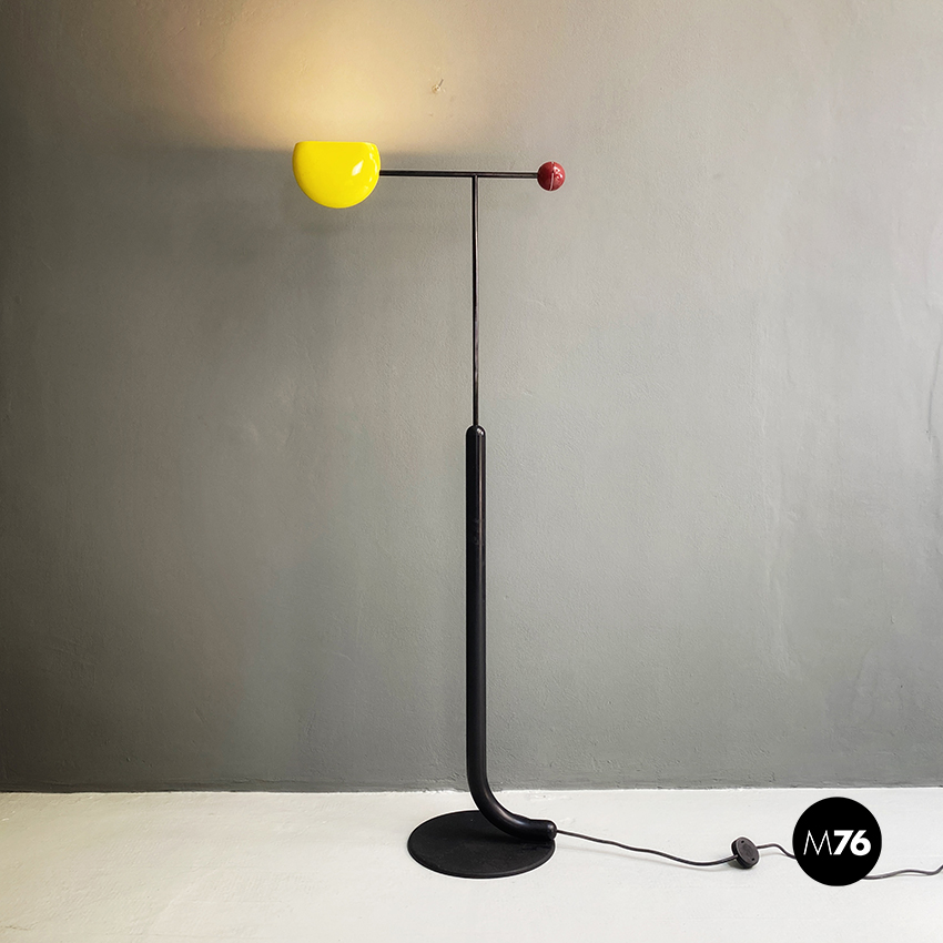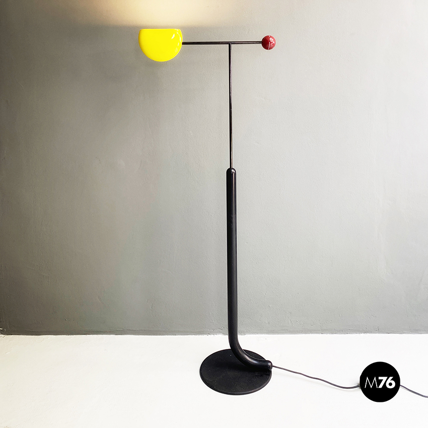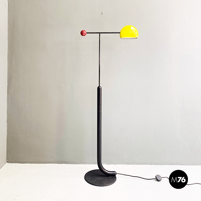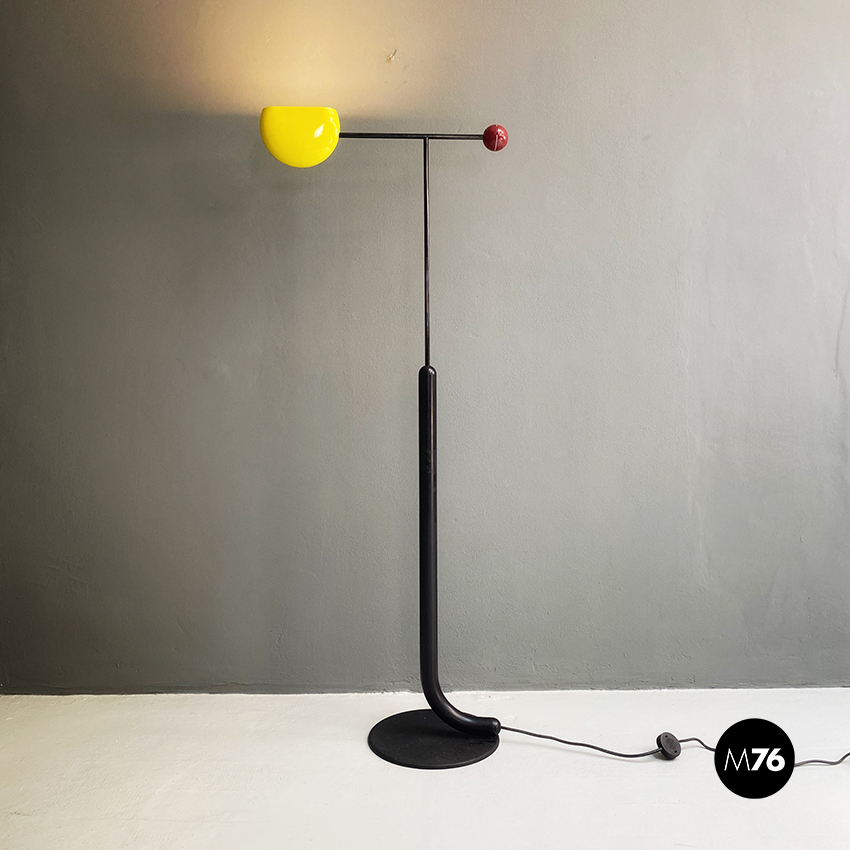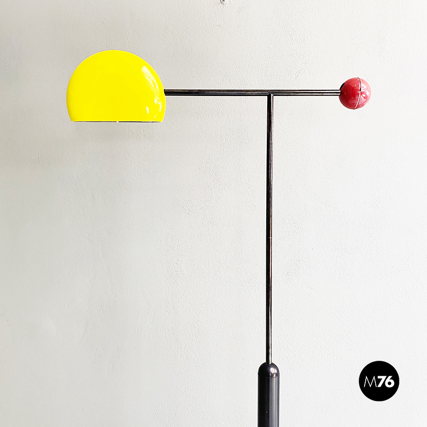 Lampada da terra modello Tomo a base tonda. Il paralume è in metallo giallo con una sfera di plastica rossa all’estremità del braccio girevole, la struttura è in metallo nero. Regolabile in altezza e orientabile in tutte le direzioni. Lampadina alogena di massimo 500 W con dimmer.