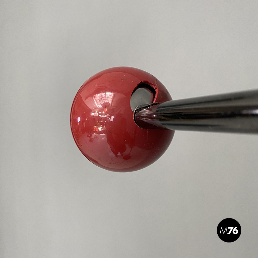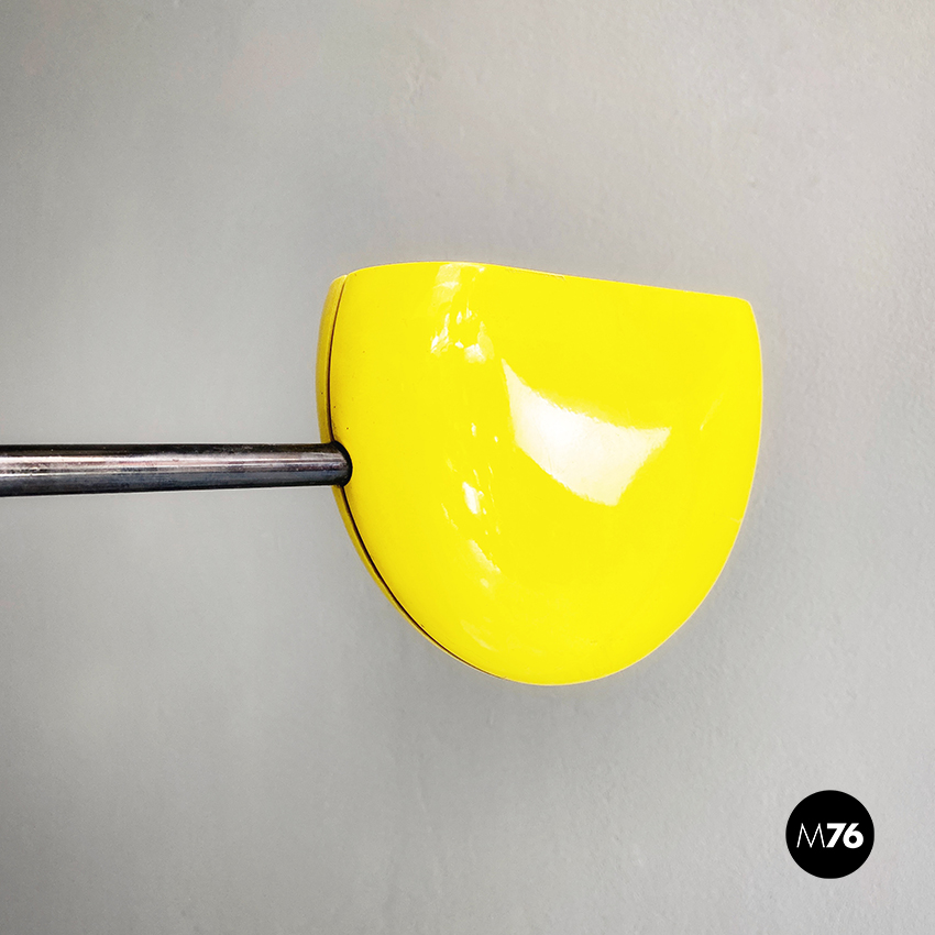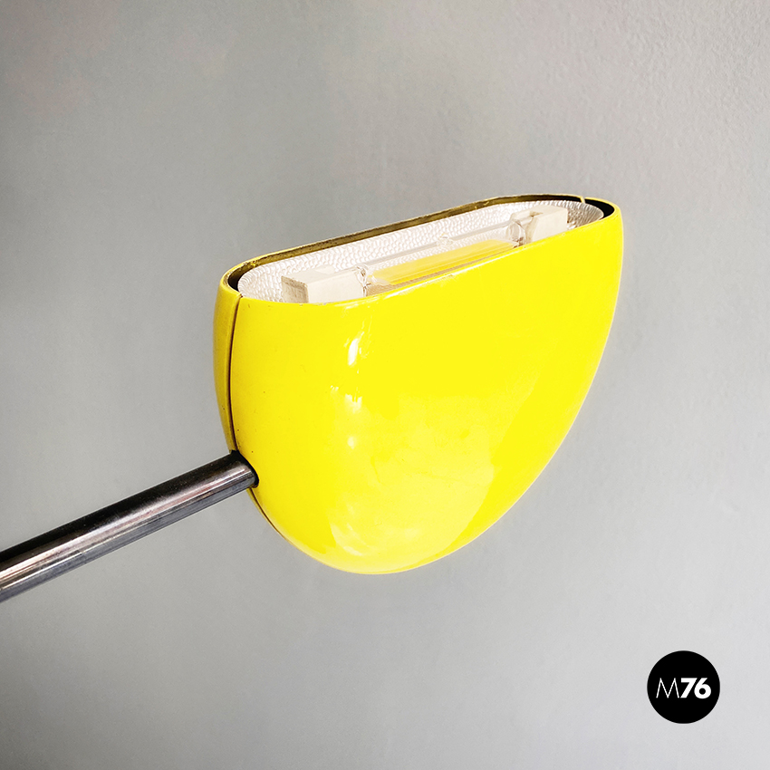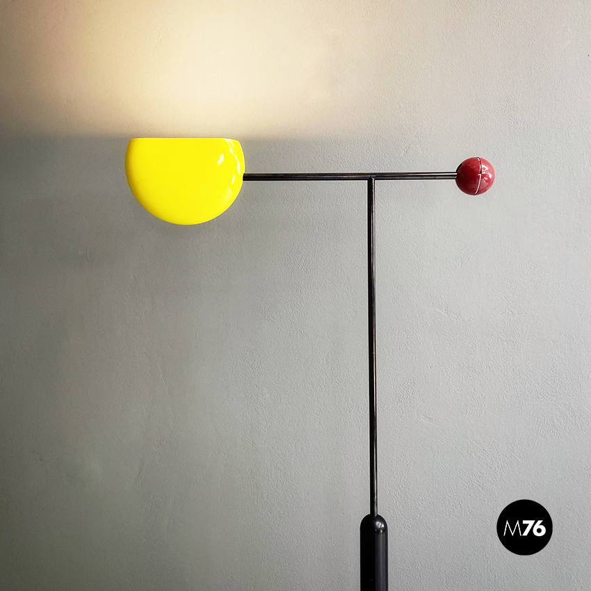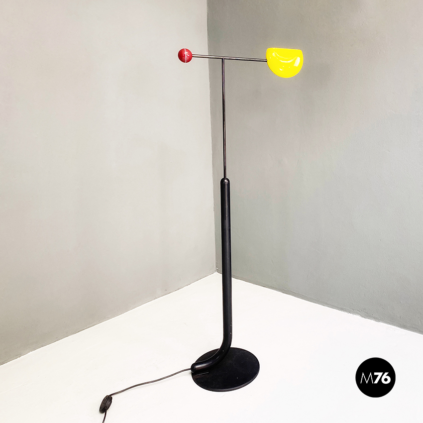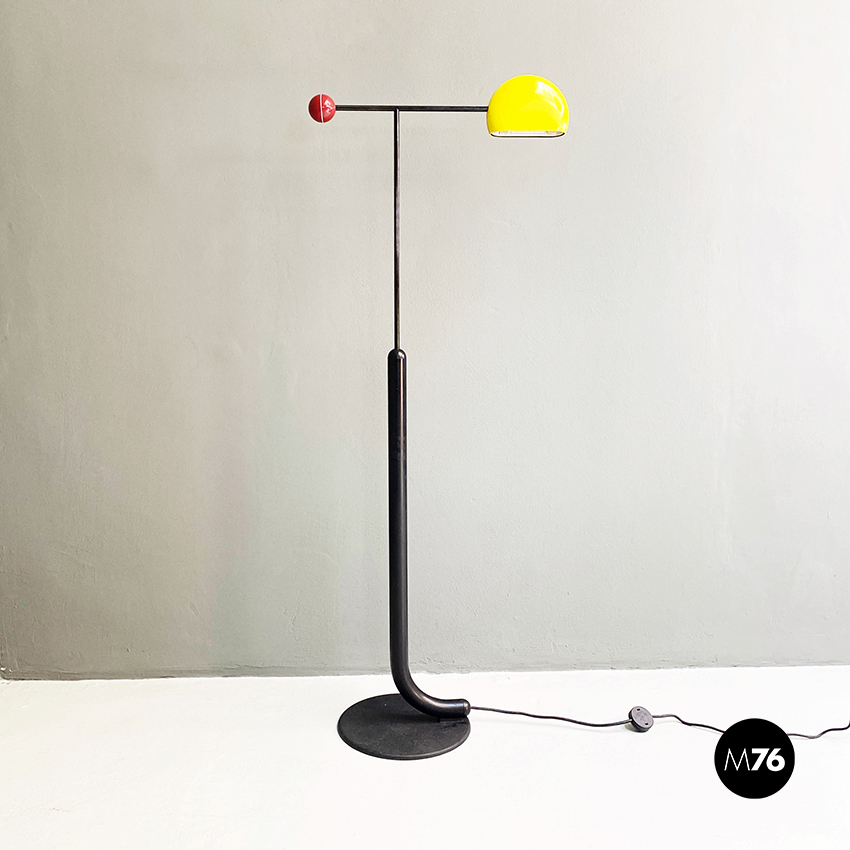 Lampada da terra modello Tomo a base tonda. Il paralume è in metallo giallo con una sfera di plastica rossa all’estremità del braccio girevole, la struttura è in metallo nero. Regolabile in altezza e orientabile in tutte le direzioni. Lampadina alogena di massimo 500 W con dimmer.