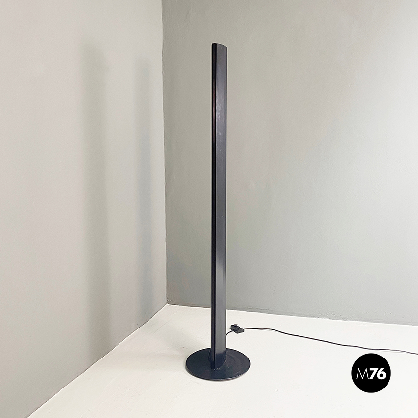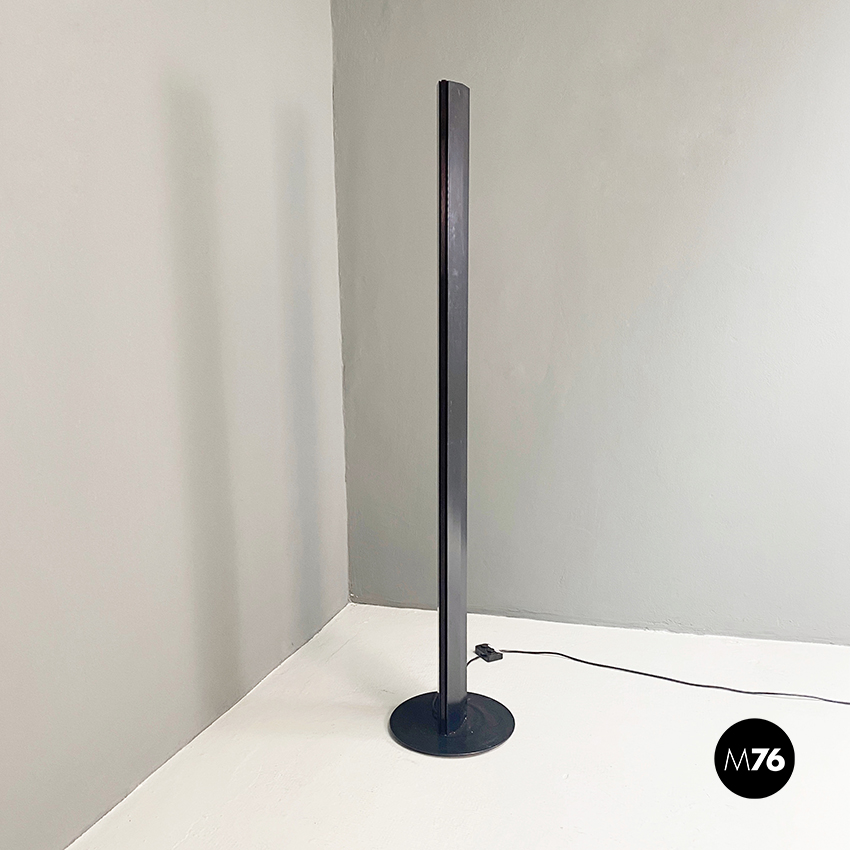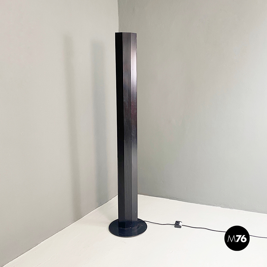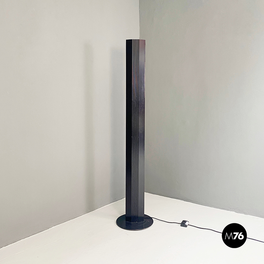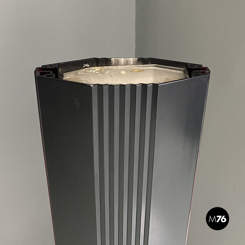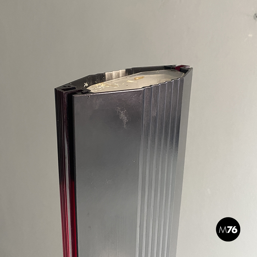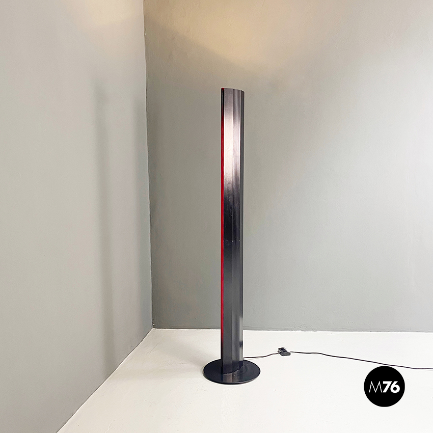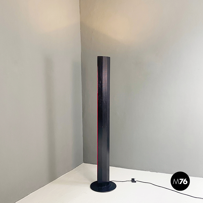 Lampada da terra totem con base e struttura in metallo verniciato nero e profili in plastica rossa. Presente una doppia illuminazione che prevede quella del bulbo superiore e quella dei profili laterali.