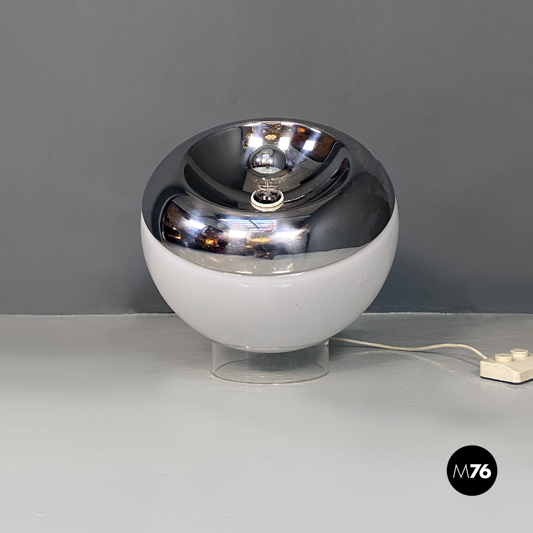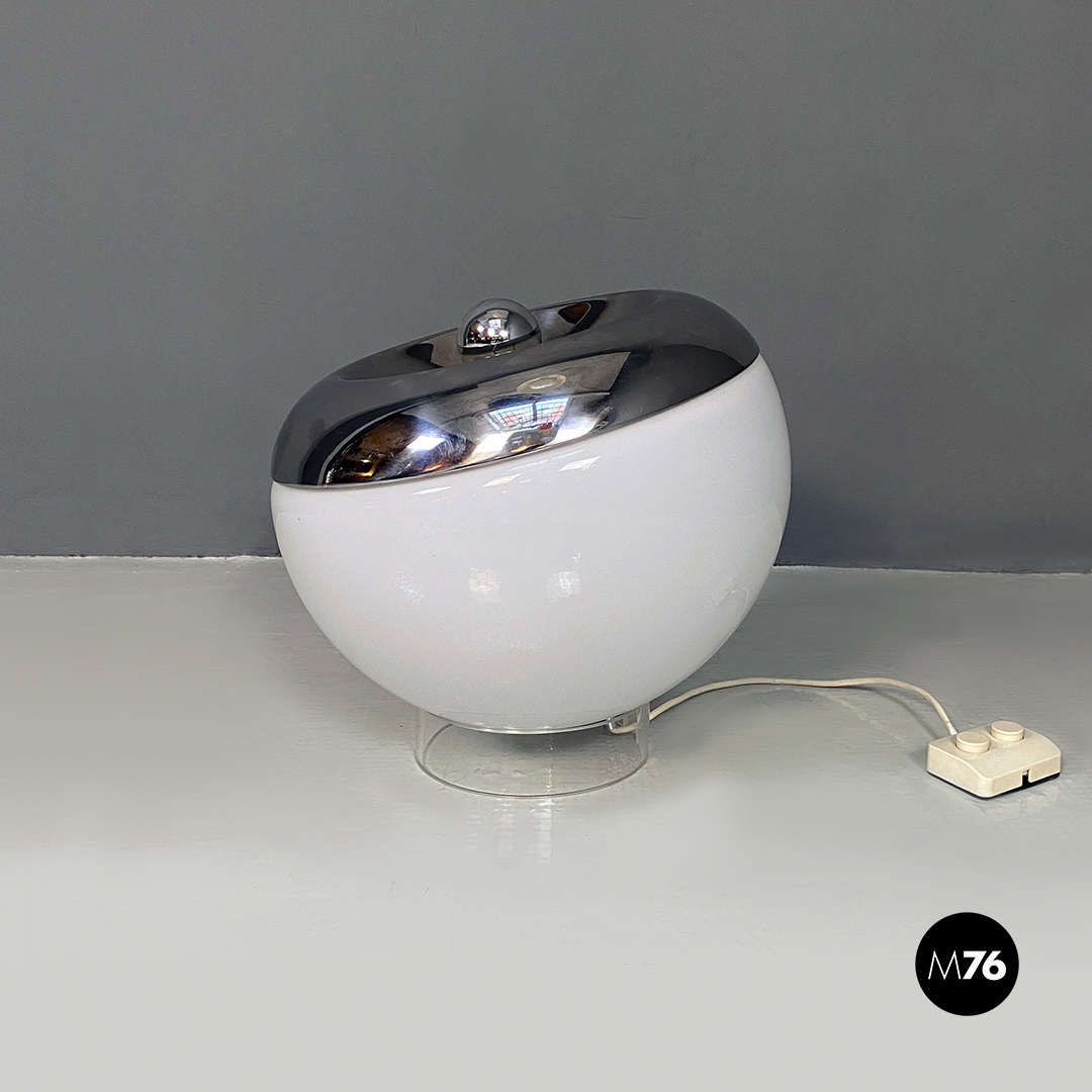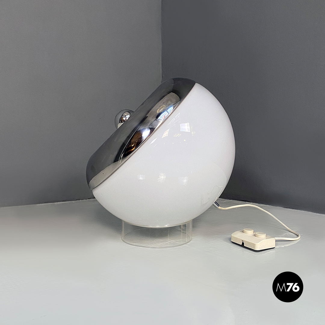 Lampada da tavolo orientabile in vetro opalino e metallo cromato.