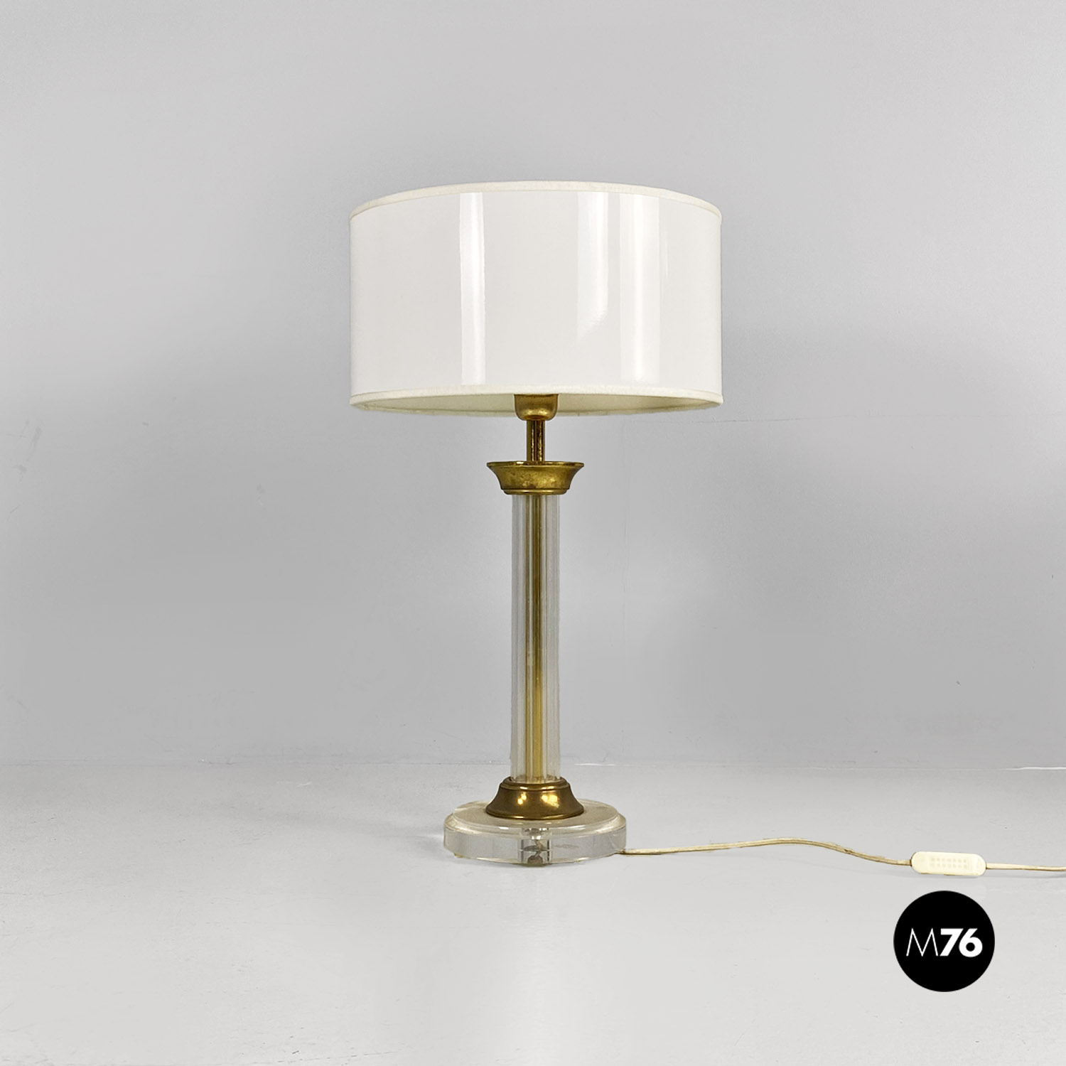Lampada da tavolo con base a colonna in plexiglass trasparente e dettagli in ottone nuovo paralume bianco lucido.