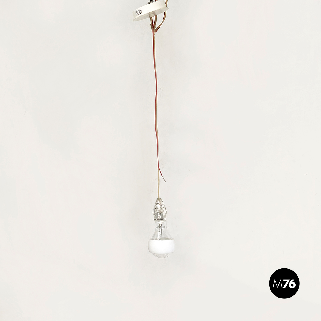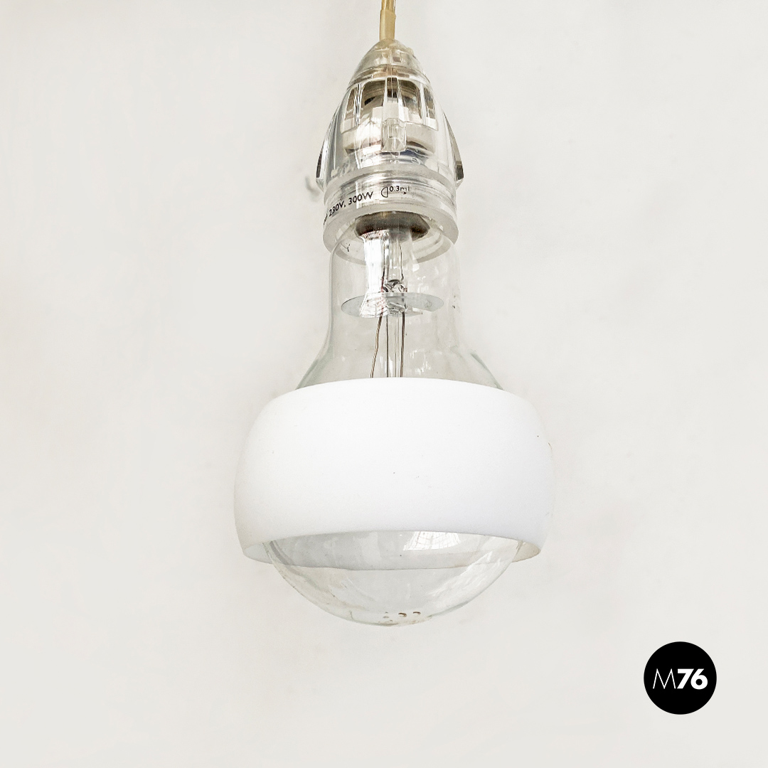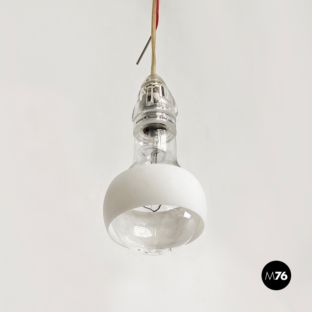 Lampada a sospensione modello Johnny B. Good con porta lampada in vetro a forma di lampadina e attacco in vetro, in parte bianco opalino e in parte trasparente.