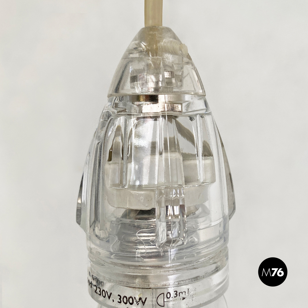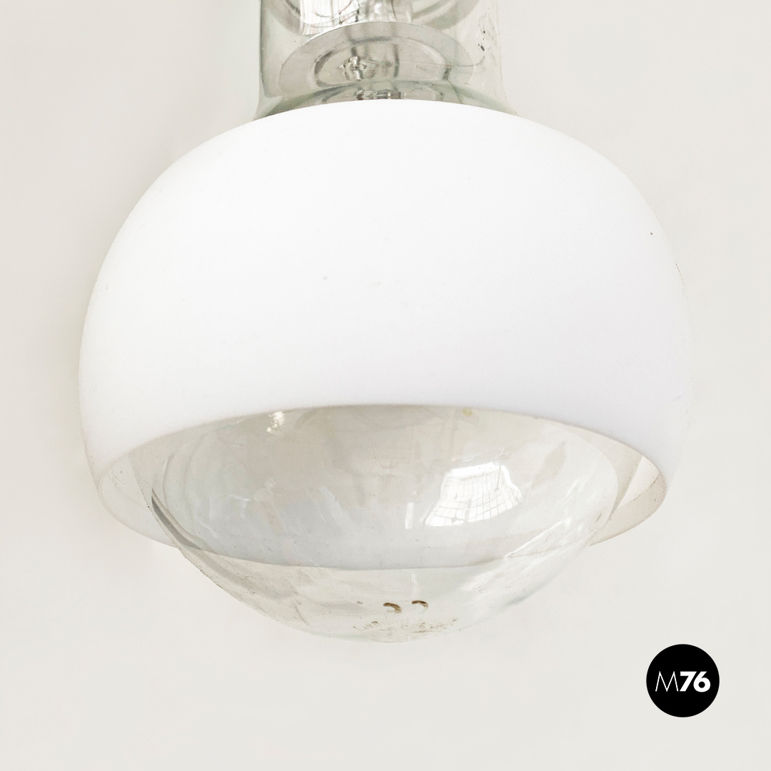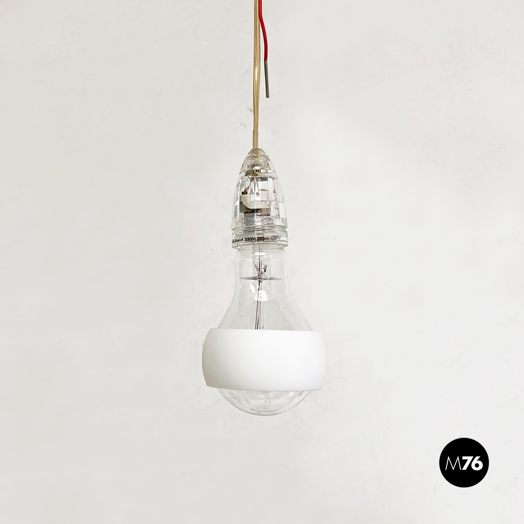 Lampada a sospensione modello Johnny B. Good con porta lampada in vetro a forma di lampadina e attacco in vetro, in parte bianco opalino e in parte trasparente.