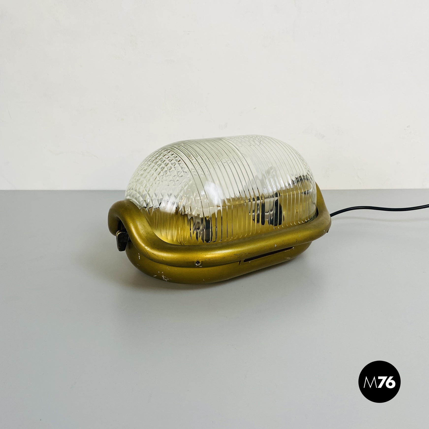 Lampada modello Walnut, dalla forma arrotondata, il corpo è in alluminio presso fuso di grande spessore e verniciato in giallo ocra, il diffusore è in vetro pressato trasparente. Caratteristica è la sospensione delle prese, queste si trovano su un asse mobile che può essere regolato tramite una manopola esterna, in questo modo, l’angolo delle lampade riflettenti può essere regolato e la luce può essere allineata.