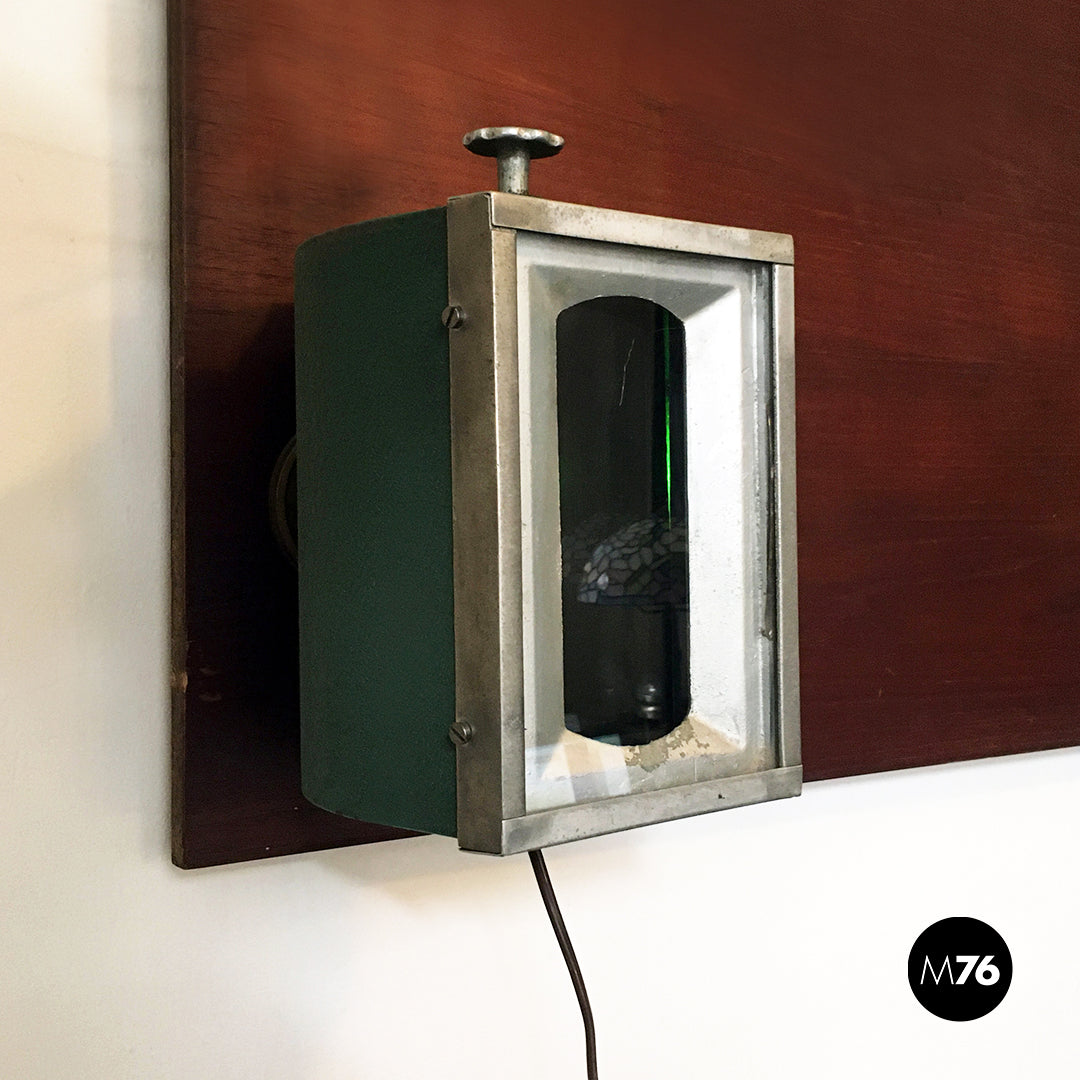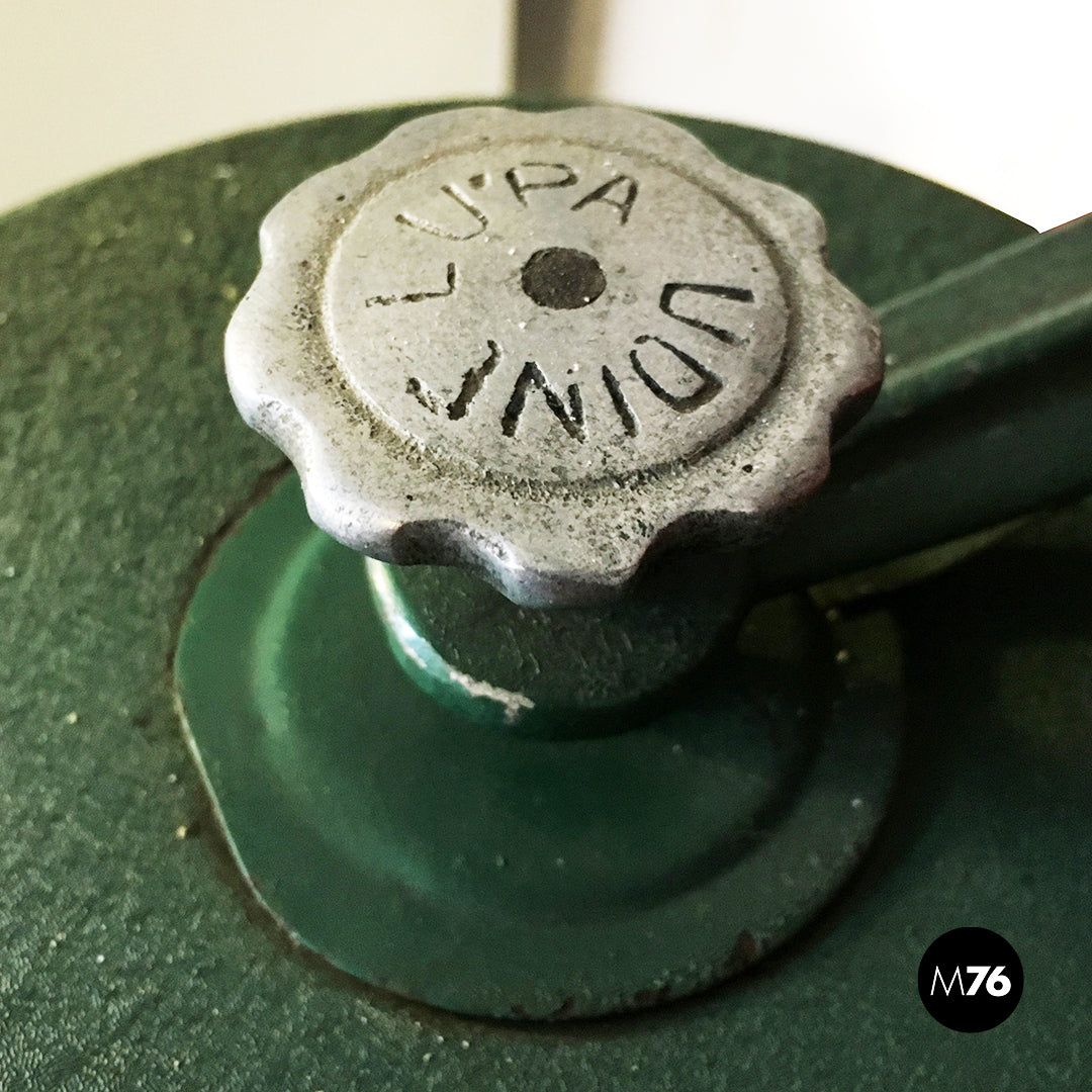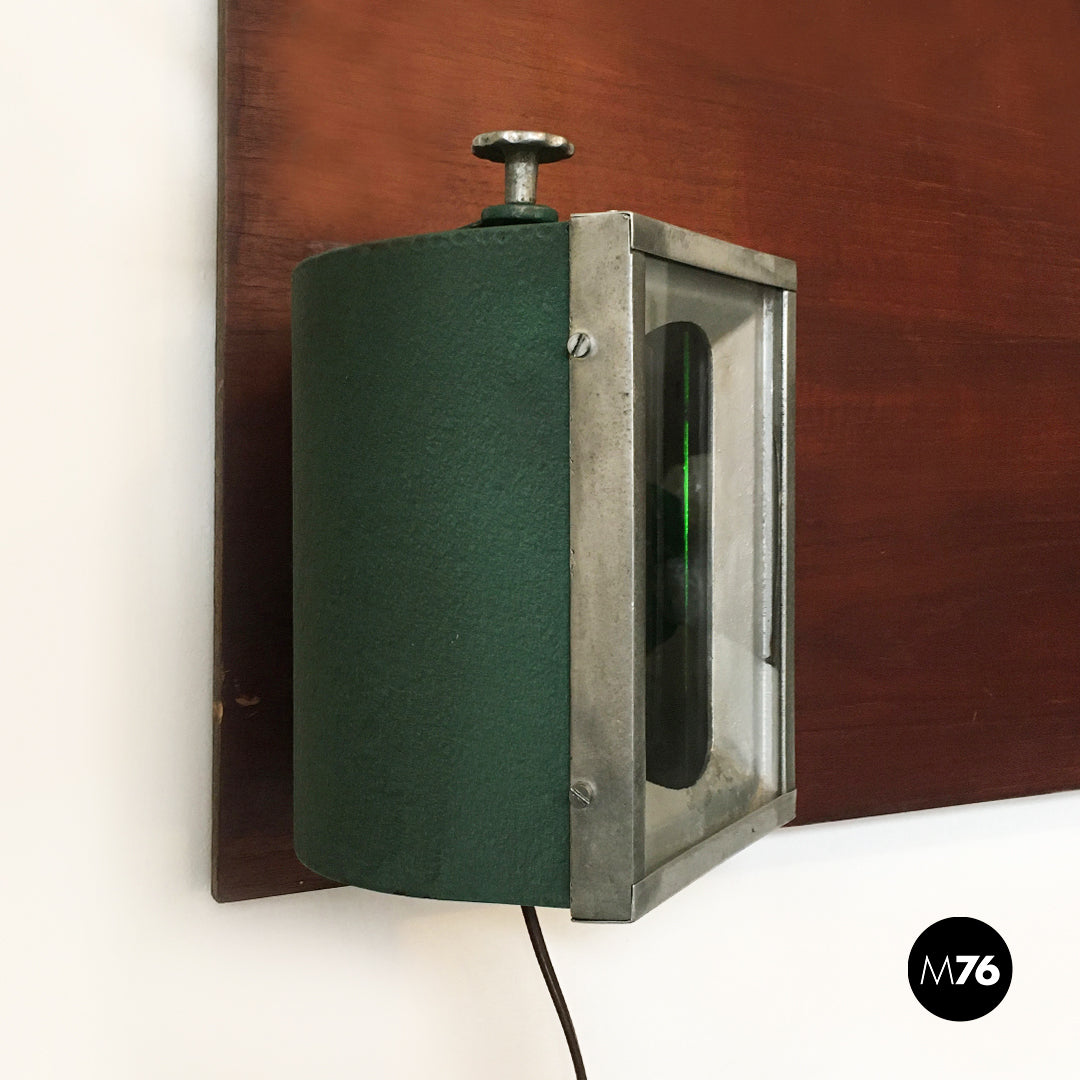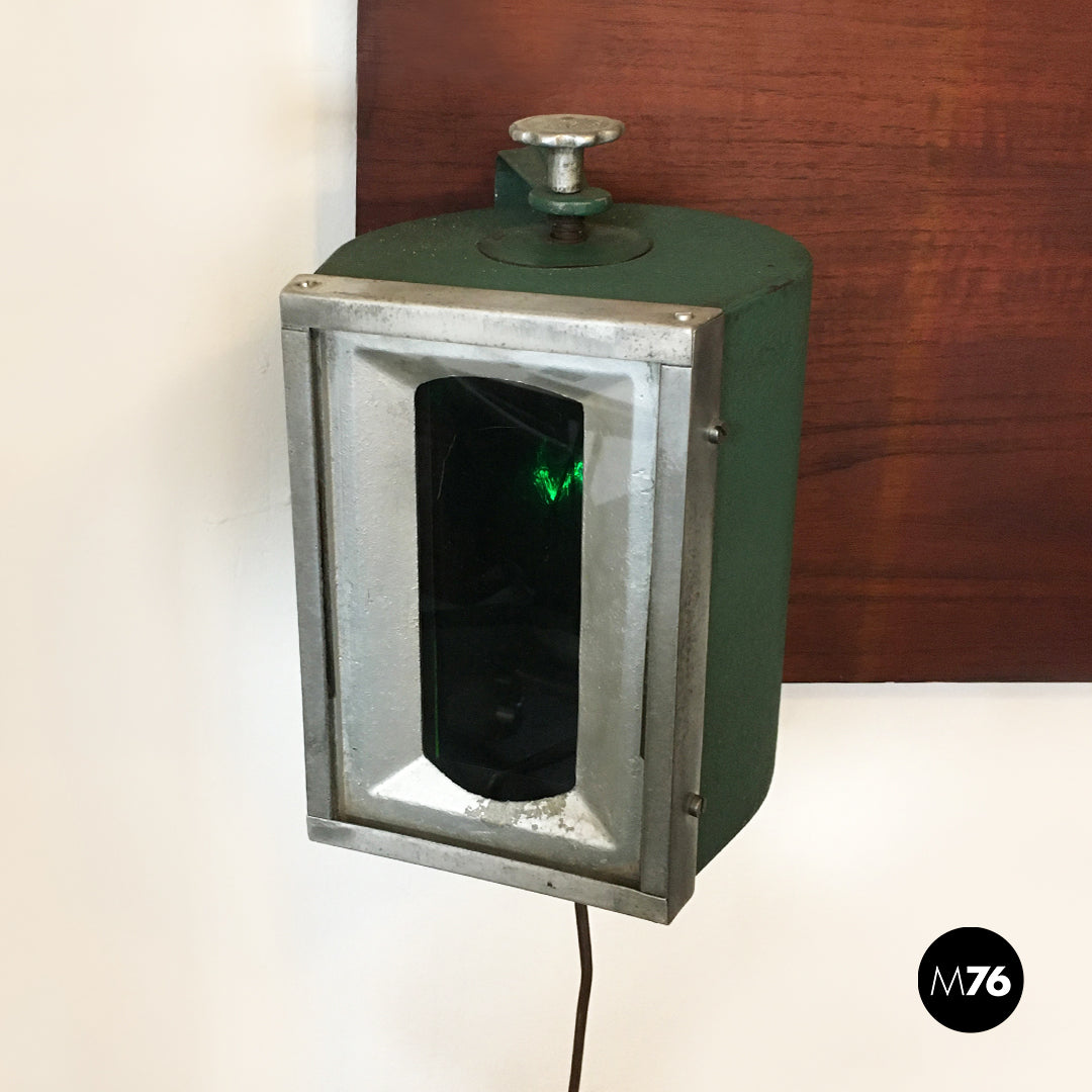 Lampada da fotografo per camera oscura con struttura verde militare e dettagli in alluminio nichelato.