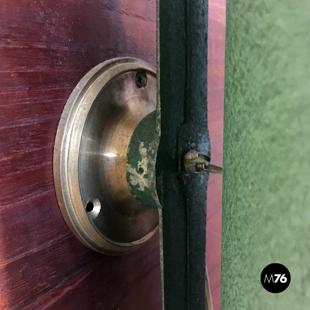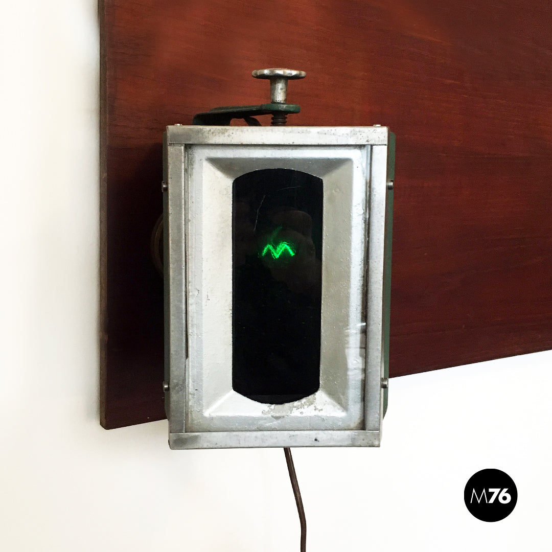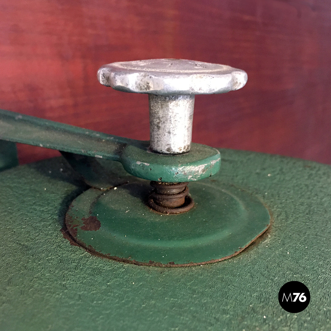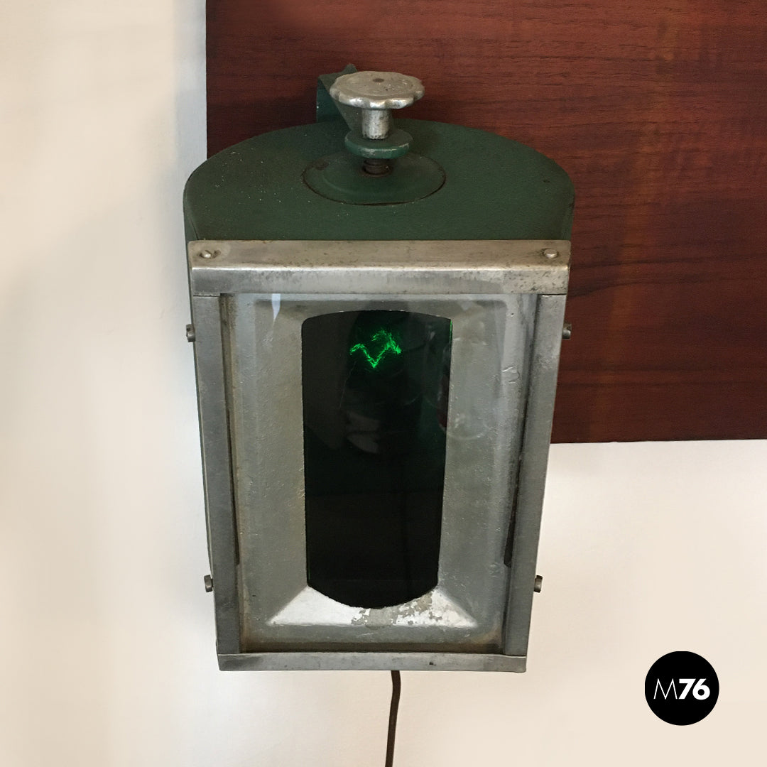 Lampada da fotografo per camera oscura con struttura verde militare e dettagli in alluminio nichelato.