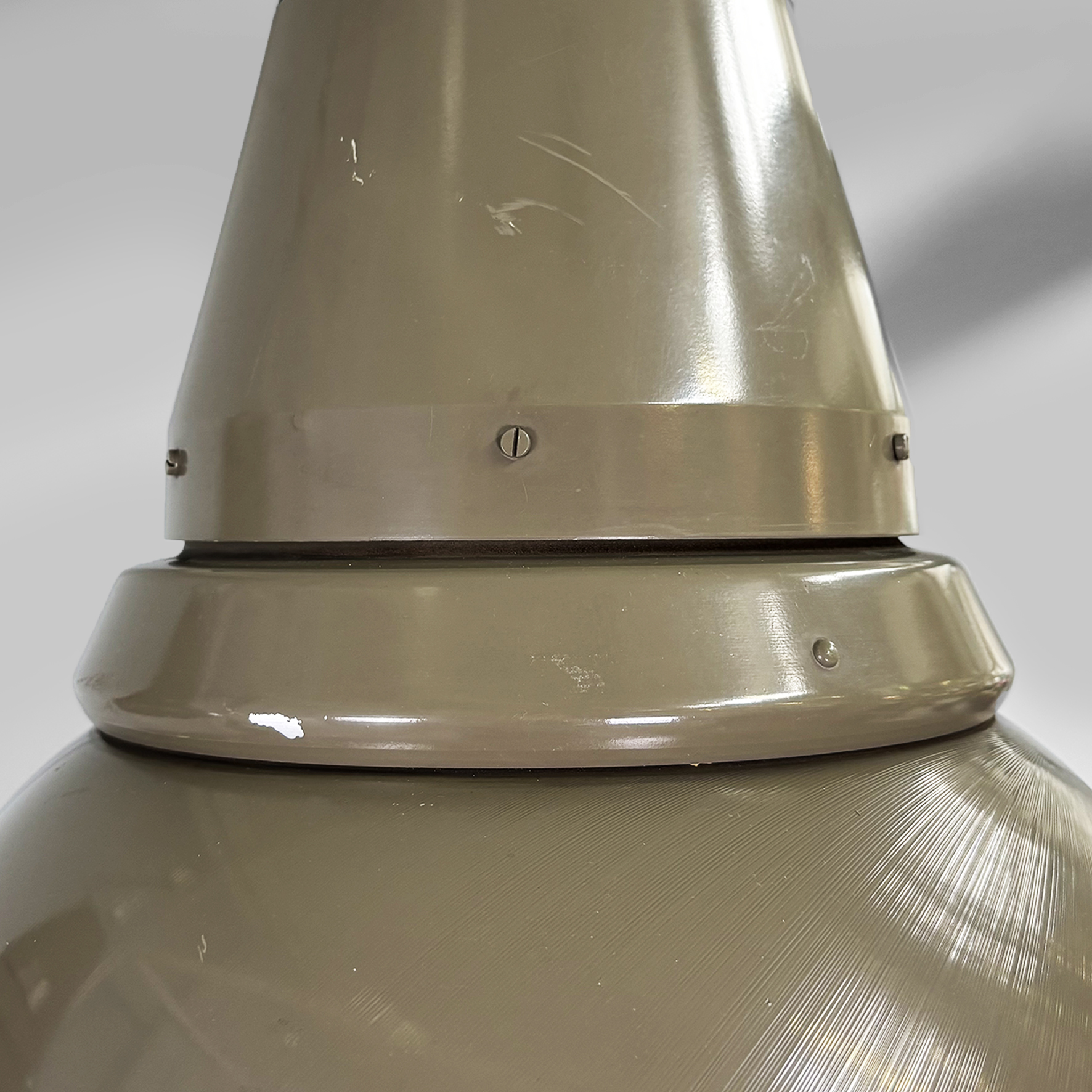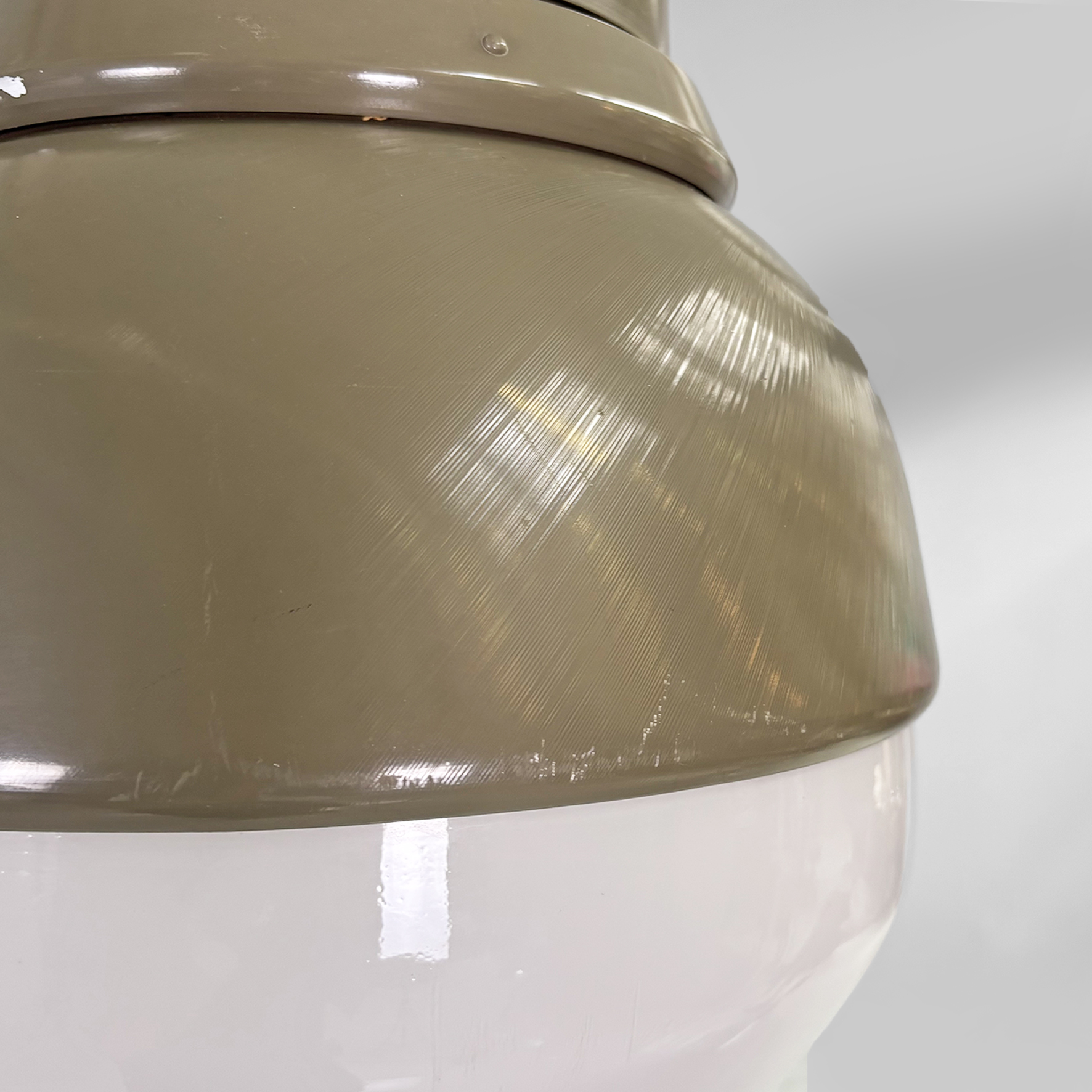 Coppia di lampadari modello Genova 4053 con diffusore tondeggiante in plexiglass bianco e metallo verniciato verde militare. La struttura a sezione tonda è anche essa in metallo verniciato verde militare. Attacco a soffitto cilindrico in metallo.