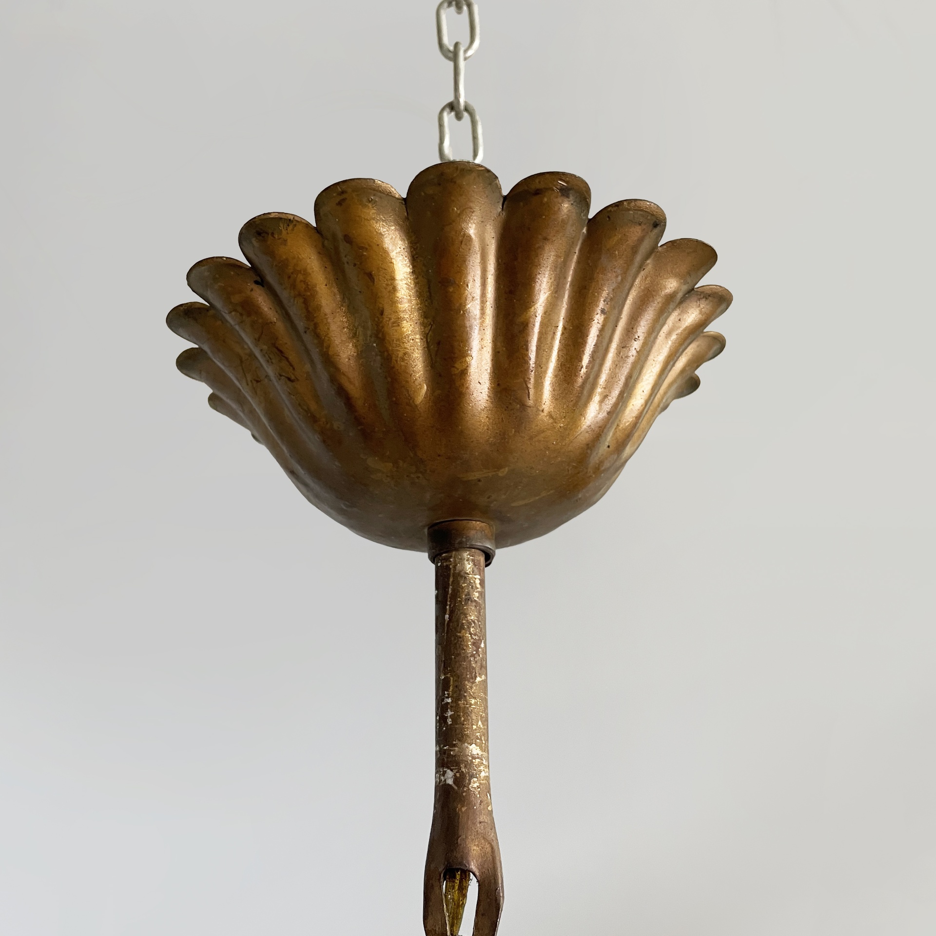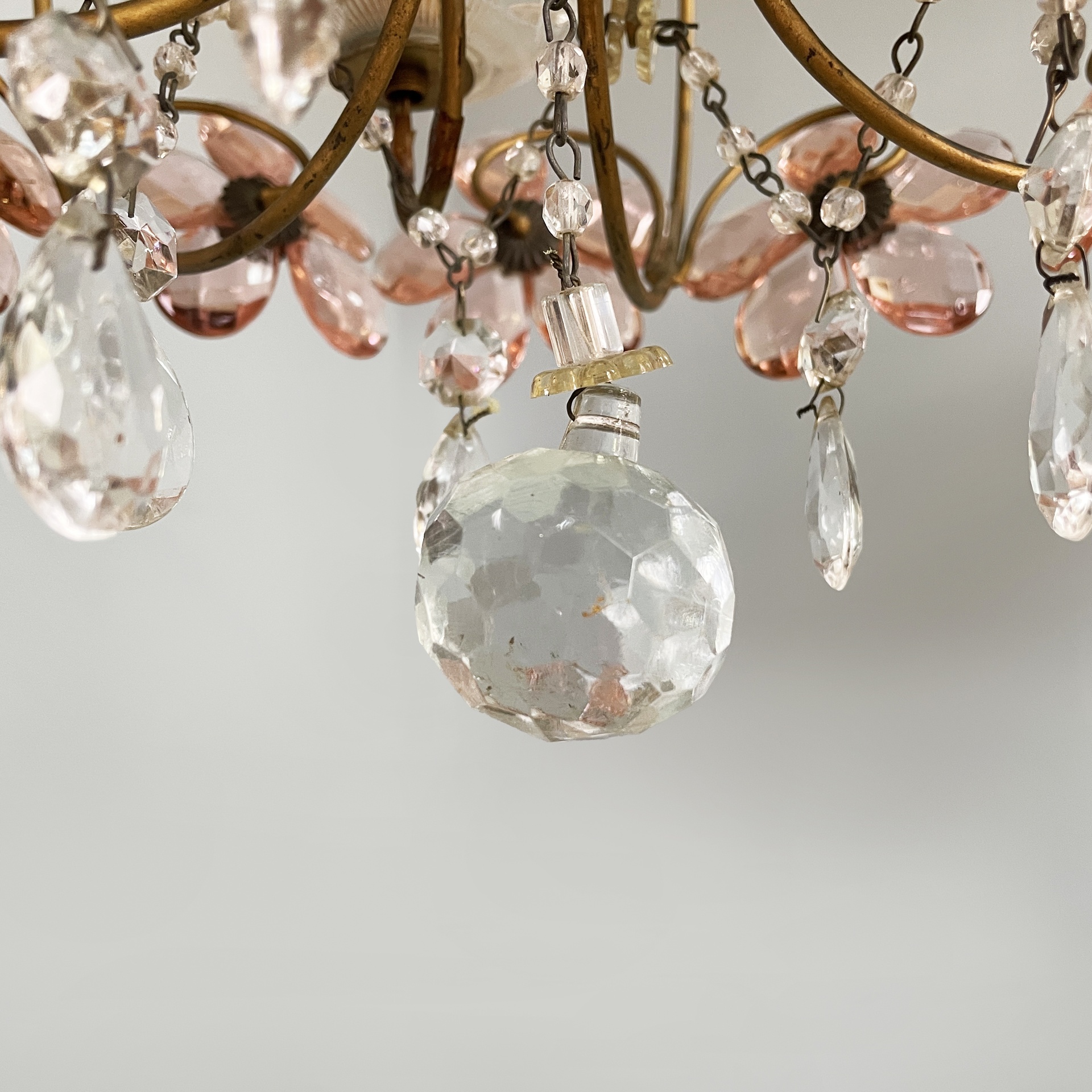 Coppia di lampadari a base tonda a tre luci. Sulla struttura in tondino di ottone sono presenti decorazioni a fiori in vetro di Murano rosa, uniti al centro da un elemento in ottone brunito anche esso a forma di fiore. Nella parte inferiore e superiore sono presenti vetri decorativi a forma di fiore, sferici e a goccia prendenti, uniti da catene in metallo. I portalampadina sono a forma di candela. L’attacco a soffitto a cupola con decoro a petali e la catena sono in ottone. Appartenente al periodo Art Nouveau.
