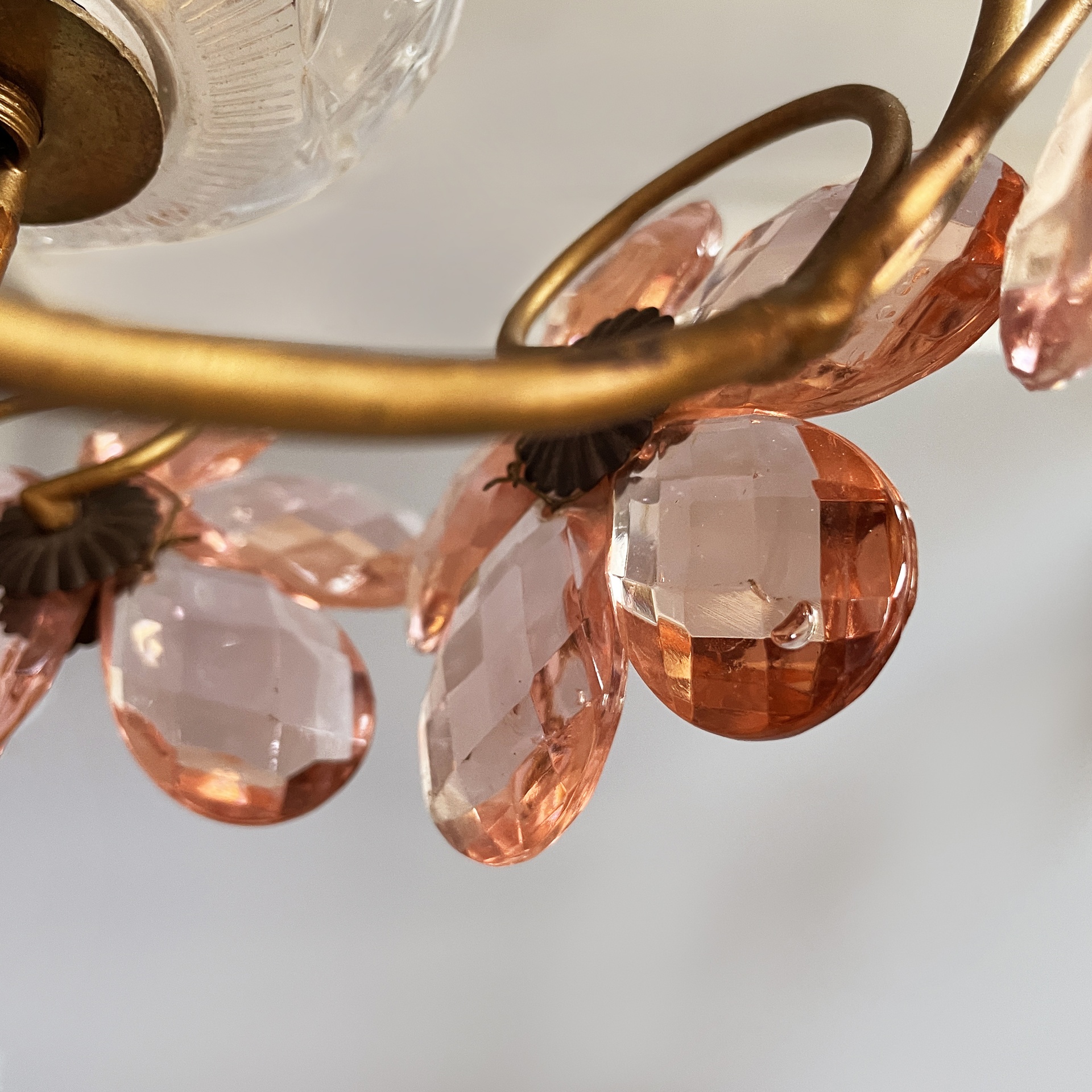 Lampadari in vetro rosa e ottone, inizio 1900 ca.