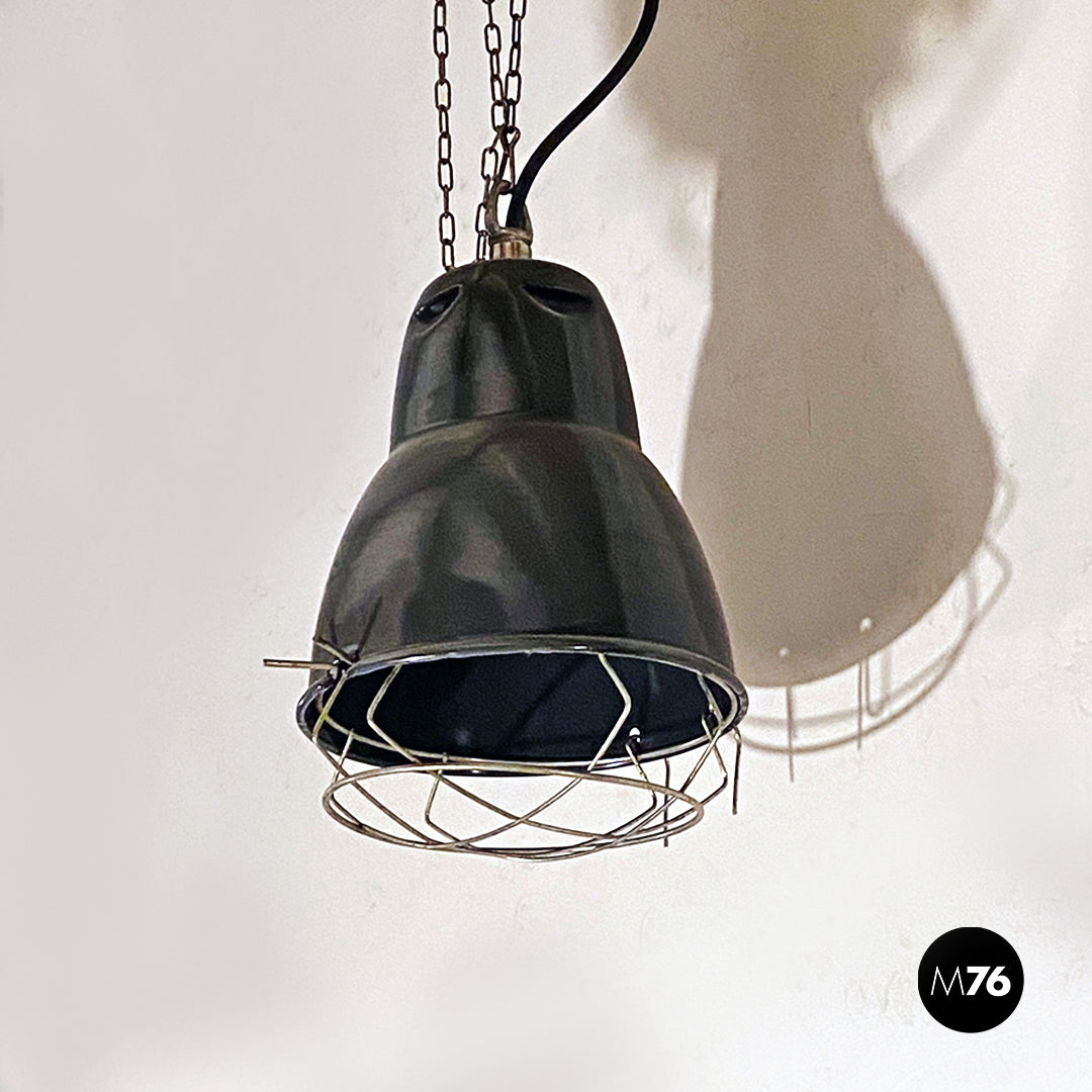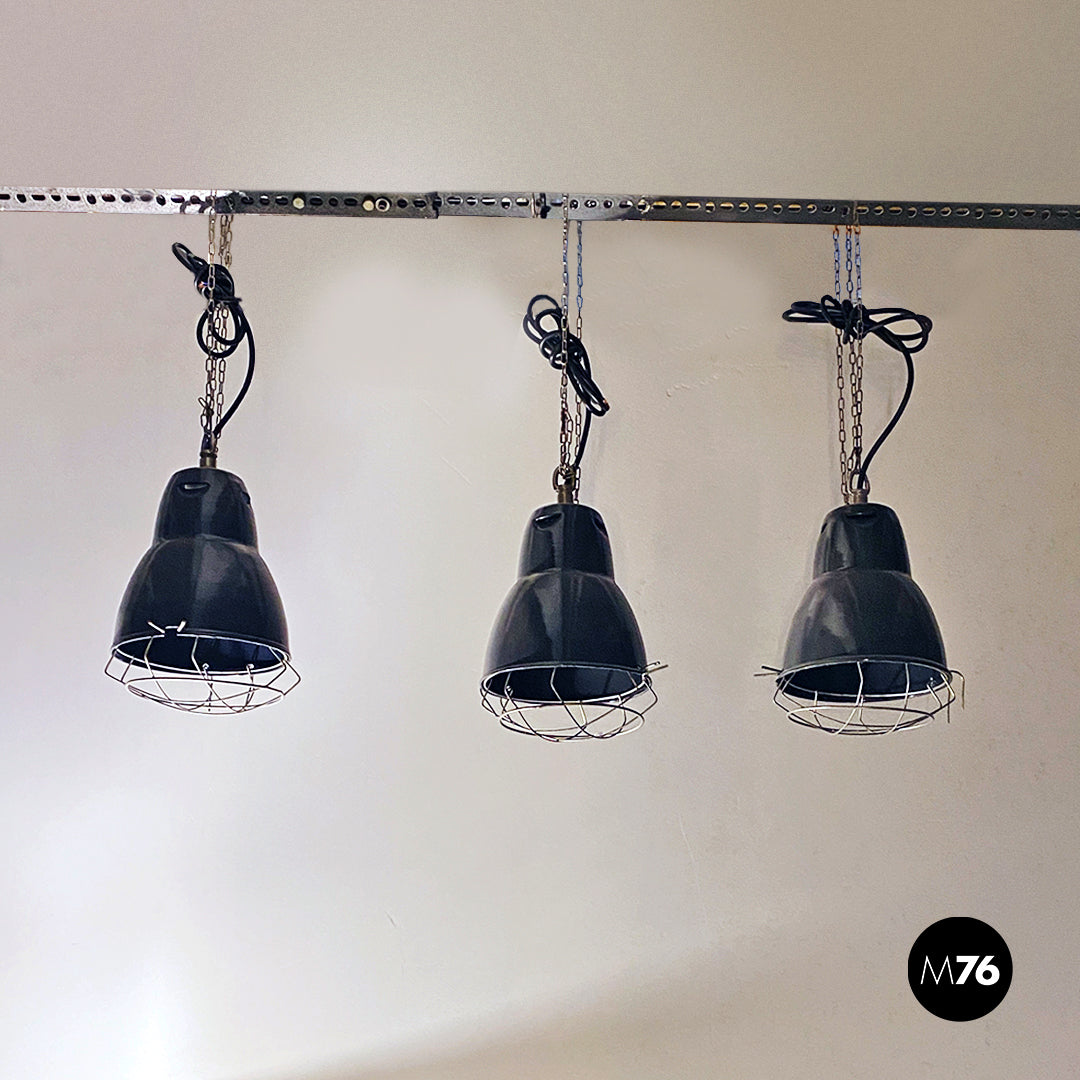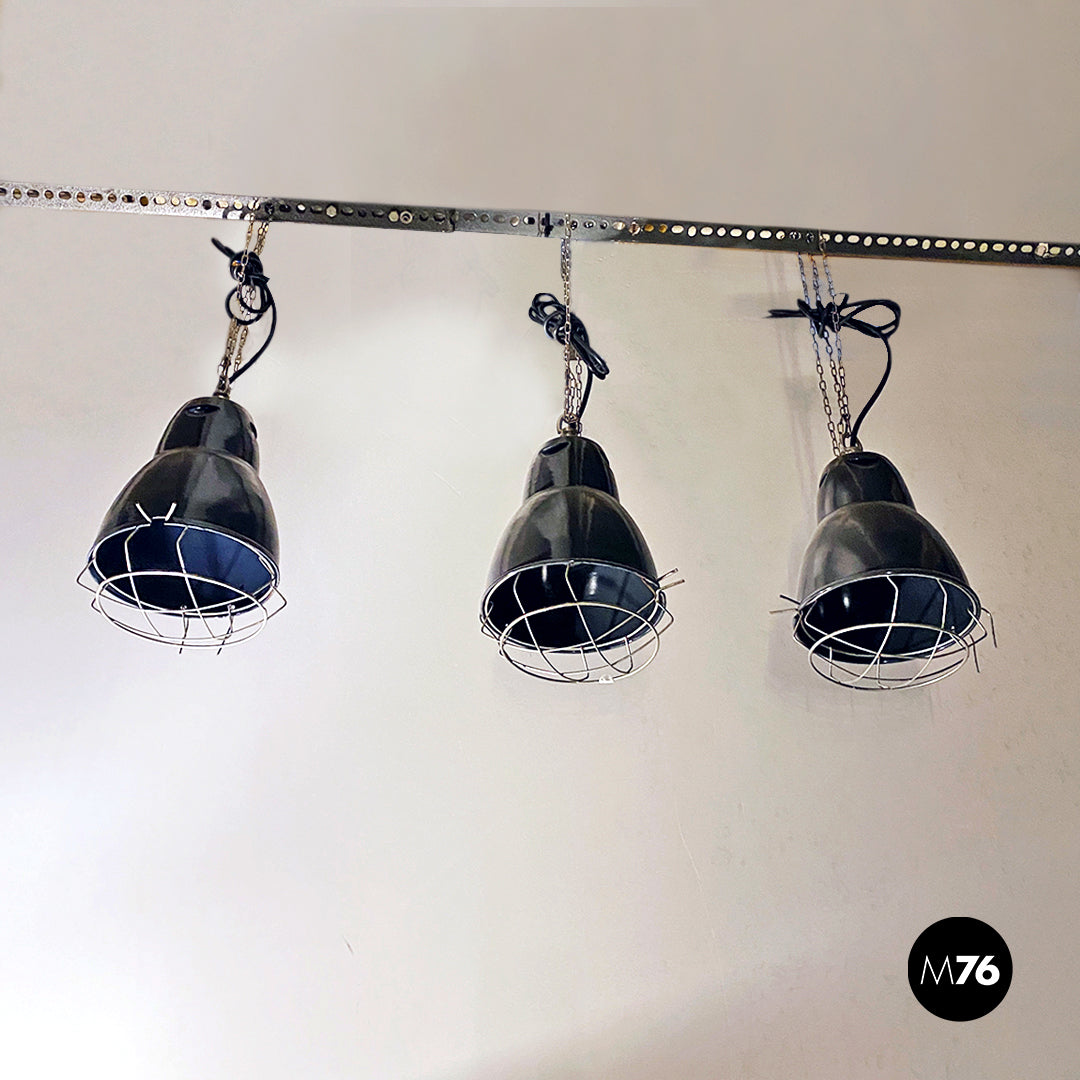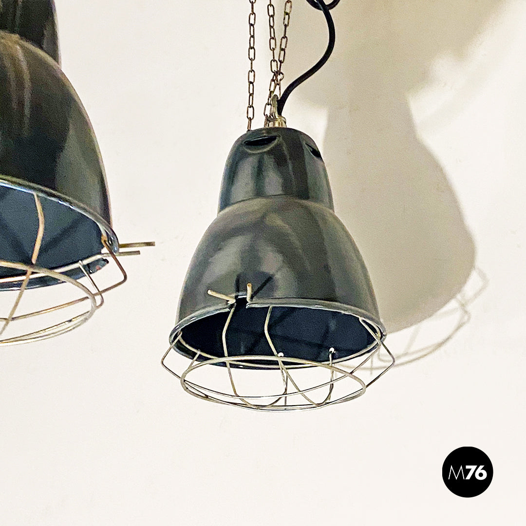 Tre lampadari industriali, in metallo smaltato grigio scuro con griglia metallica e catenina per la sospensione abbinata al lampadario.