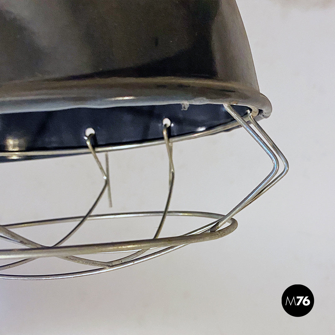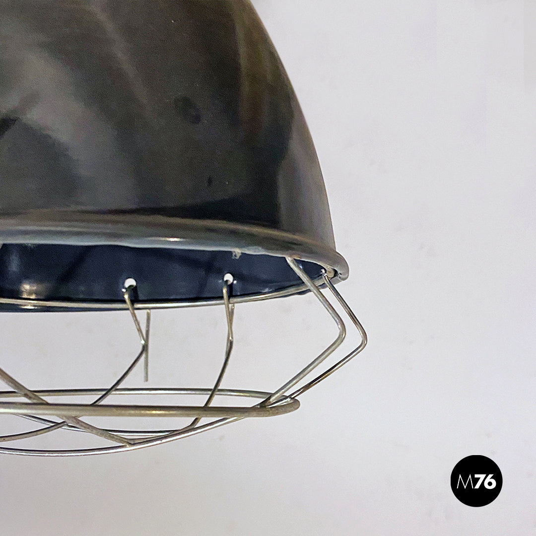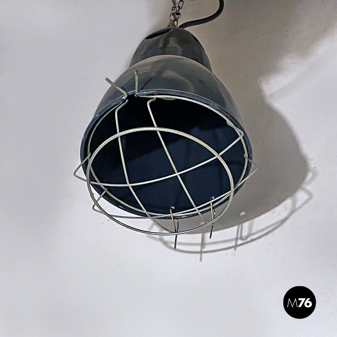 Tre lampadari industriali, in metallo smaltato grigio scuro con griglia metallica e catenina per la sospensione abbinata al lampadario.