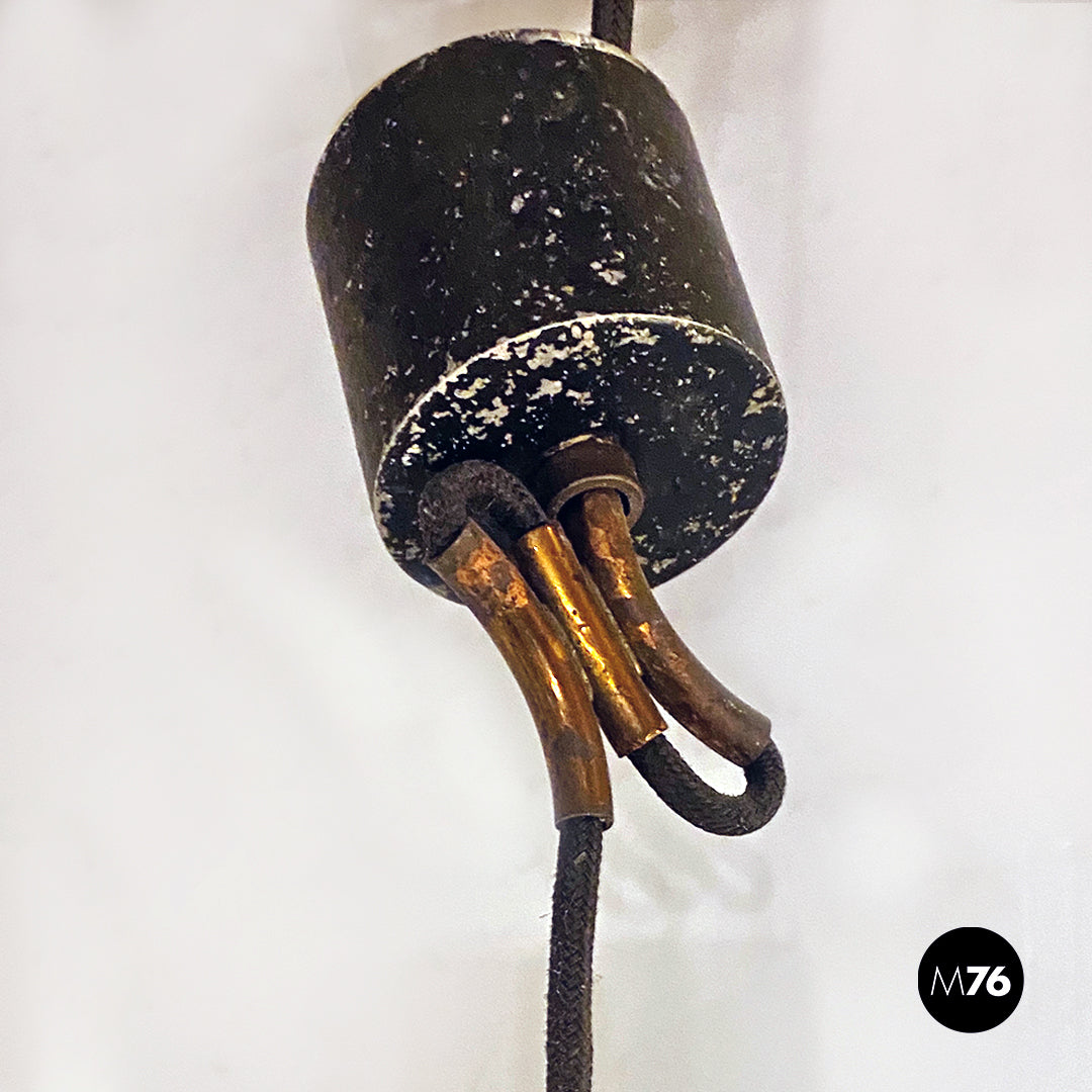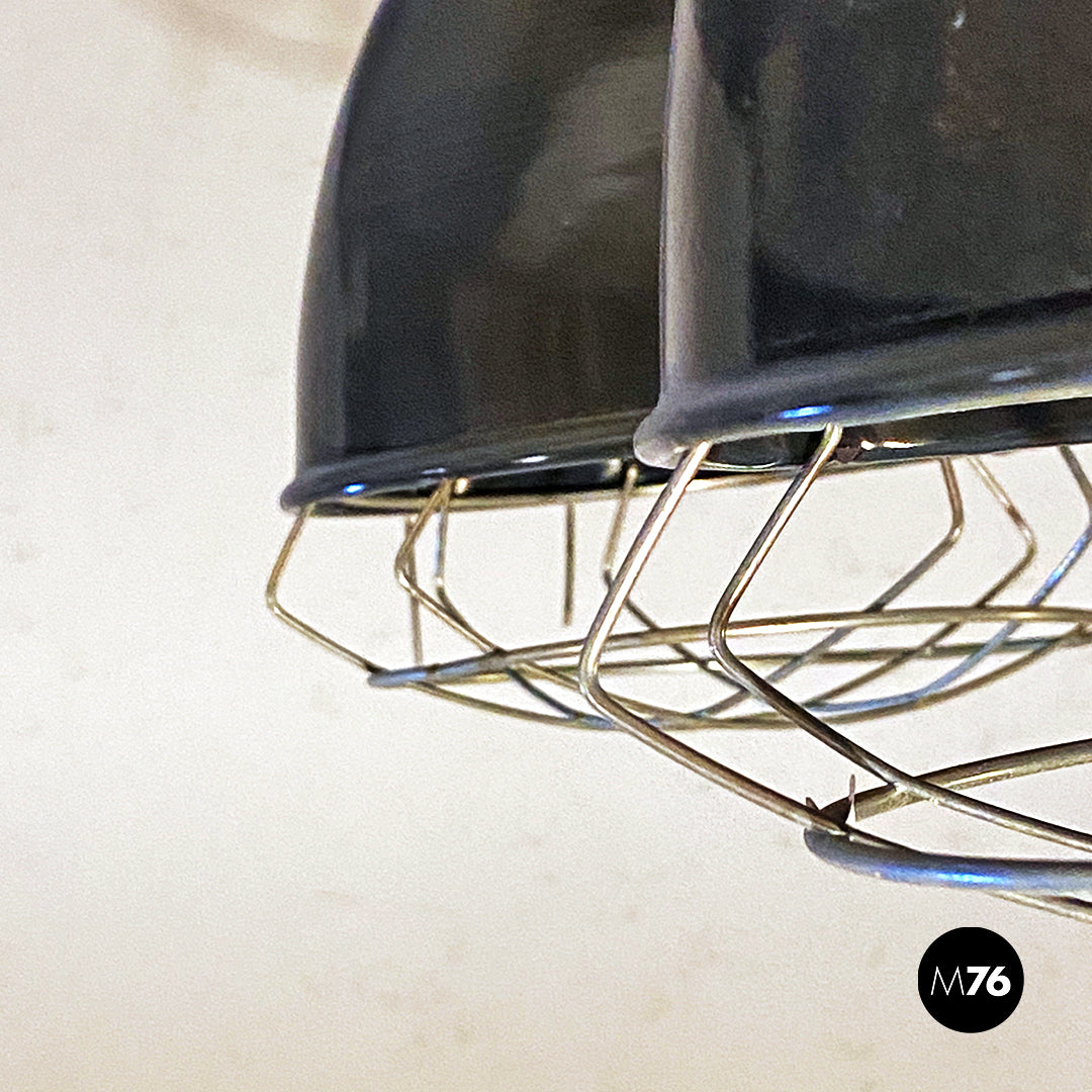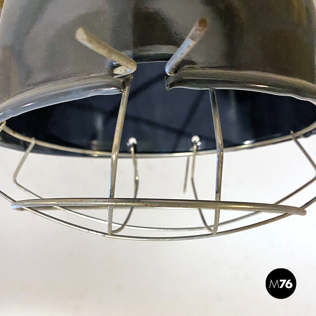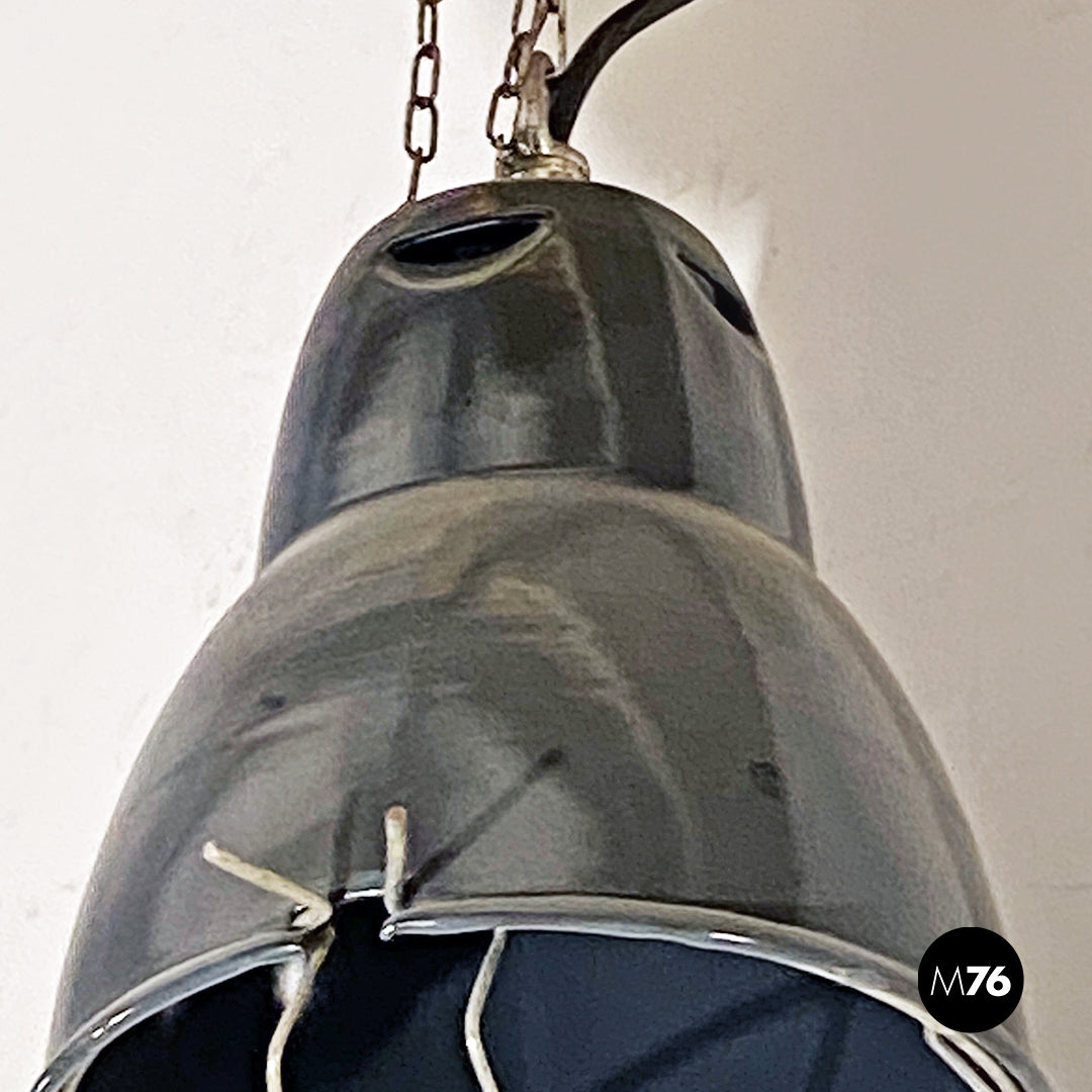 Tre lampadari industriali, in metallo smaltato grigio scuro con griglia metallica e catenina per la sospensione abbinata al lampadario.