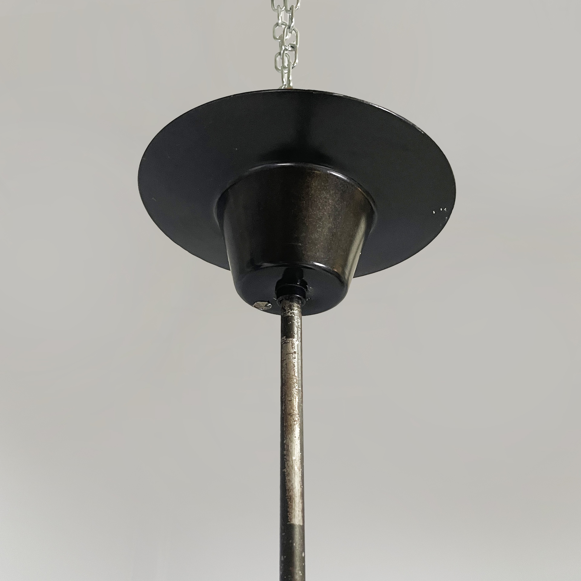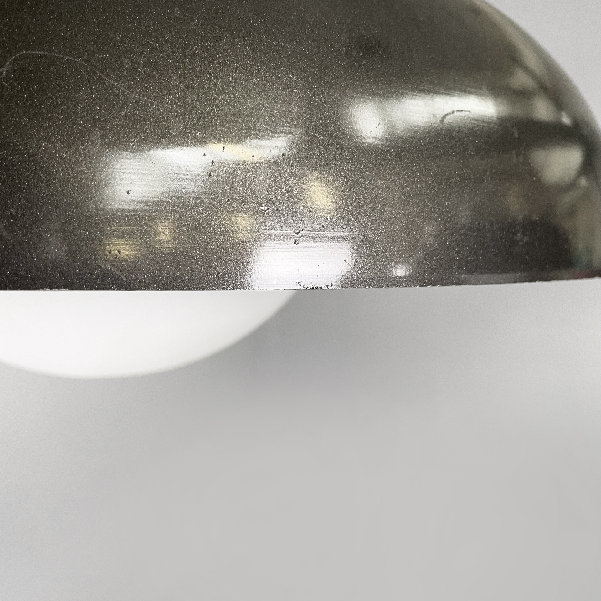 Buone condizioni. Il vetro presenta alcuni segni dati dal tempo. Il paralume in metallo presenta qualche difetto, graffi e piccole mancanze di vernice. La struttura in metallo presenta numero segni del tempo.