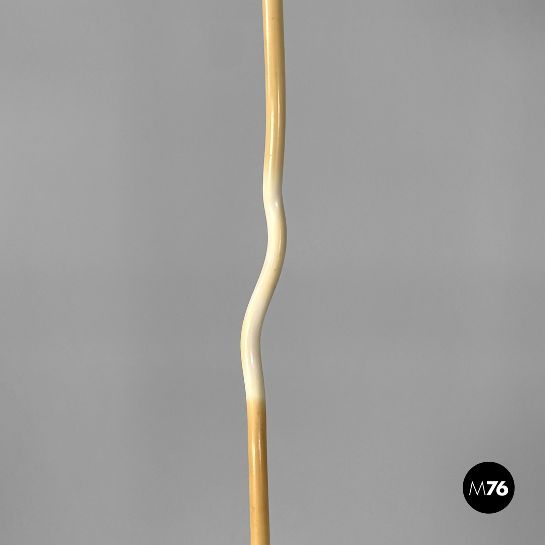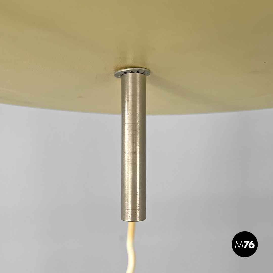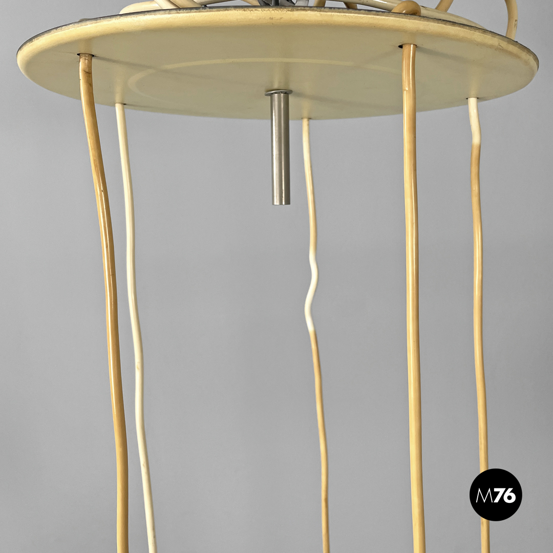 Lampadario a cascata a base tonda, composto da cinque sfere sospese in metallo cromato con l’interno laccato in bianco. L’appoggio al soffitto è dato da un rosone tondo in metallo bianco tendente al giallo, da qui partono i cavi in plastica bianca che si collegano ai cinque diffusori. Le sfere sono orientabili e la lunghezza dei cavi è regolabile.
