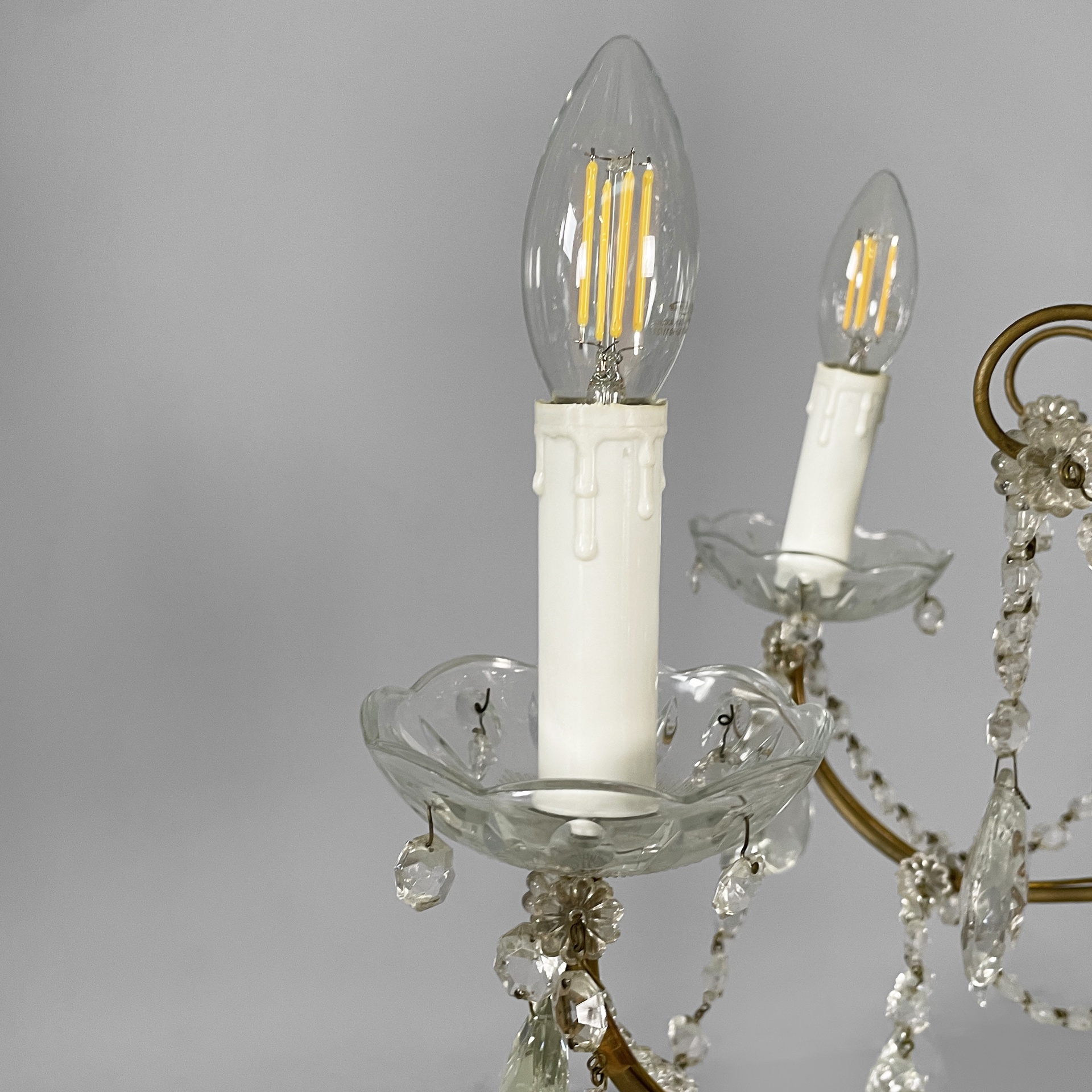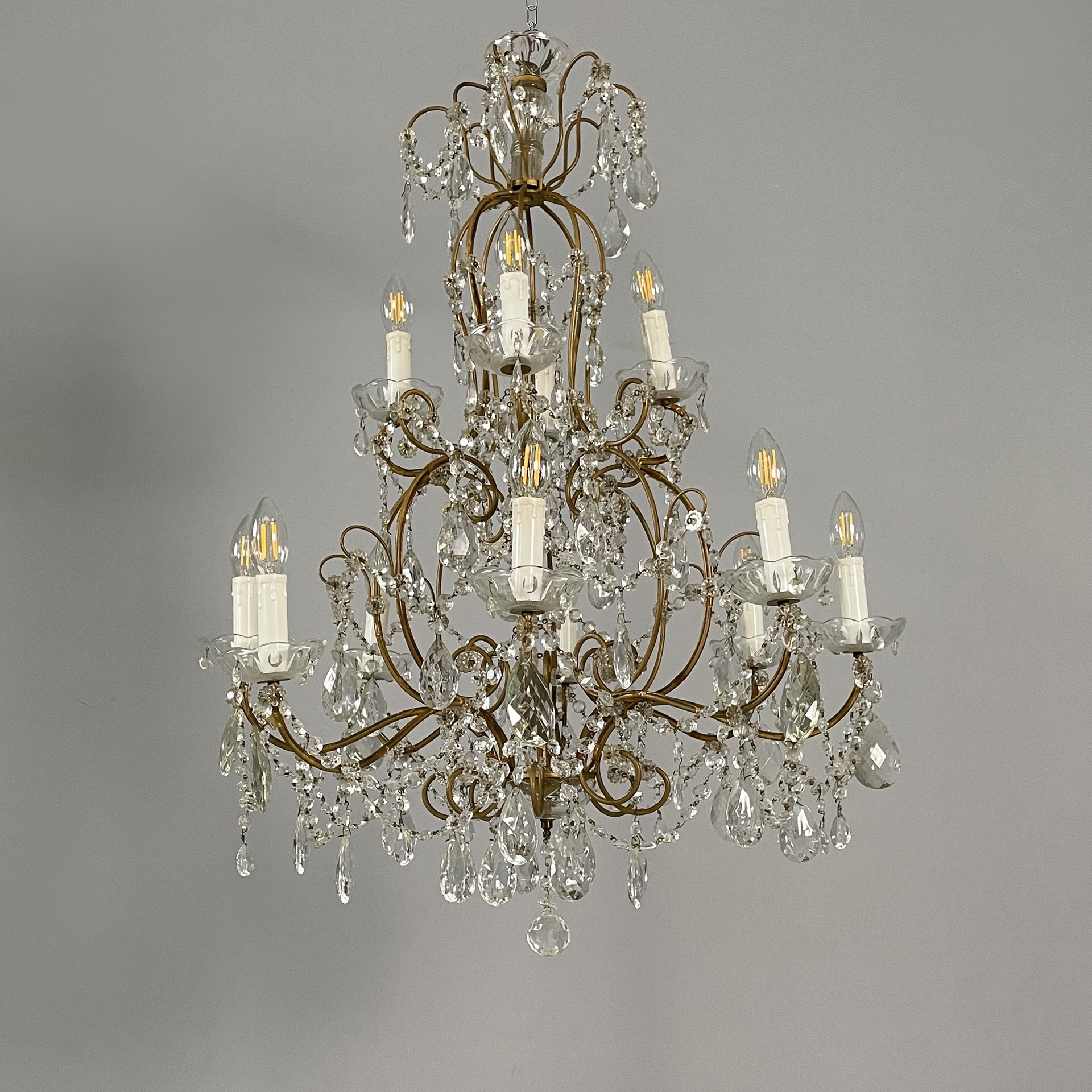 Lampadario a gocce con dodici punti luce a forma di candela, divisi su due piani. La struttura è composta da diversi tondini curvati di ottone. Su tutta la struttura si articolano gocce e sfere di vetro sagomate, collegate da catenelle decorative in metallo. L’attacco al soffitto è in vetro e metallo.