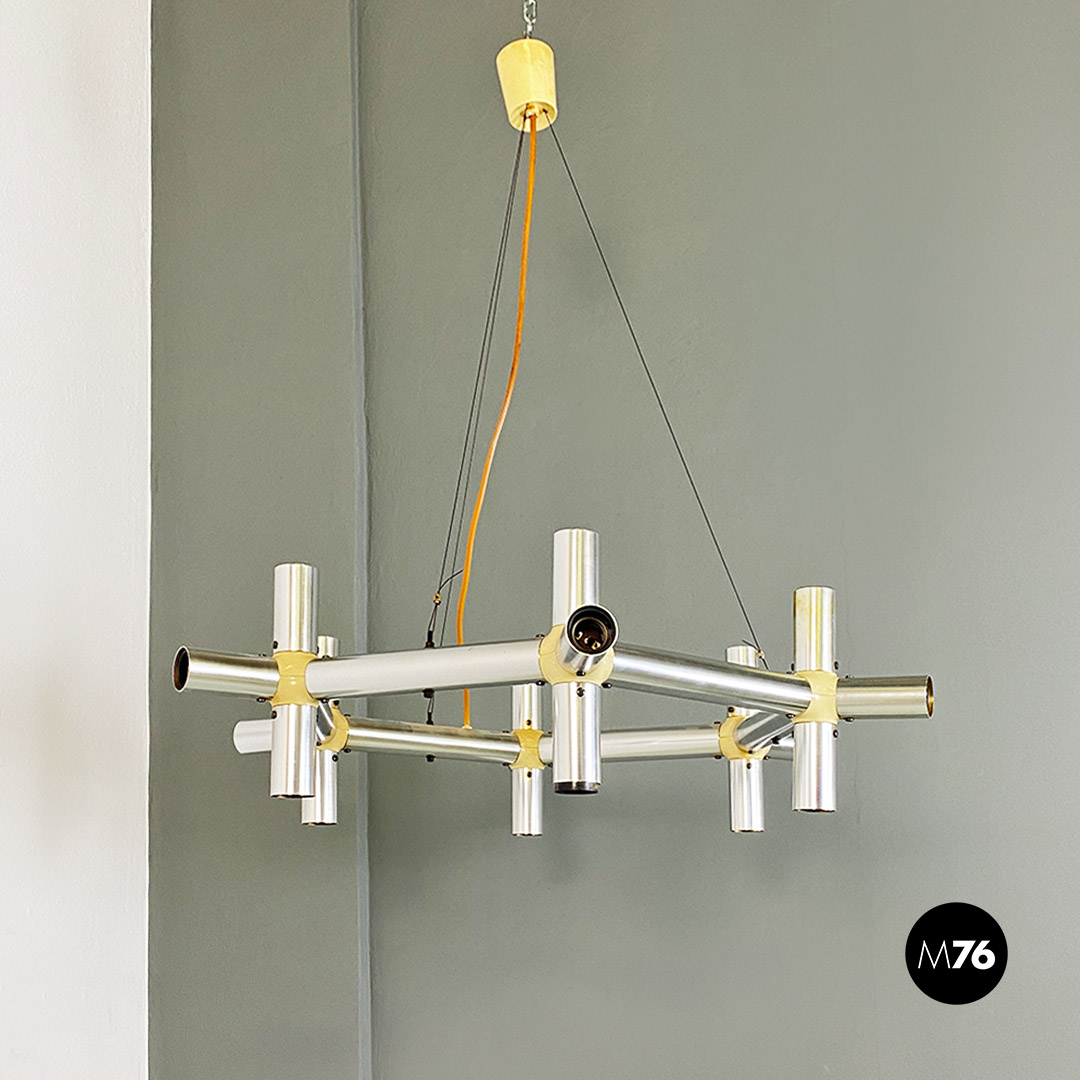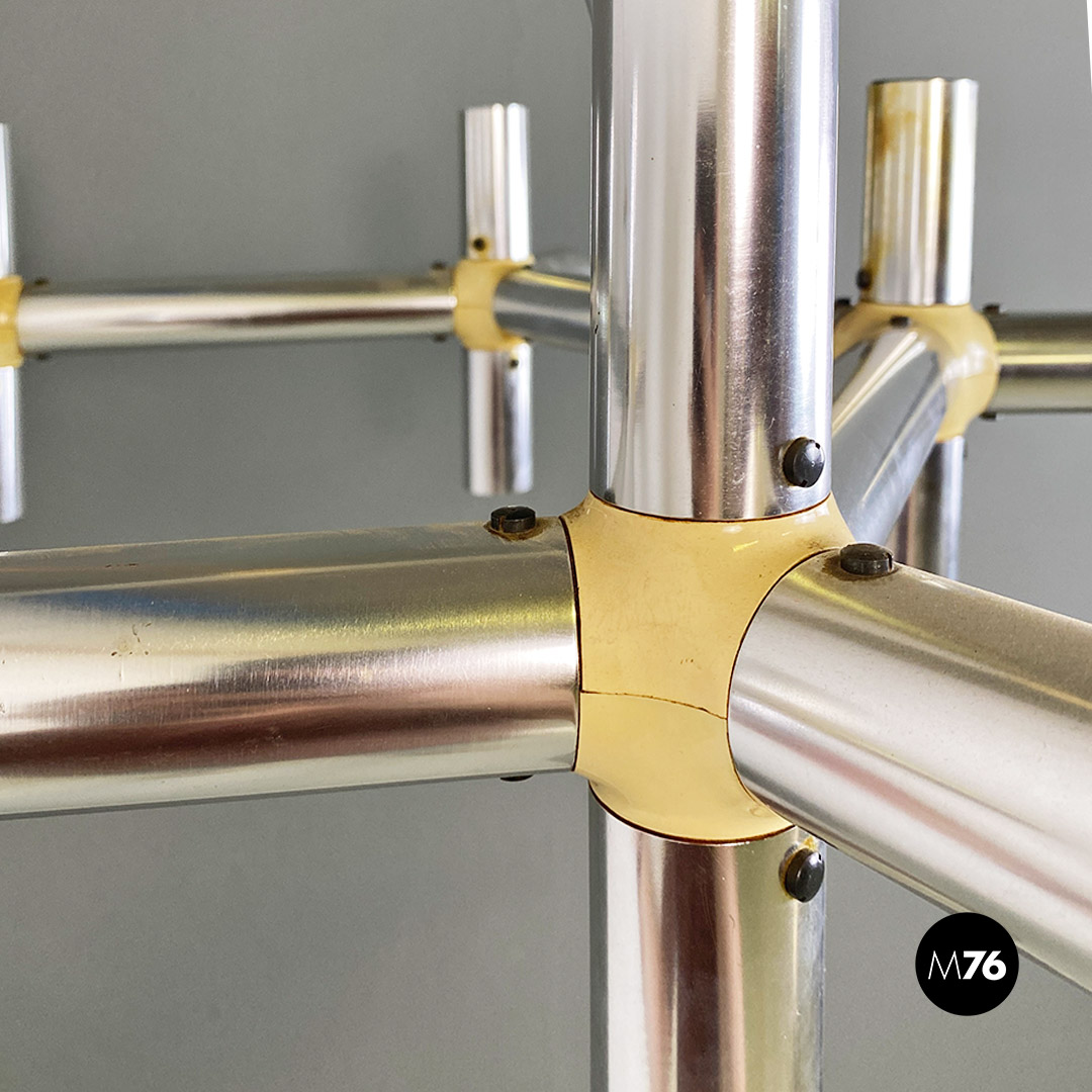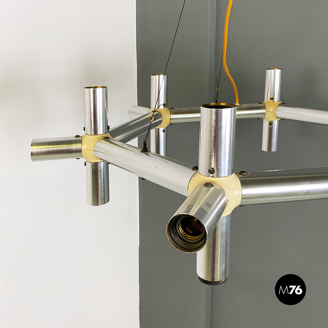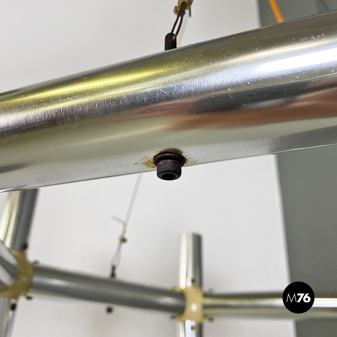 Lampadario modello Atomic con struttura metallica con finitura satinata, che ricorda i composti atomici, con snodi in plastica beige. Provvista di diciotto attacchi luminosi di misura E27 e tiranti in filo di ferro che lo tengono in sospensione e bilanciato.