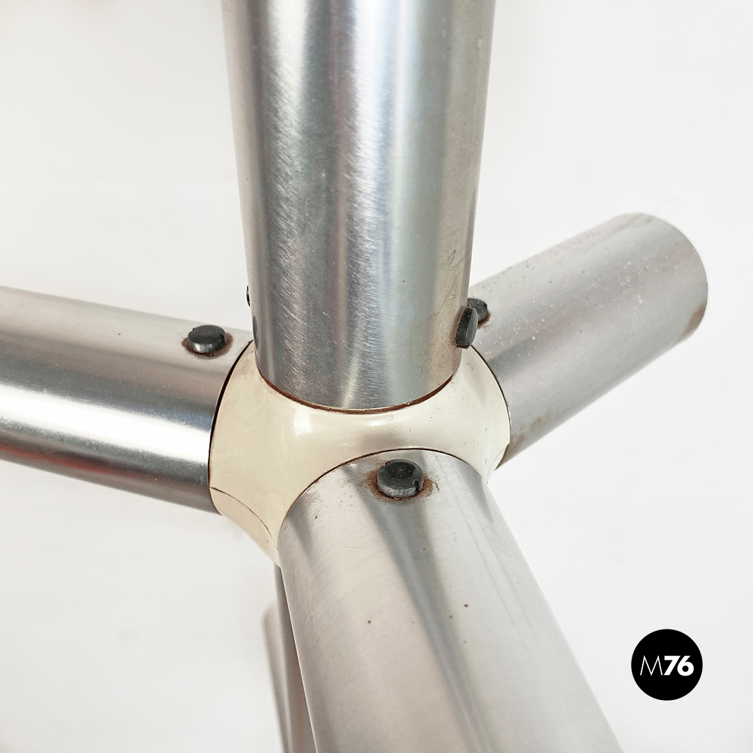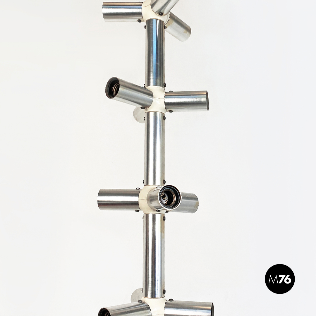 Lampadario modello Atomic in acciaio satinato a 28 luci, poste ogni tre ad altezze differenti, con un ultimo attacco posto nella parte inferiore della struttura. Dettagli in plastica bianca e struttura leggermente flessibile.
