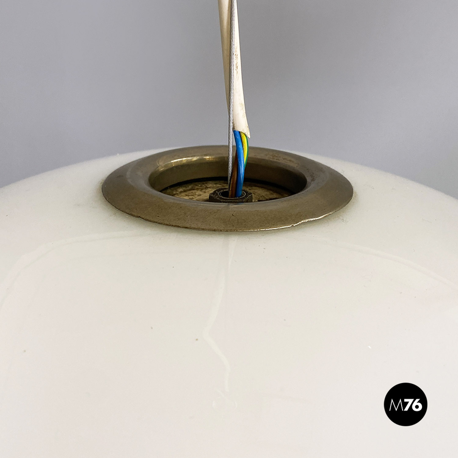 Lampadario modello Black and White, con diffusore di forma tondeggiante, in vetro opalino, contenente due attacchi E27. La parte inferiore è in metallo ed è provvista di un altro attacco E27 centrale ed esterno.