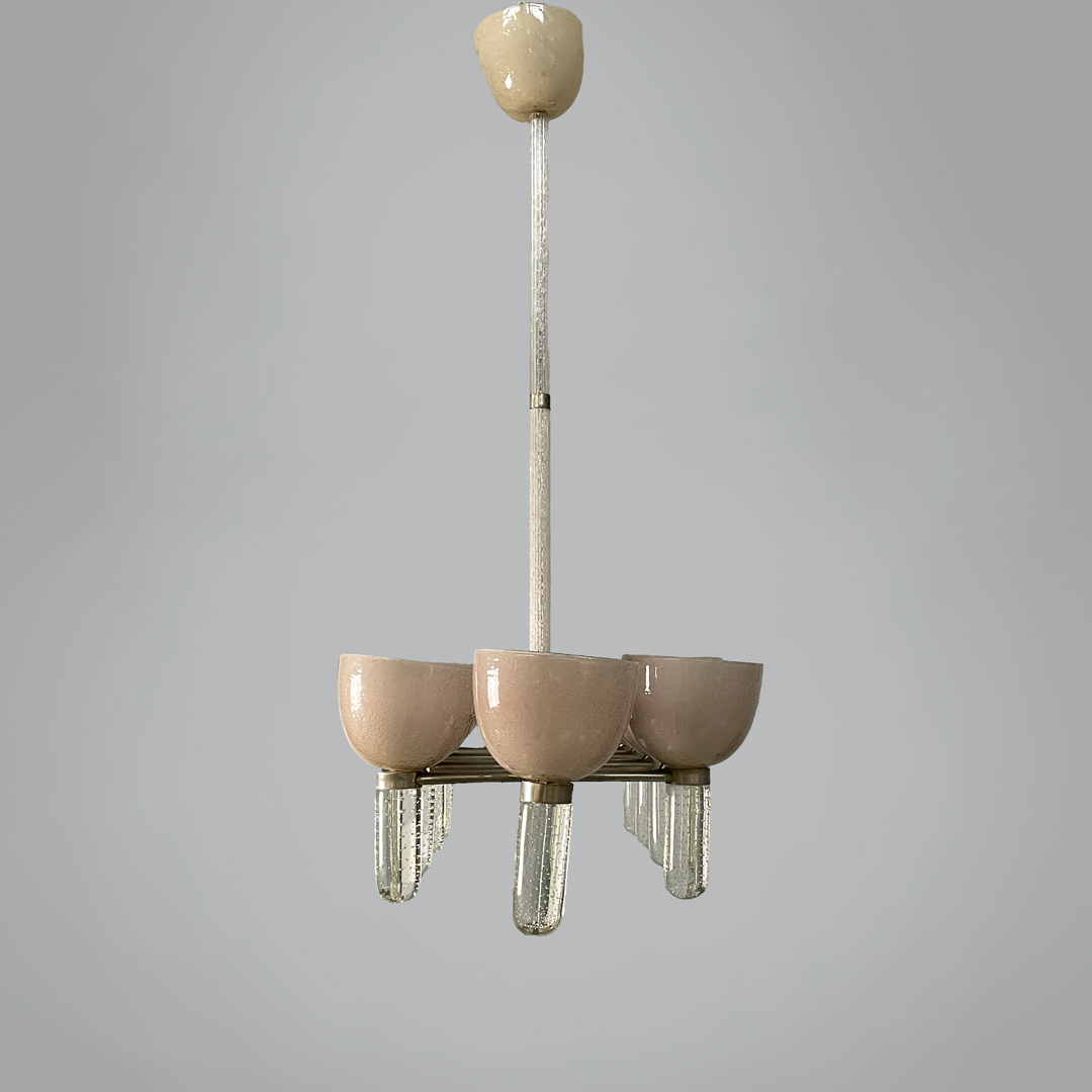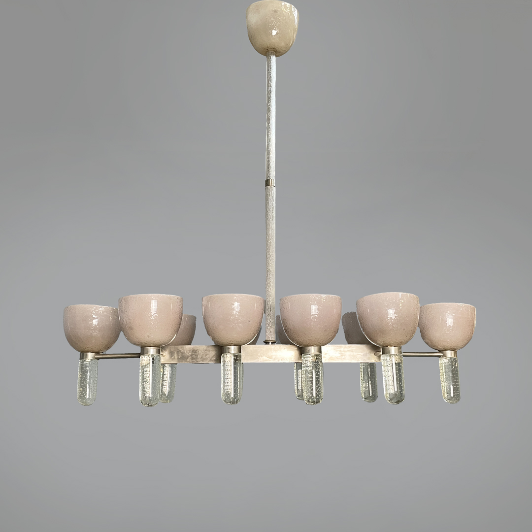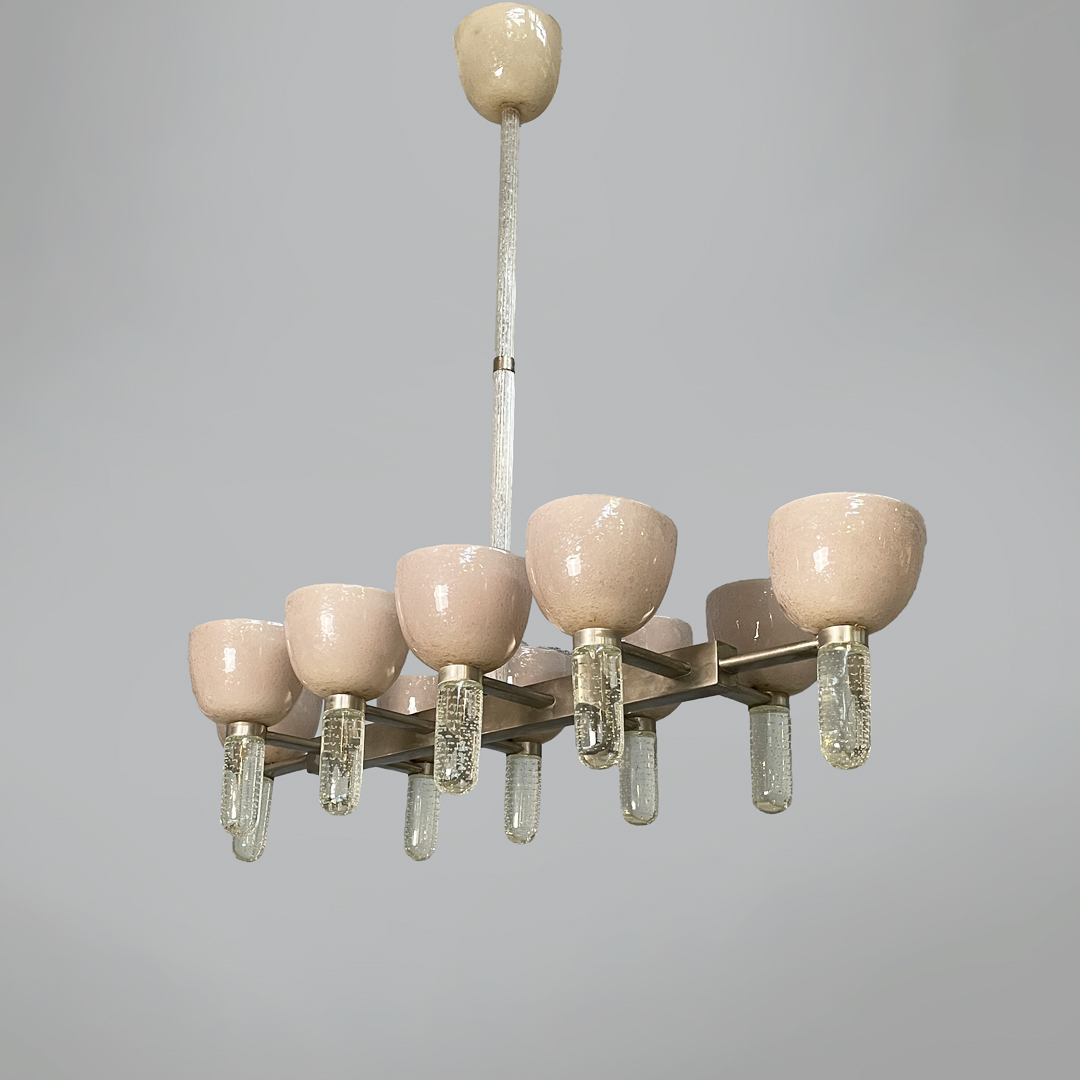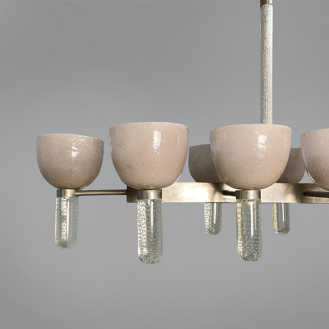 Lampadario in vetro di Murano. La struttura principale è in metallo, composta da un’asta centrale verticale rivestita in vetro che scende dall’attacco a soffitto sempre in vetro e da un telaio orizzontale lineare con diversi bracci. Sono presenti otto diffusori a coppe emisferiche, in vetro pulegoso colore rosa chiaro, disposte in fila. Sotto ciascuna coppa c’è un elemento in vetro trasparente lavorato.