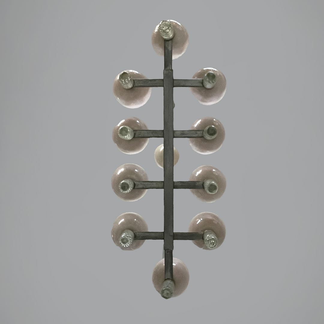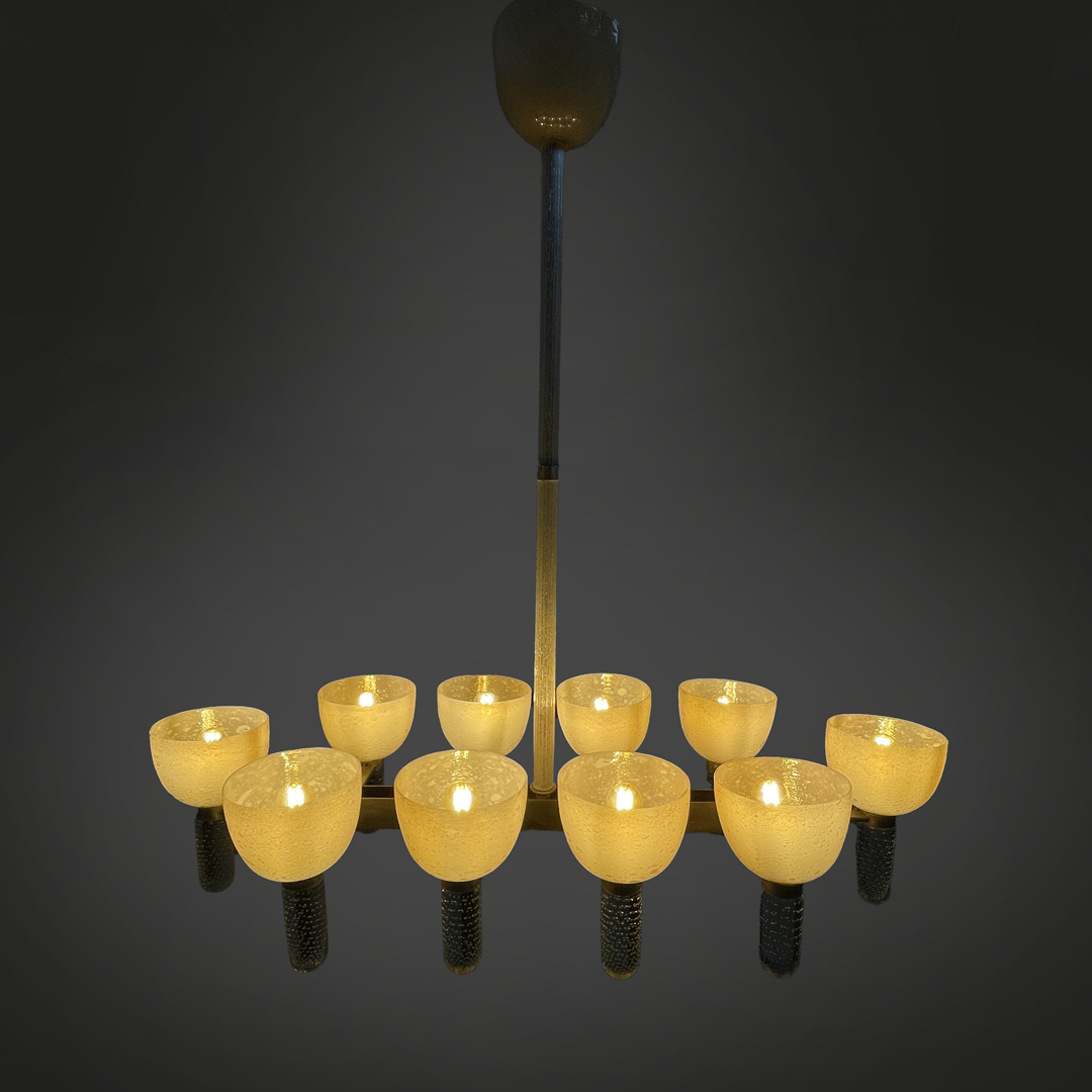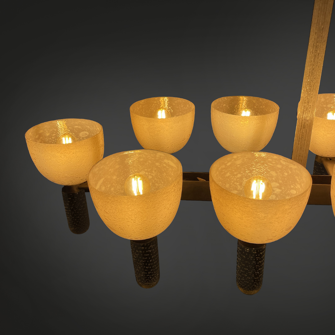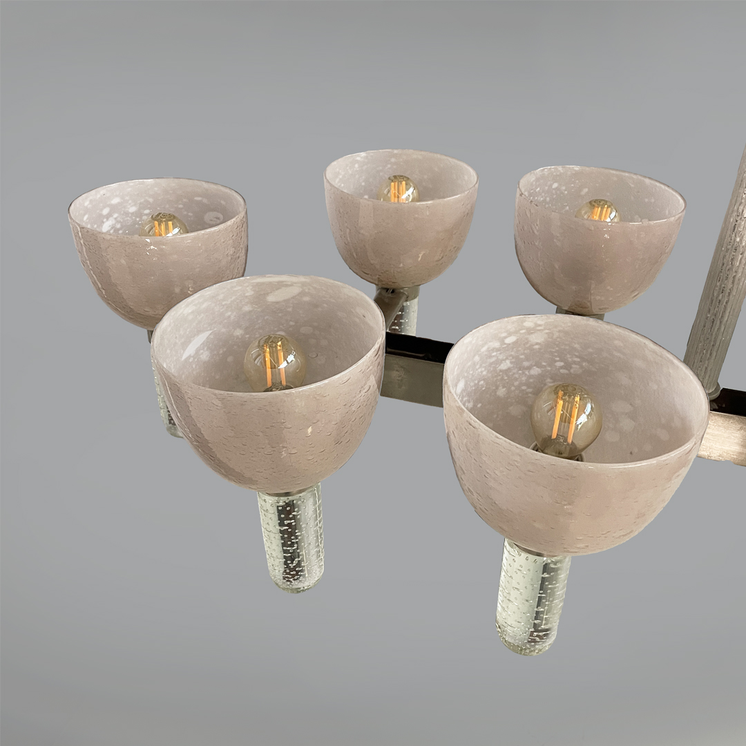 Lampadario in vetro di Murano. La struttura principale è in metallo, composta da un’asta centrale verticale rivestita in vetro che scende dall’attacco a soffitto sempre in vetro e da un telaio orizzontale lineare con diversi bracci. Sono presenti otto diffusori a coppe emisferiche, in vetro pulegoso colore rosa chiaro, disposte in fila. Sotto ciascuna coppa c’è un elemento in vetro trasparente lavorato.