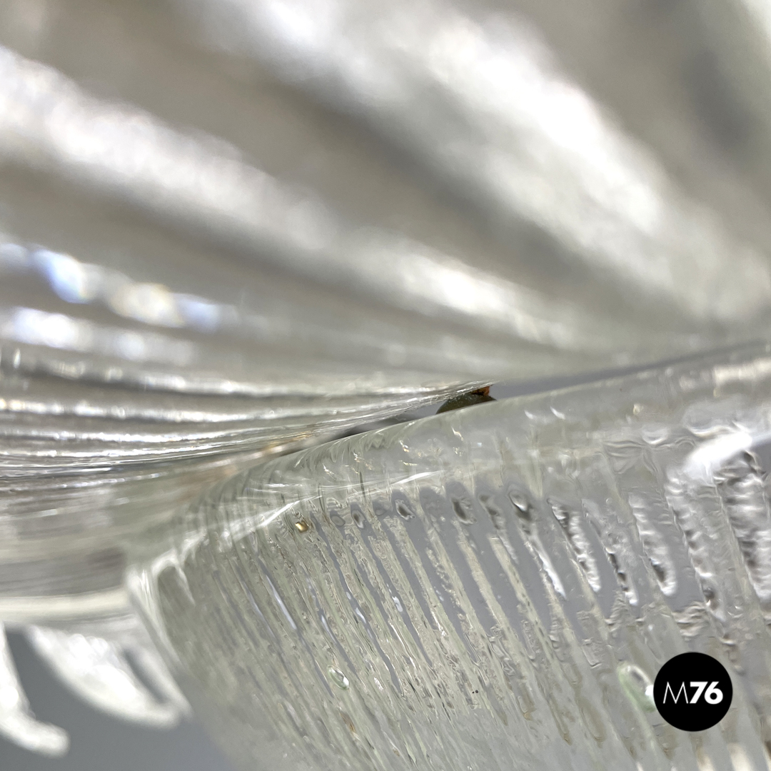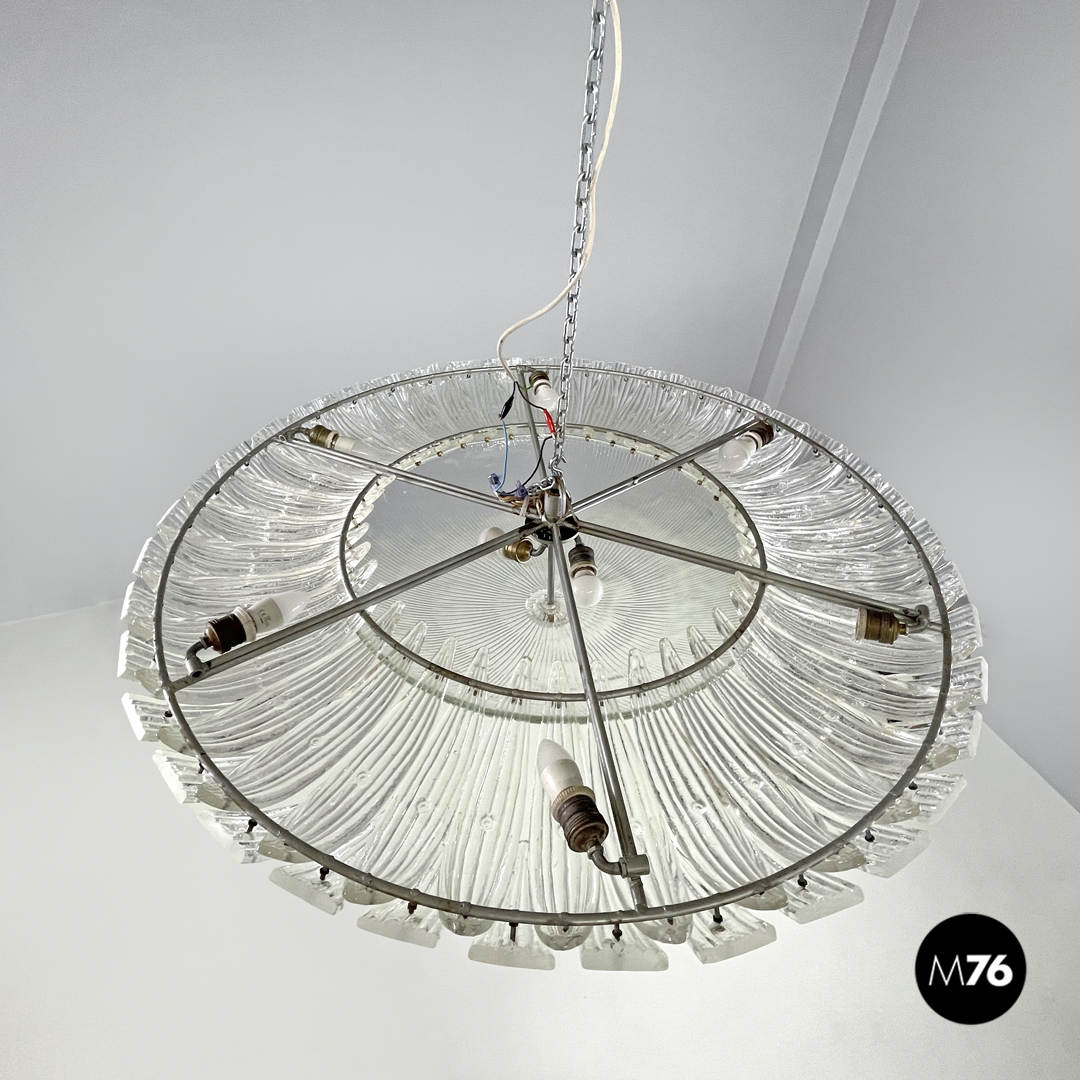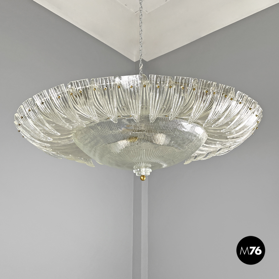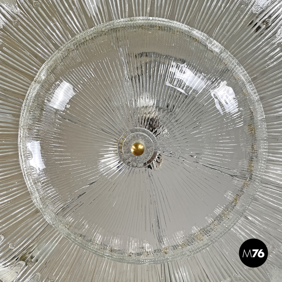 Lampadario tondo o plafoniera in vetro di Murano trasparente, che ricorda la forma di un fiore. La fila esterna è composta da elementi dalla forma triangolare sagomata con incisioni verticali decorative che si sviluppano verso l’interno del lampadario. La fila più interna è composta dagli stessi “petali” ma dalla forma più allungata, mentre al centro si trova una cupola rovesciata con le stesse decorazioni incise, con due dischi di vetro trasparente ed una sfera in metallo dorato. La struttura portante è in metallo.