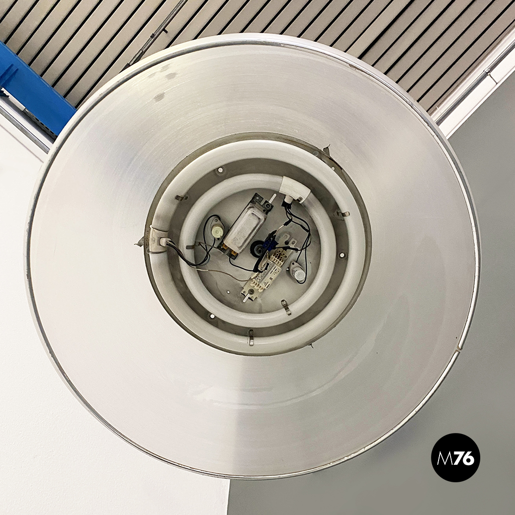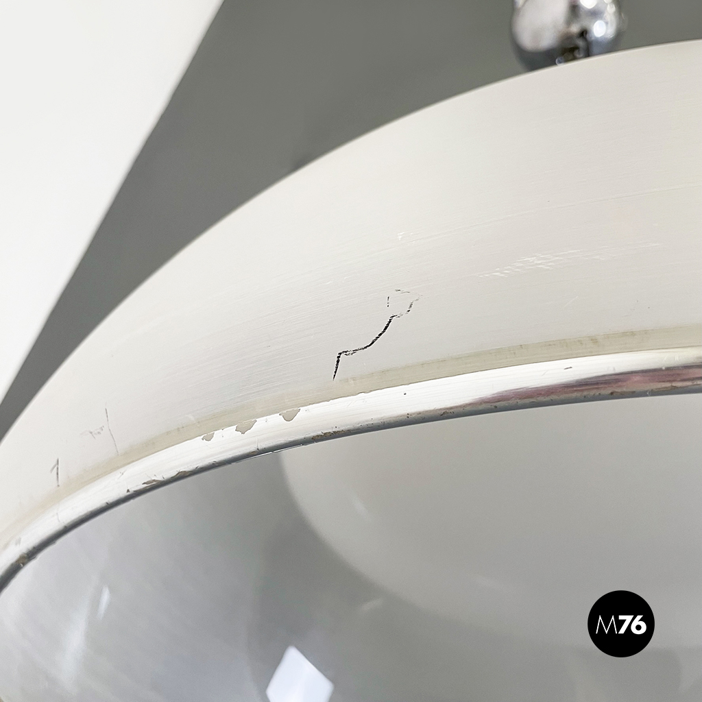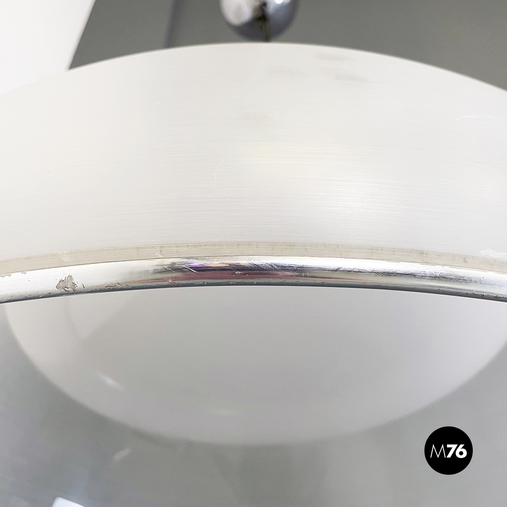 Lampadario con paralume a forma di cupola in plexiglass bianco, con profilo metallico. Impianto interno di illuminazione a doppio neon tondo, coperto dalla plastica bianca.