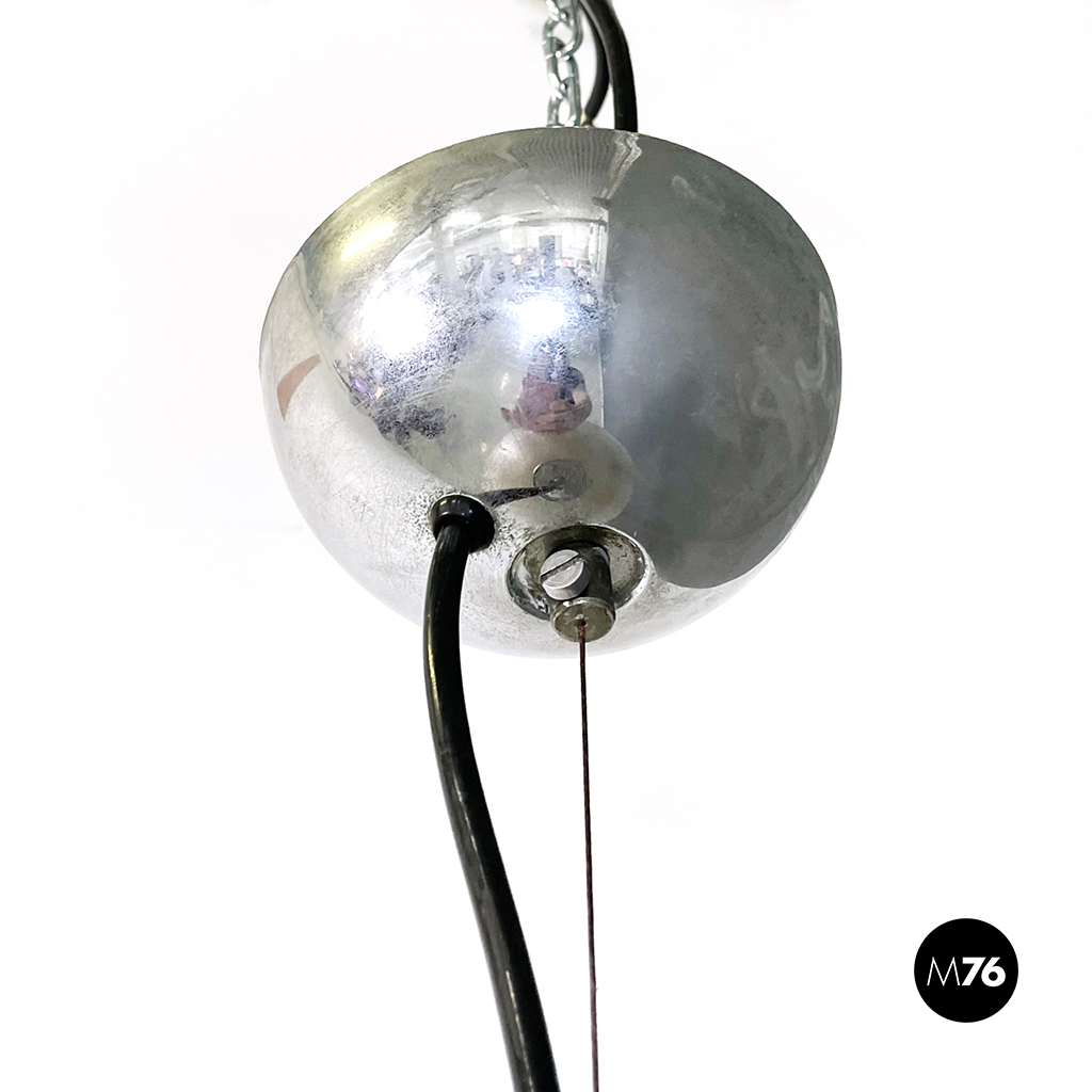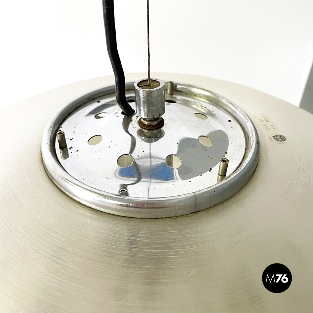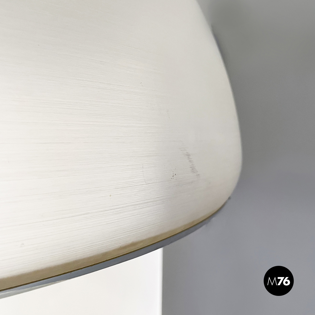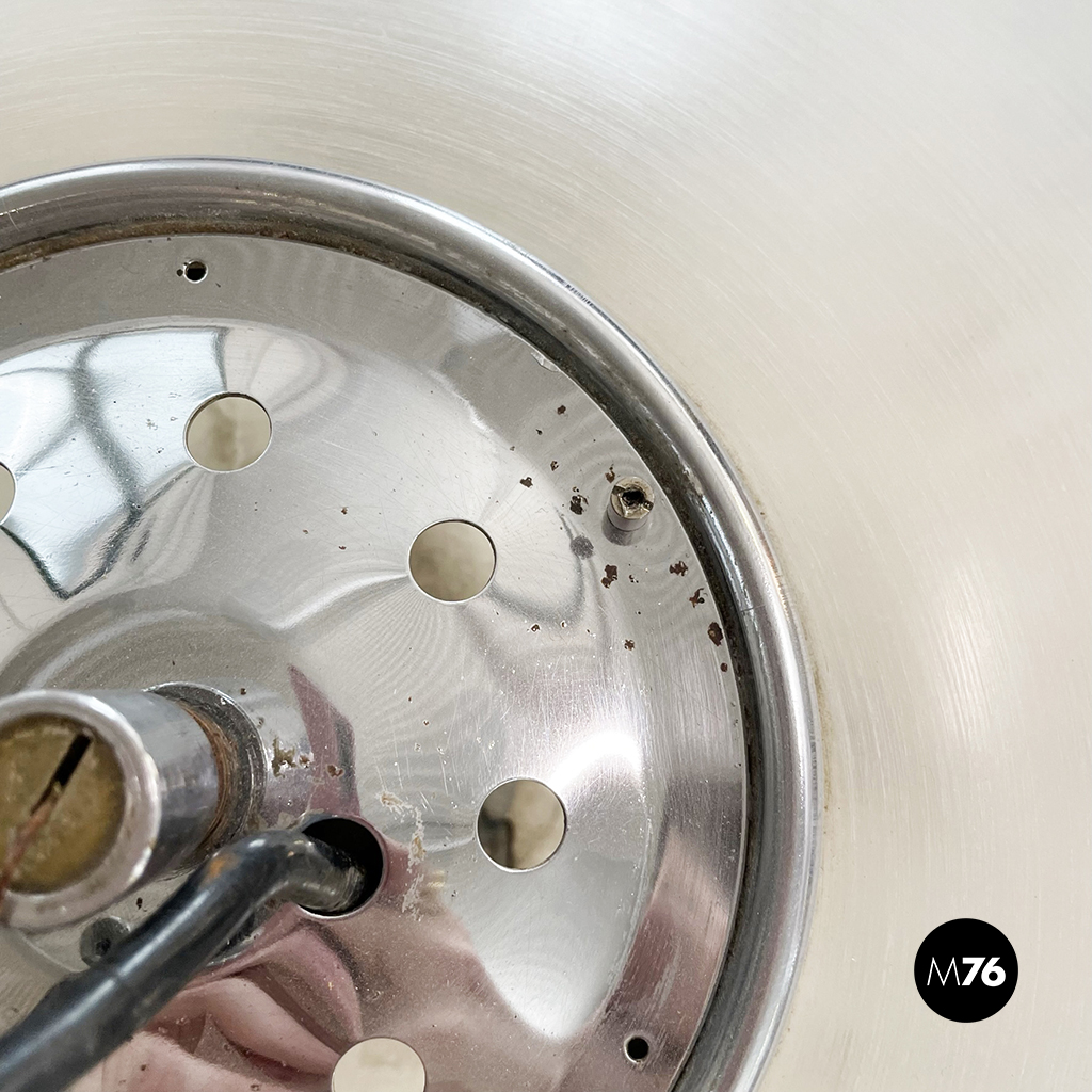 Lampadario con paralume a forma di cupola in plexiglass bianco, con profilo metallico. Impianto interno di illuminazione a doppio neon tondo, coperto dalla plastica bianca.