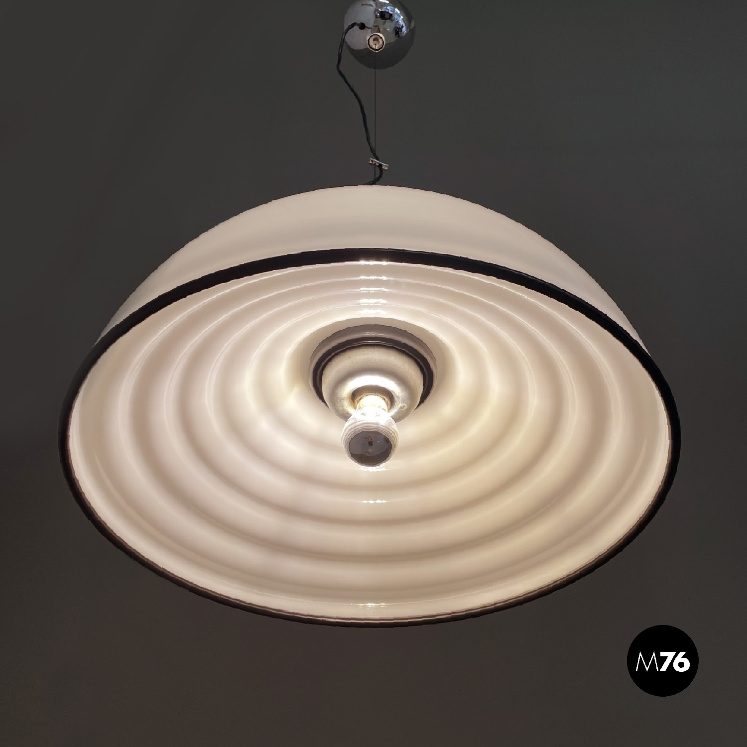 Lampadario con paralume a forma di cupola in plexiglass bianco, con profilo in plastica nera. L’interno del paralume presenta una ondulatura del plexiglass. Nella parte superiore del paralume si trova un porta lampada in plexiglass nero a cui sono collegati un filo in metallo e il cavo in plastica nera, sono uniti tramite un piccolo cilindro in metallo. L’attacco al soffitto è in plastica argentata.