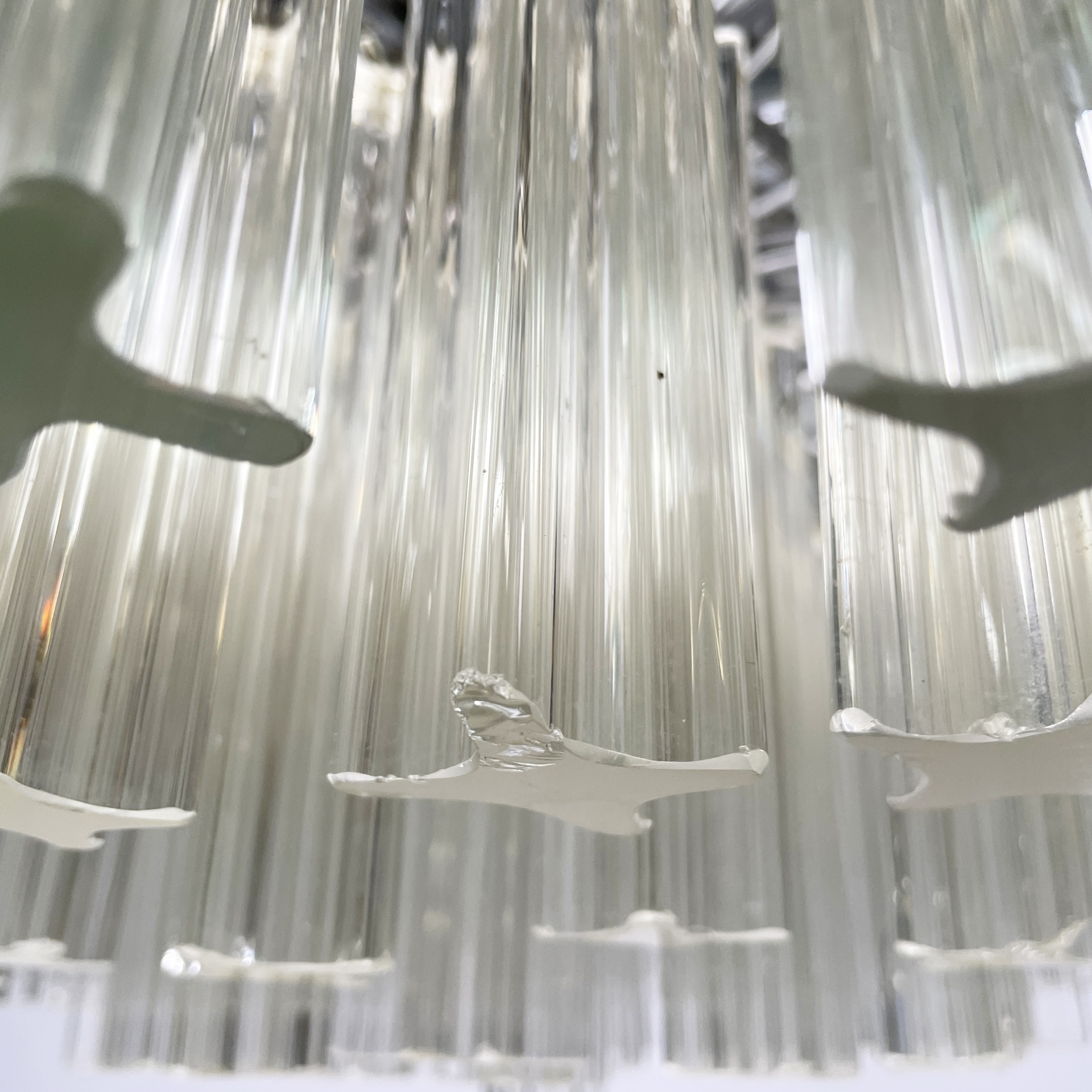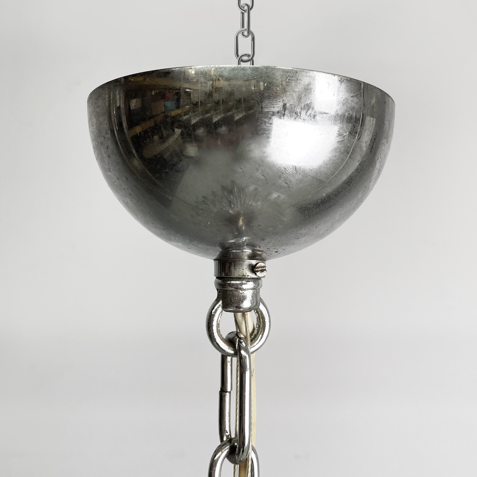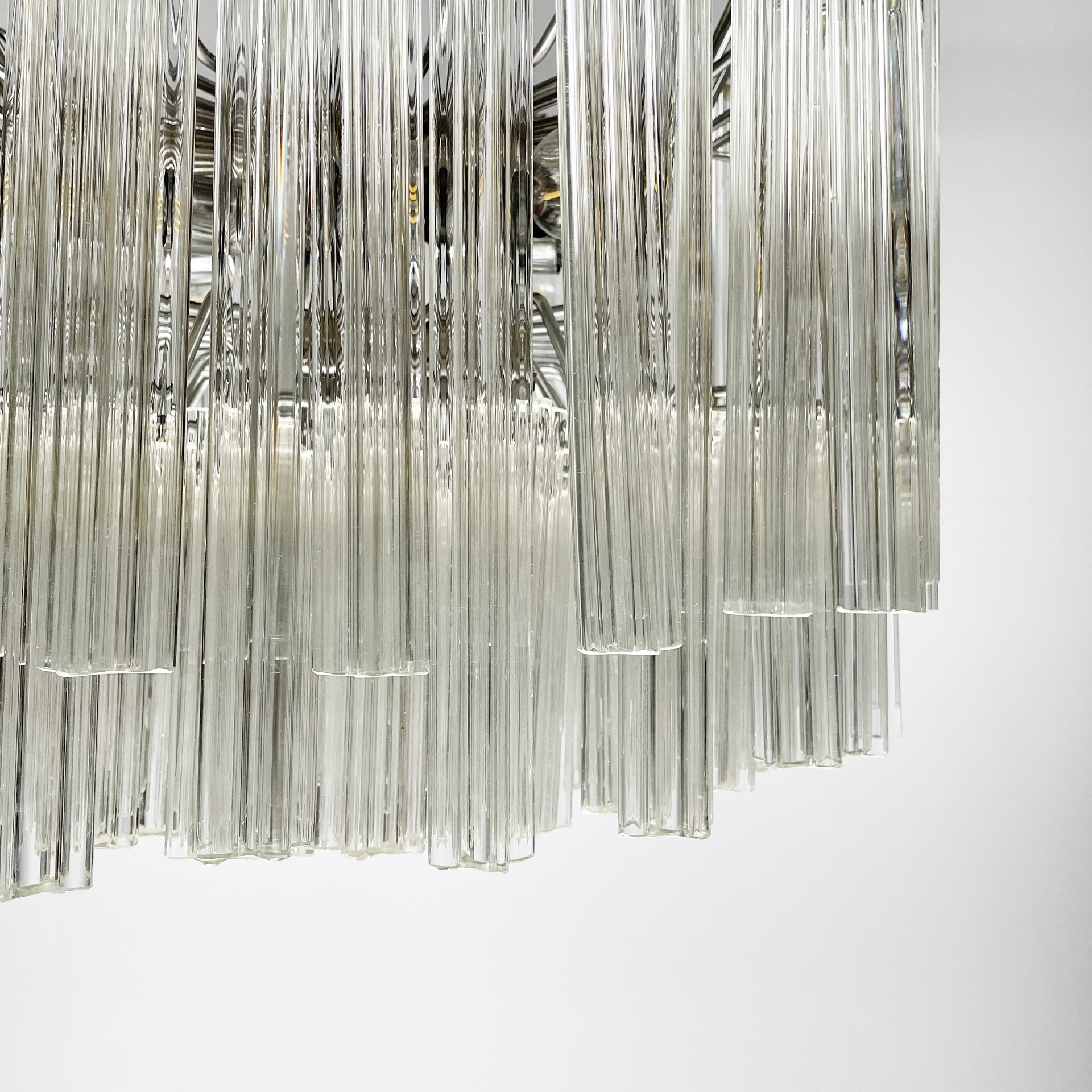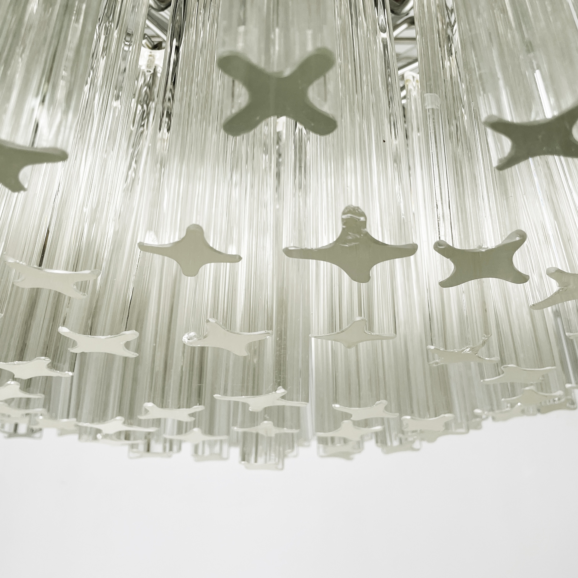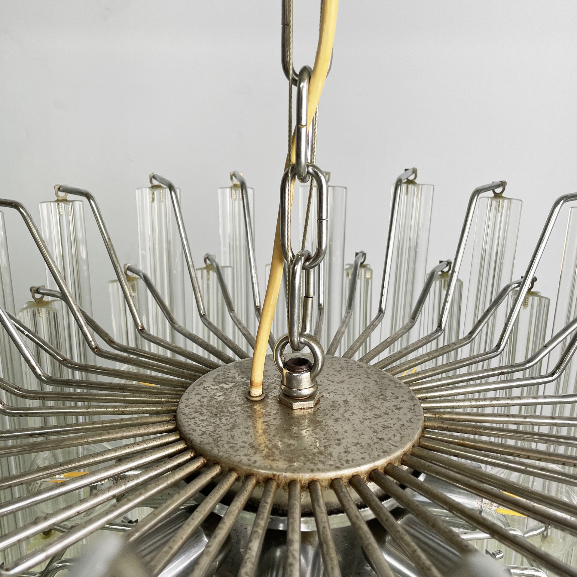 Lampadario con diffusore composto da numerosi listelli in vetro sagomati, i quali sono appesi alla struttura centrale tonda grazie a dei tondini di metallo. La lampada presenta otto lampadine. Catena ed attacco al soffitto a cupola in metallo.
