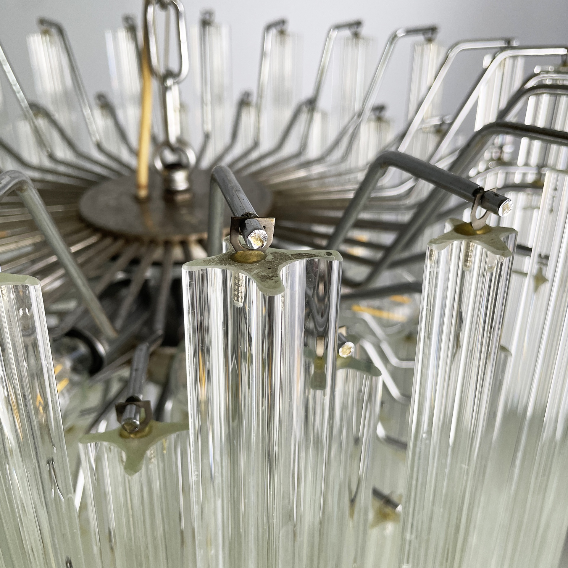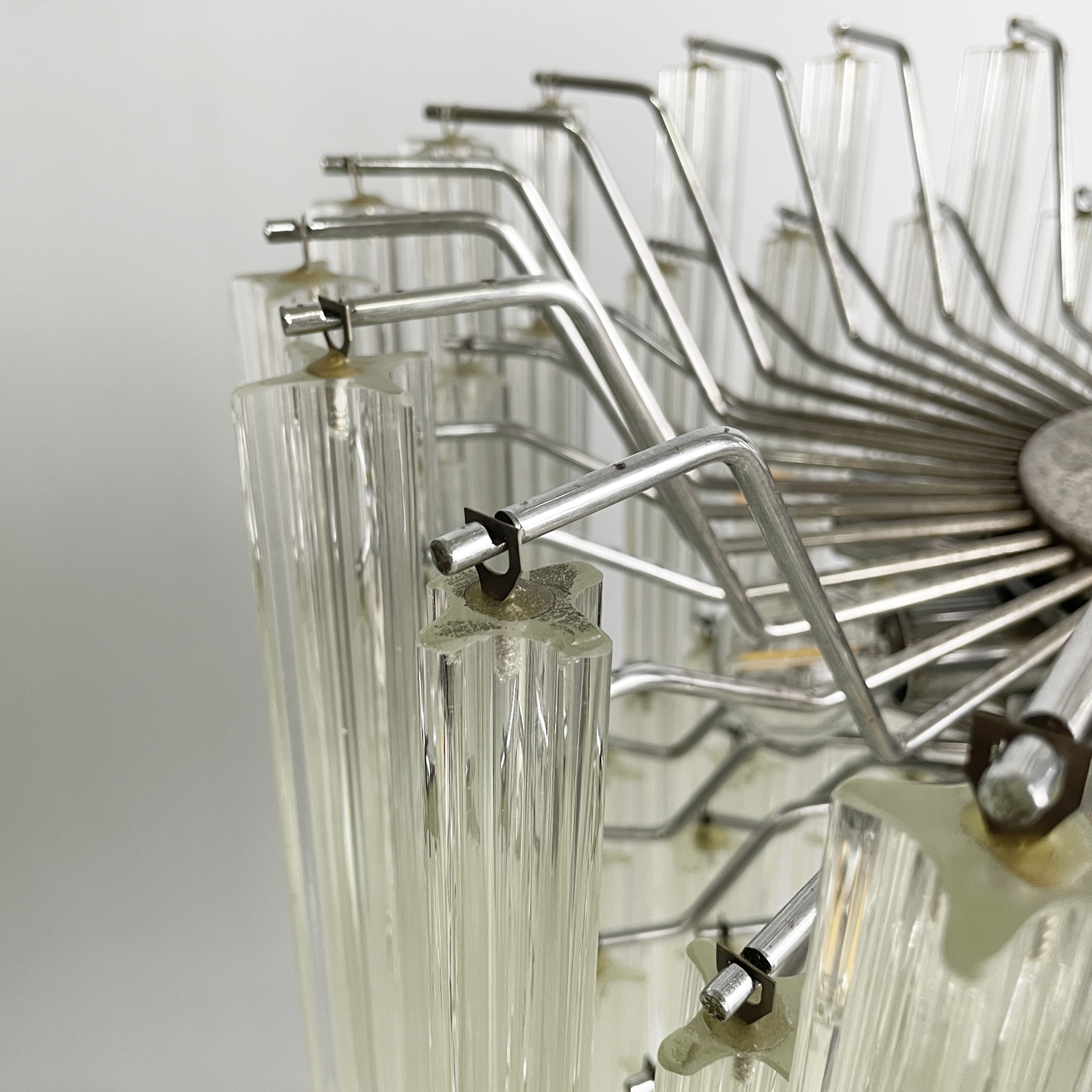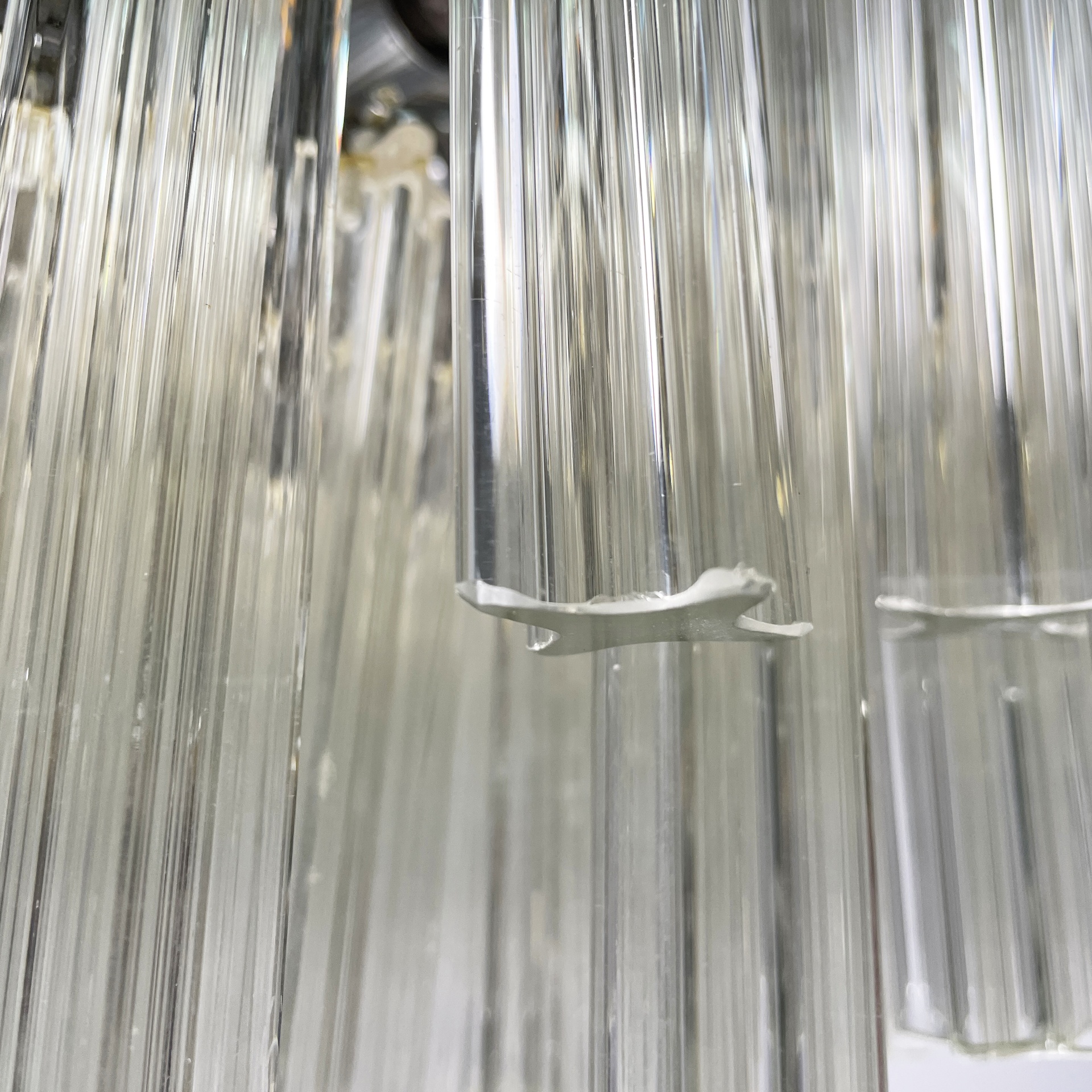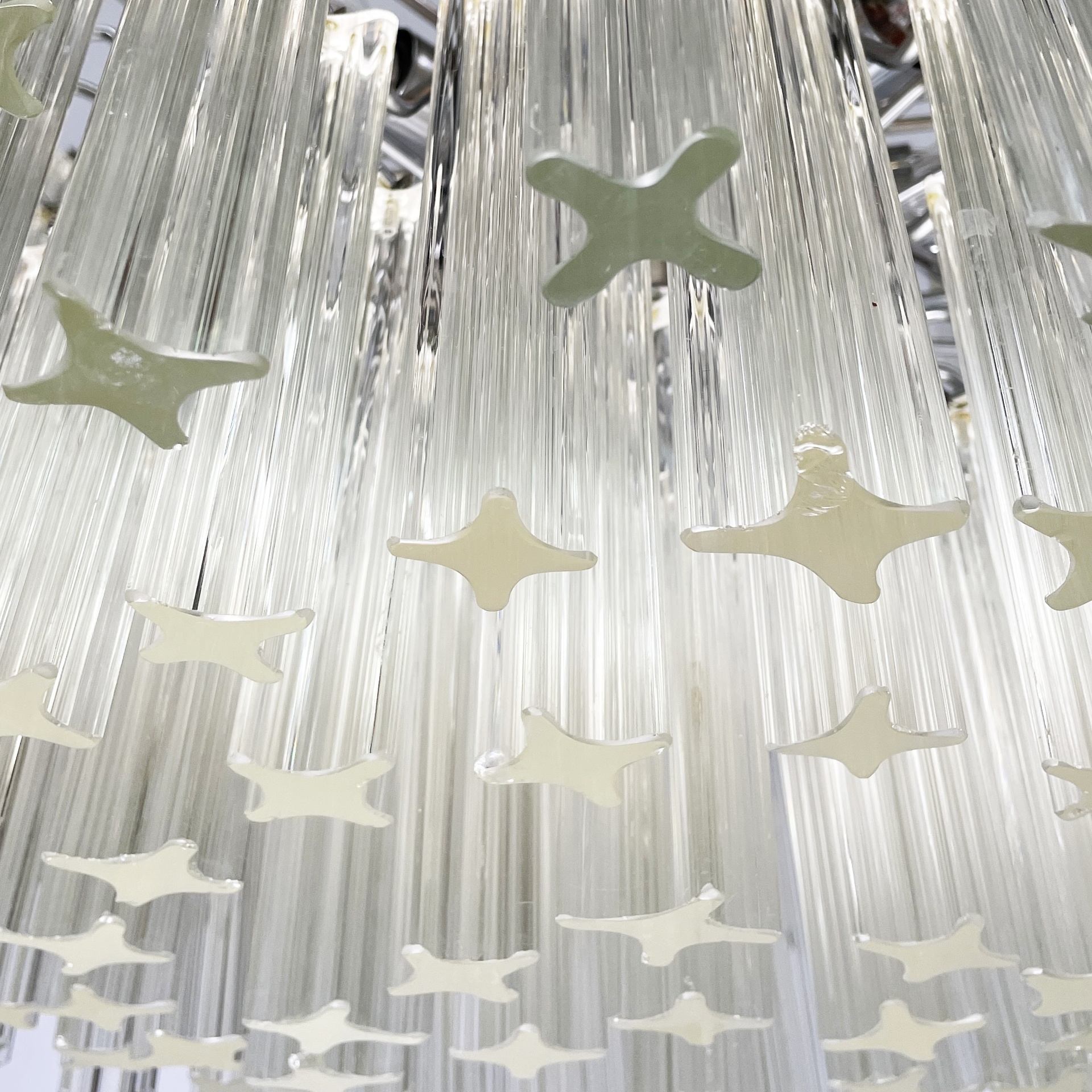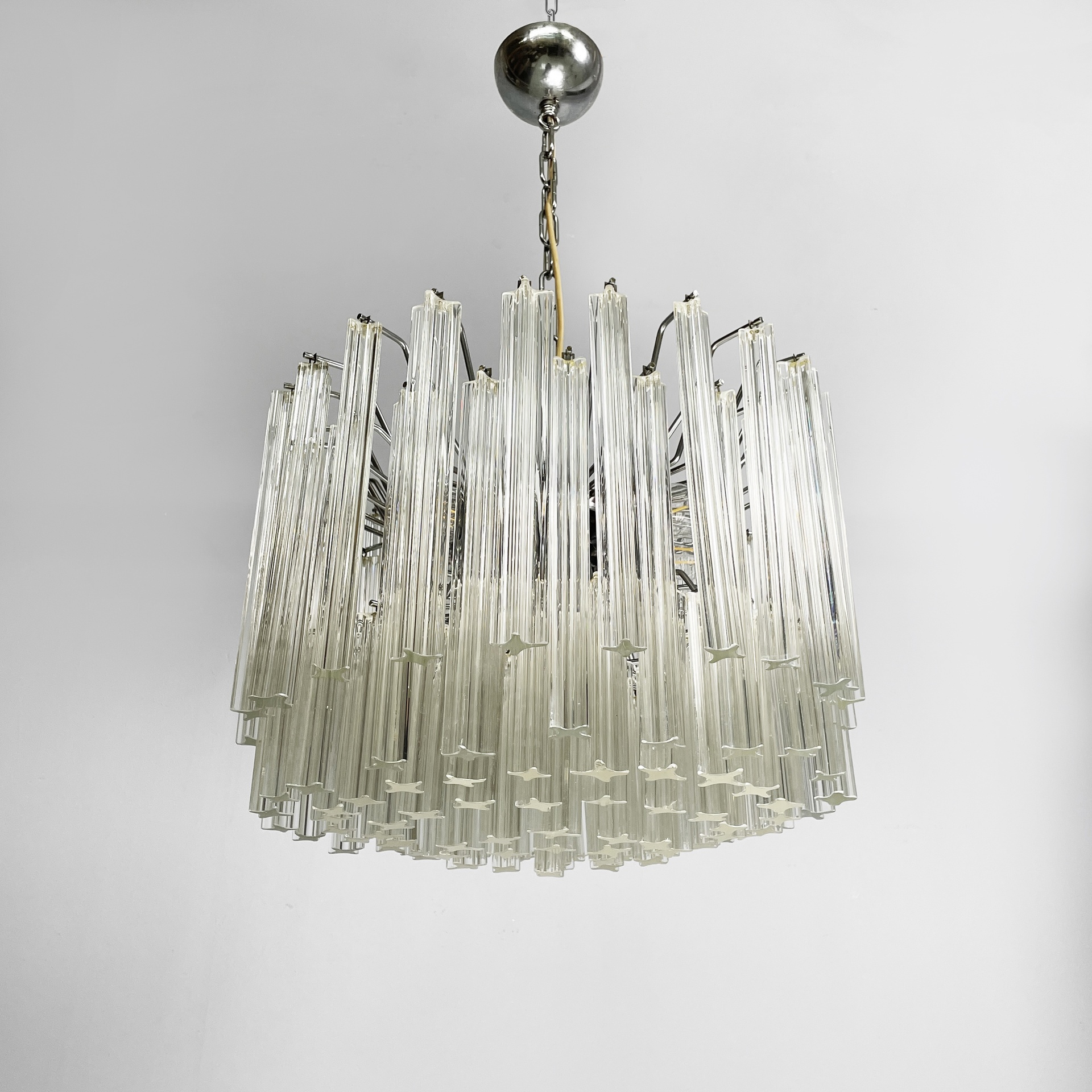 Lampadario con diffusore composto da numerosi listelli in vetro sagomati, i quali sono appesi alla struttura centrale tonda grazie a dei tondini di metallo. La lampada presenta otto lampadine. Catena ed attacco al soffitto a cupola in metallo.