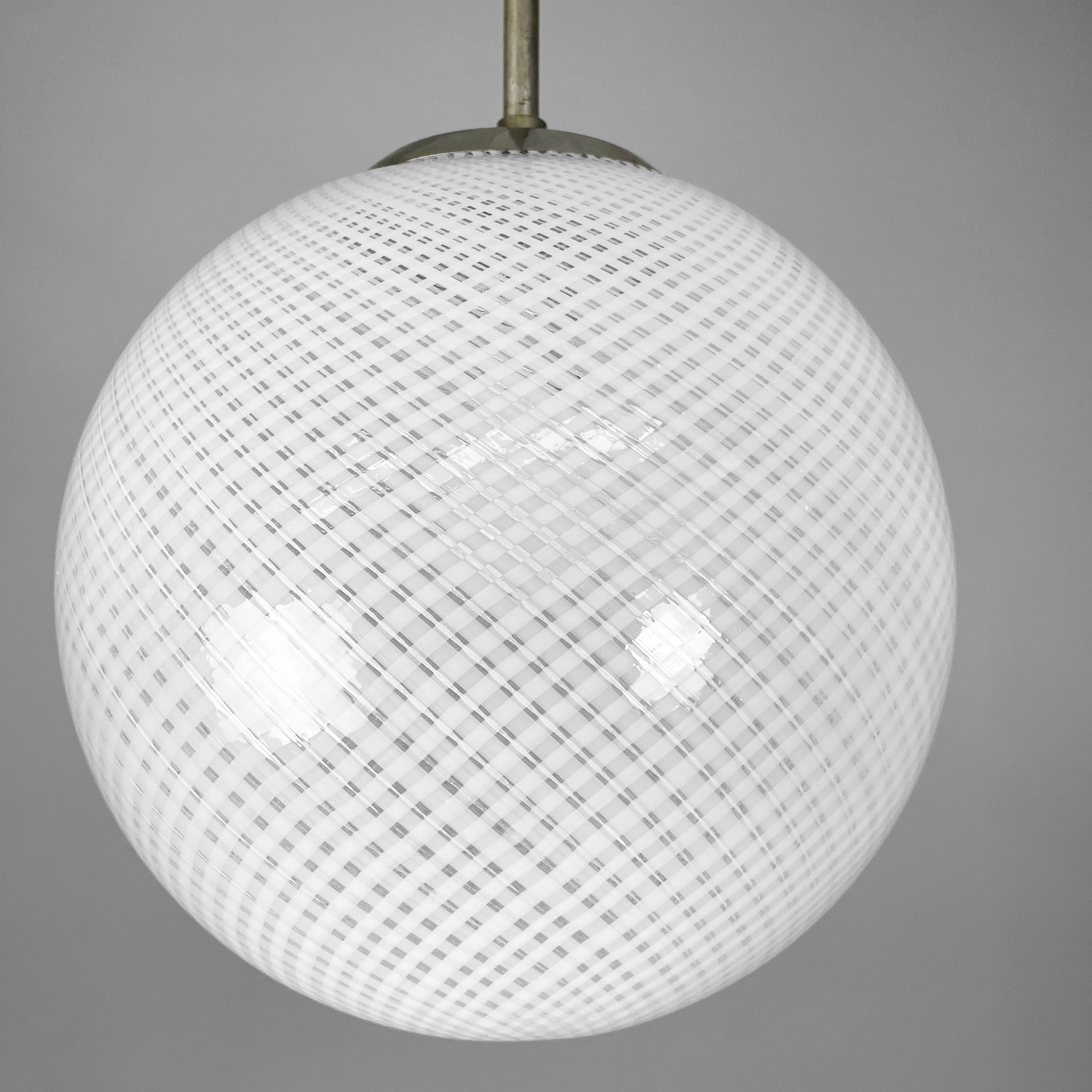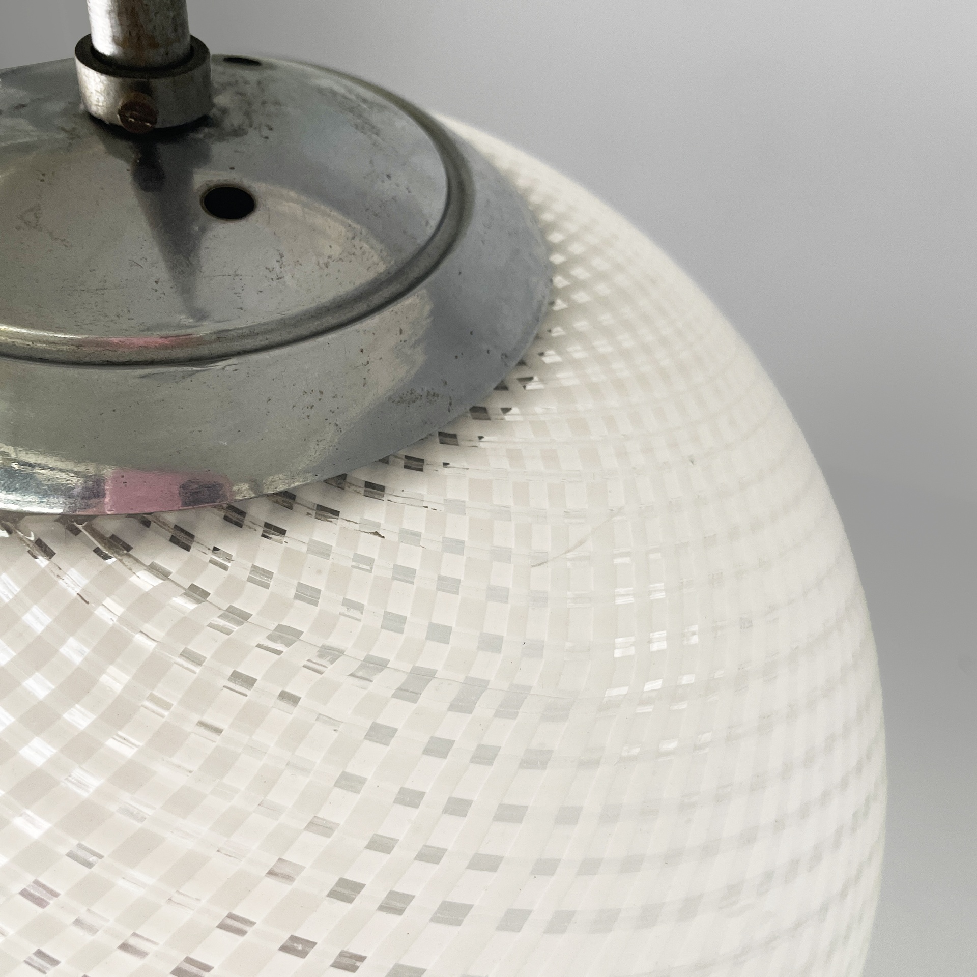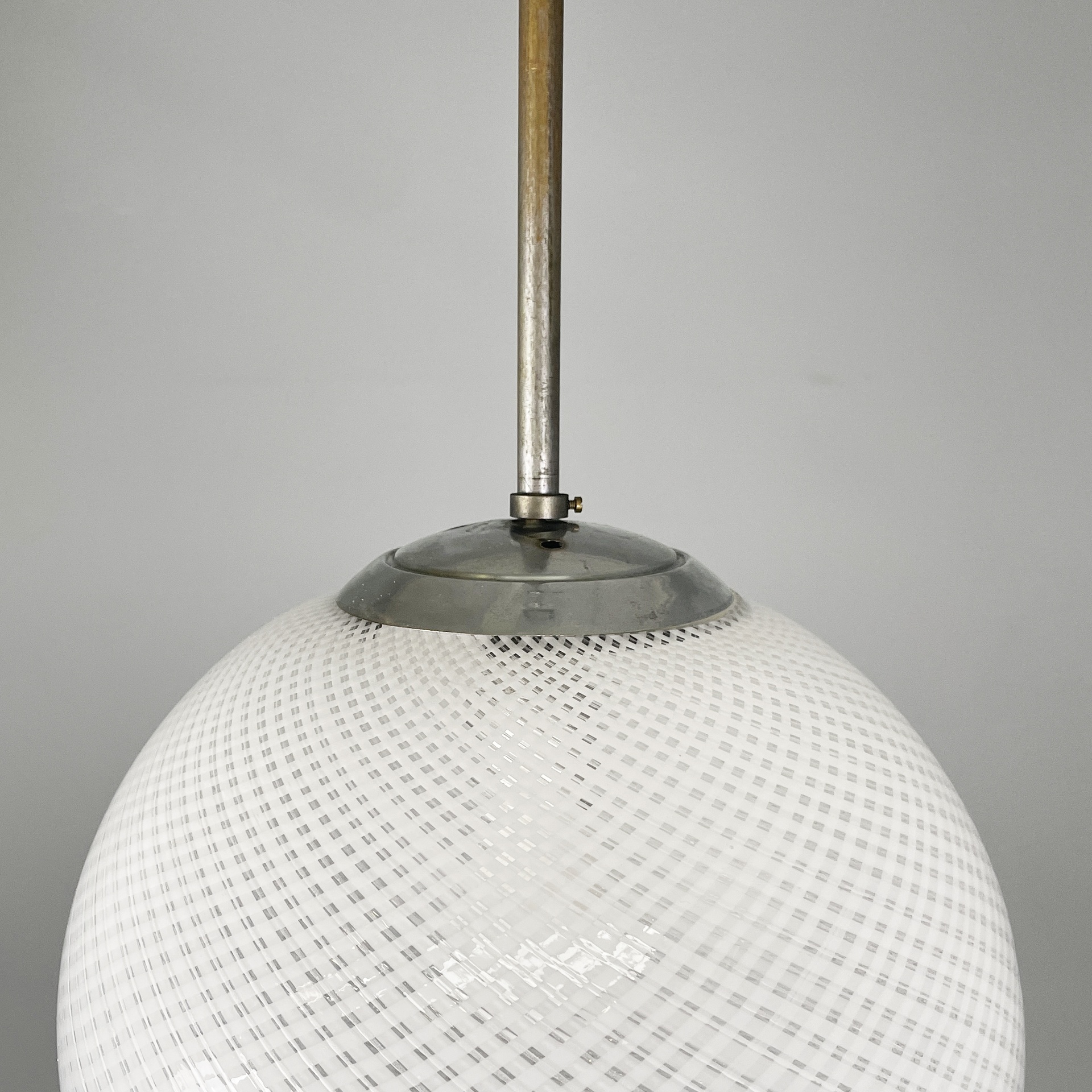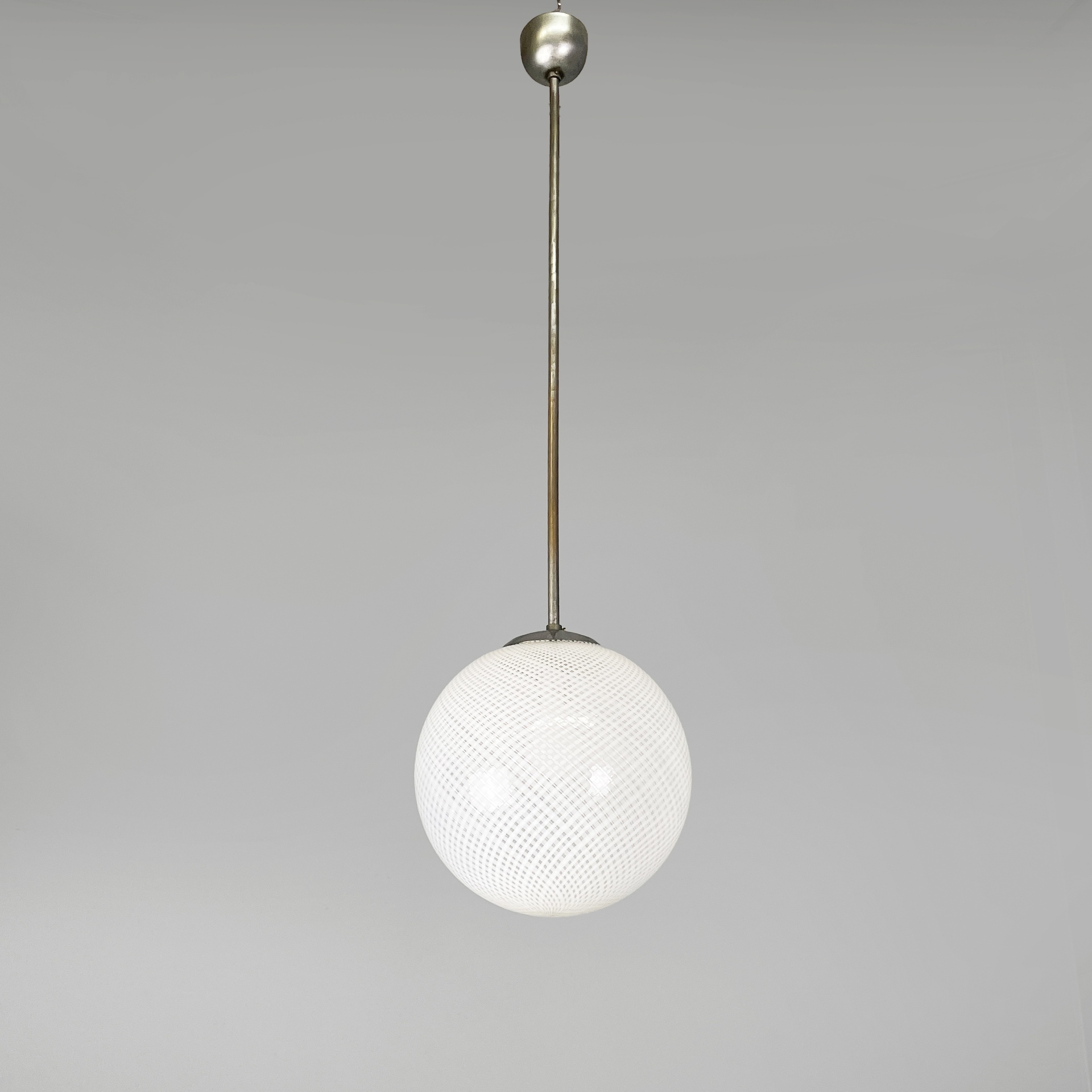 Lampadario con diffusore in vetro di Murano reticello-zanfirico, infatti il vetro presenta una lavorazione a righe bianche incrociate. La struttura centrale è in tondino di alluminio con attacco a soffitto in alluminio a cupola. Art Deco.