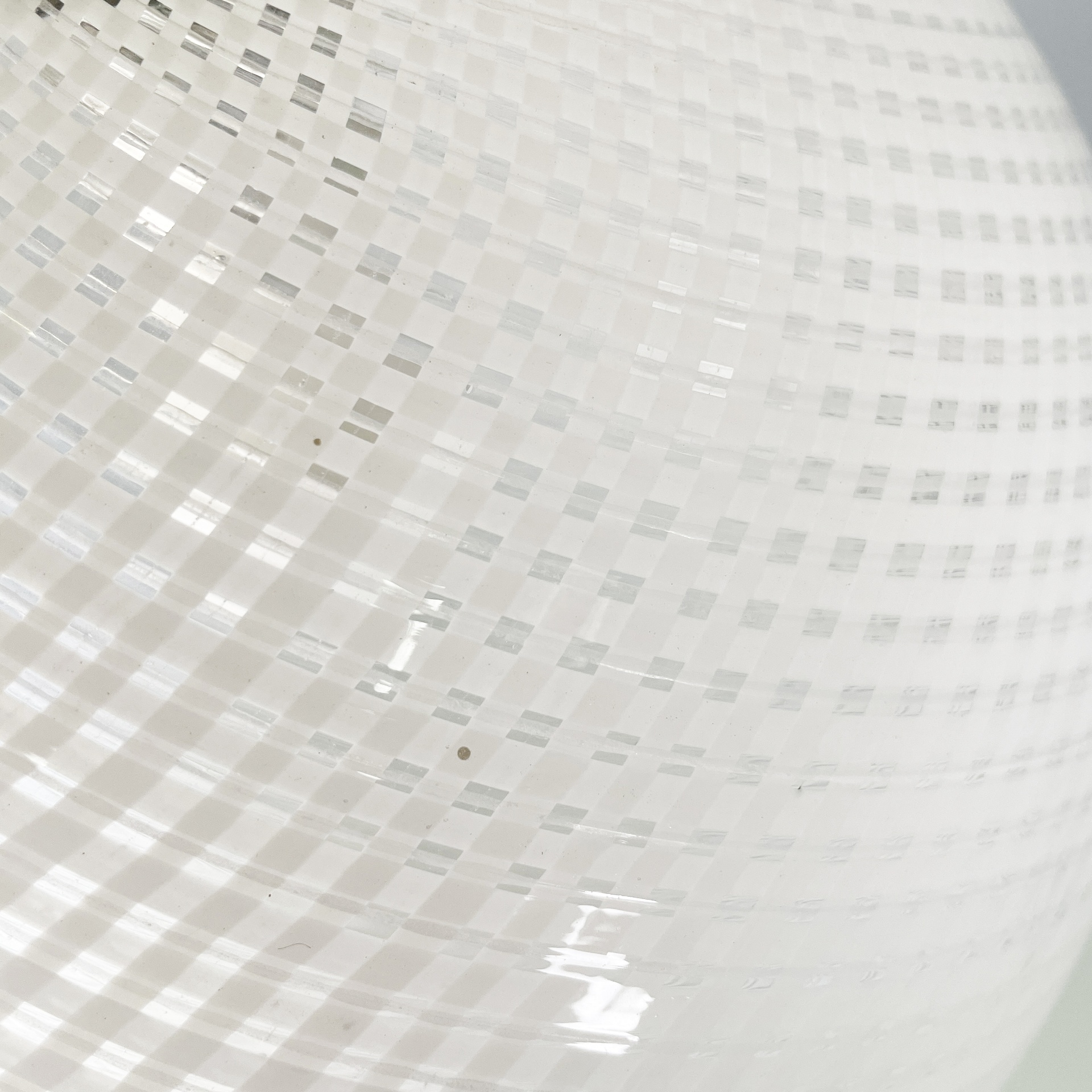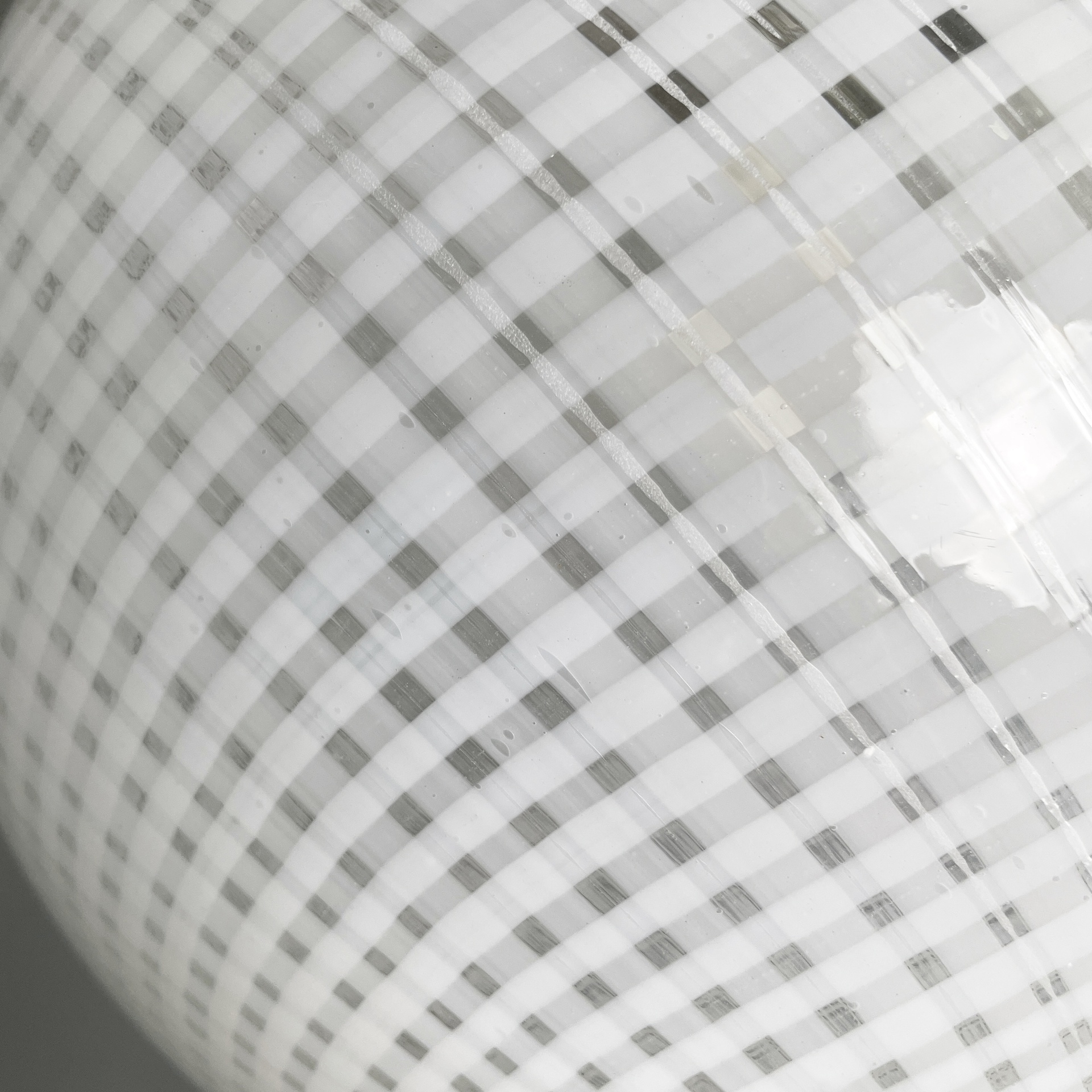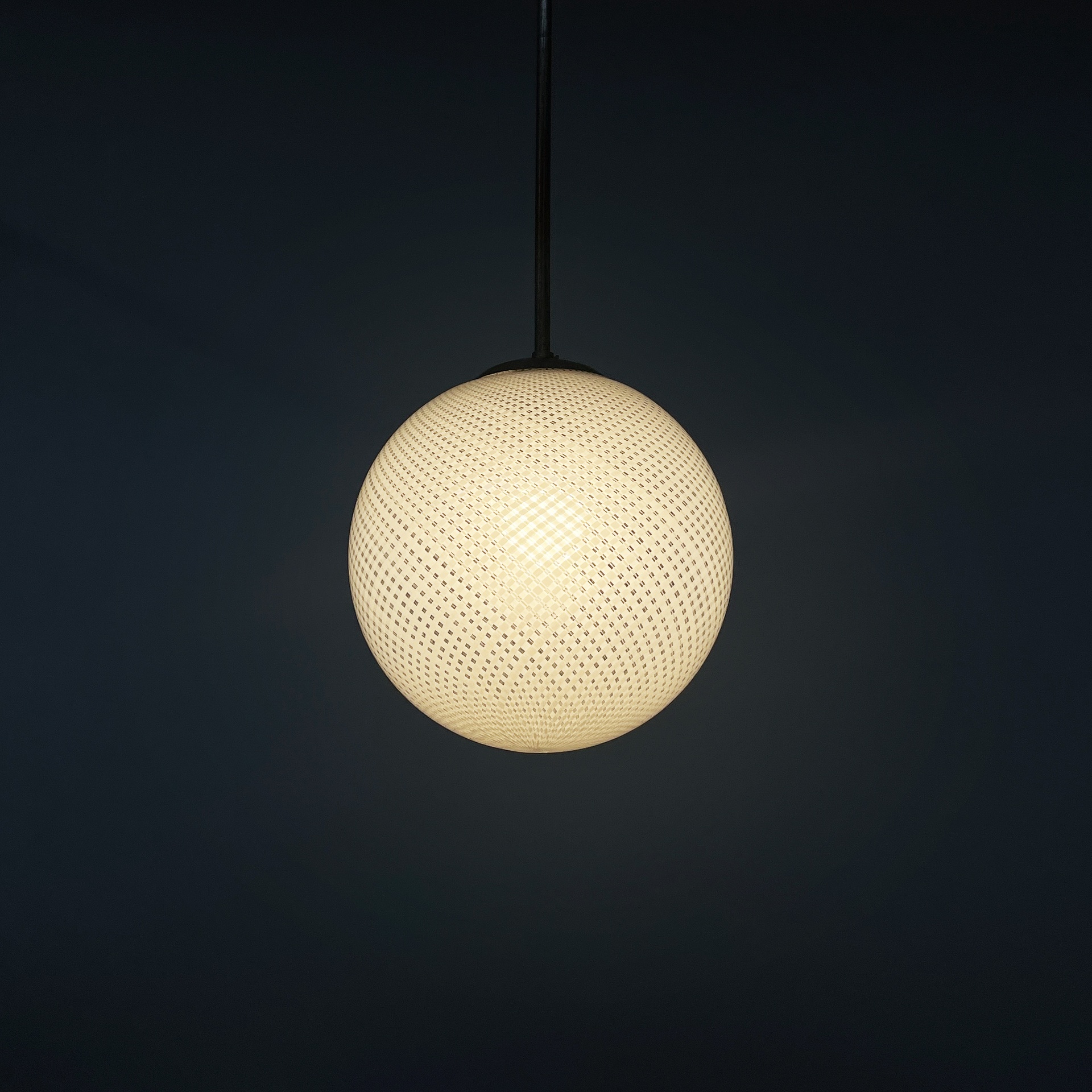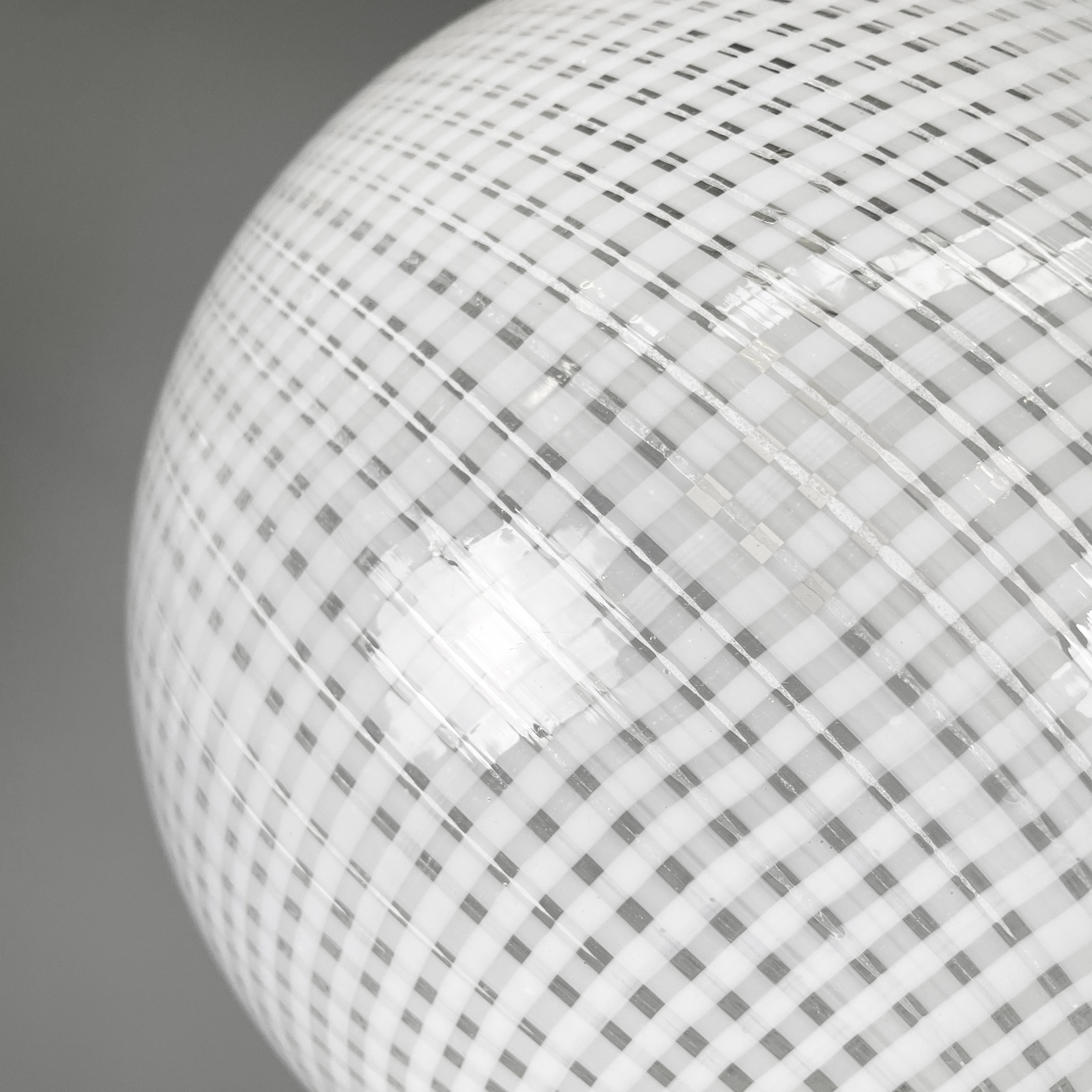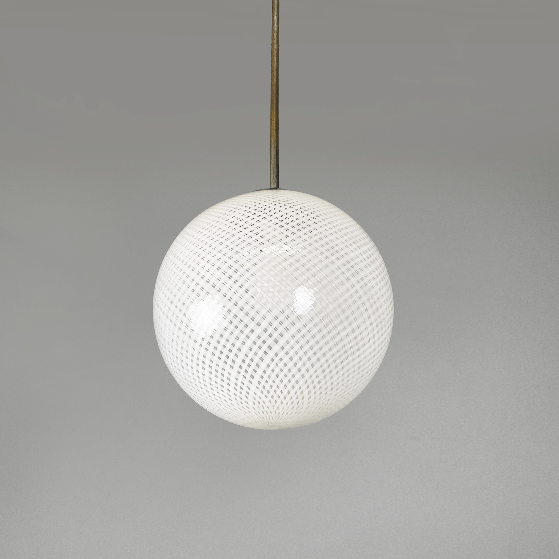 Lampadario con diffusore in vetro di Murano reticello-zanfirico, infatti il vetro presenta una lavorazione a righe bianche incrociate. La struttura centrale è in tondino di alluminio con attacco a soffitto in alluminio a cupola. Art Deco.