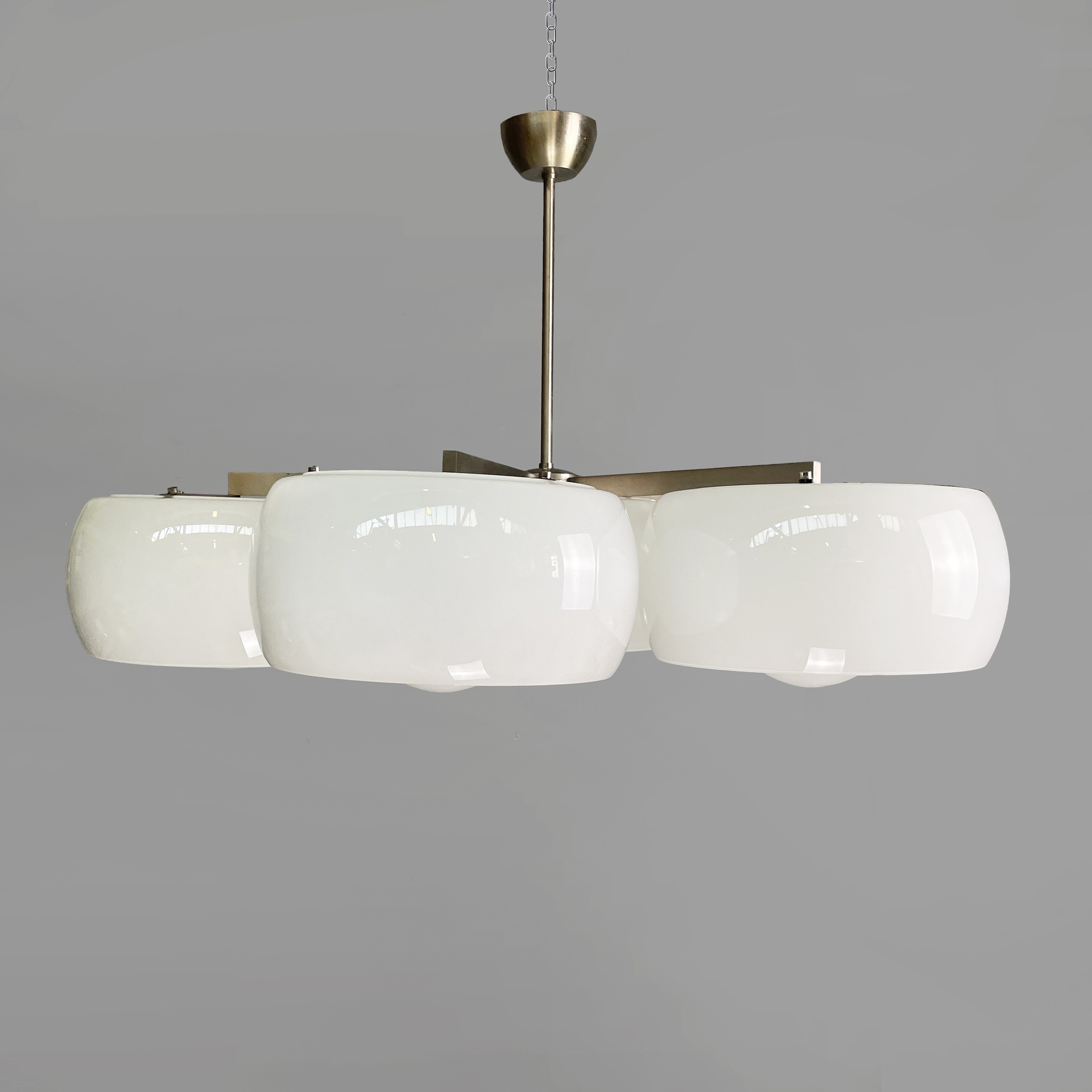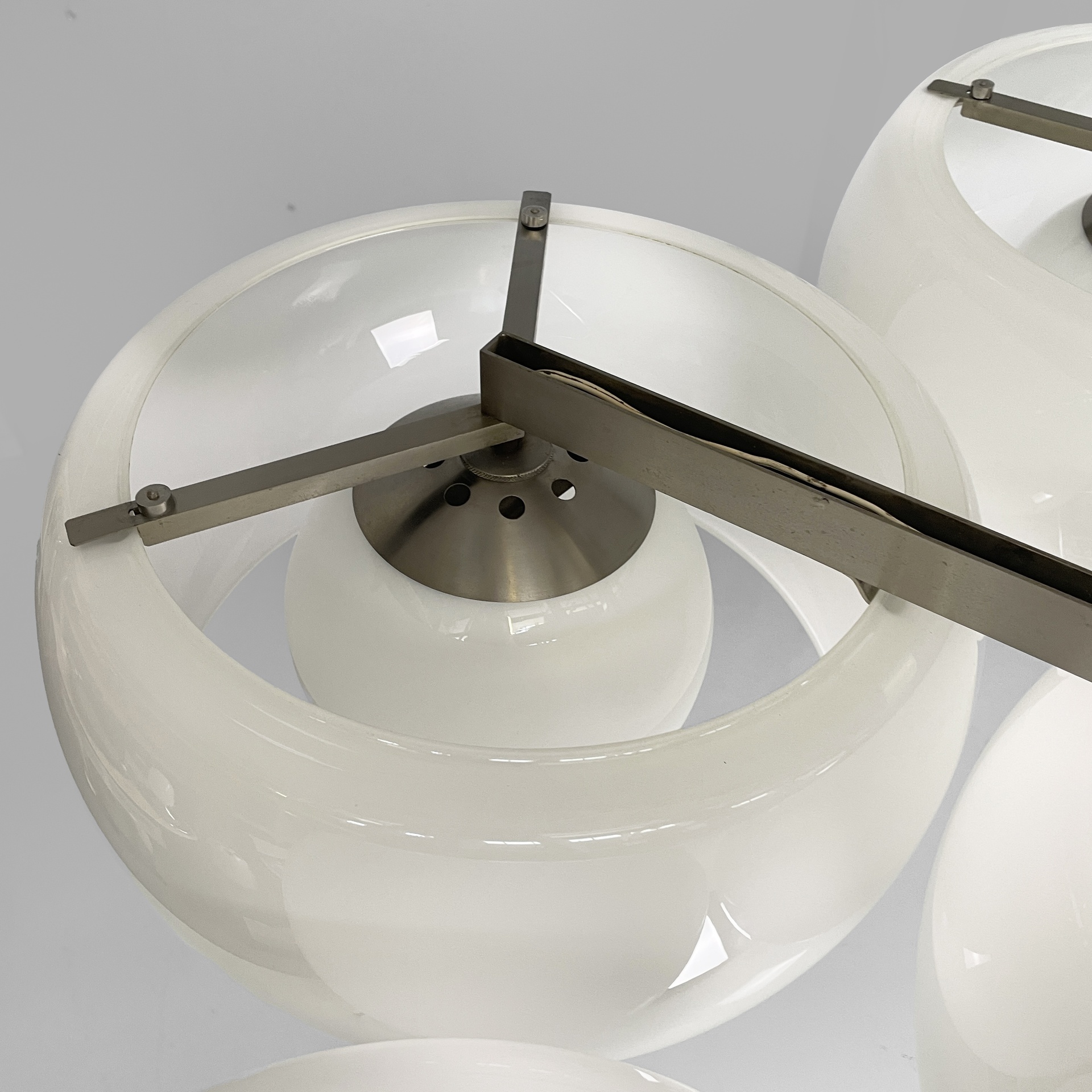 Lampadario modello Eptaclinio con sette diffusori in vetro opalino. Ogni diffusore cilindrico presenta una sfera interna, dove è posizionata la lampadina. La struttura del lampadario è in ottone nichelato con stelo centrale e sei bracci, ognuno provvisto di due ganci a cui si ancorano i diffusori esterni e il portalampada.