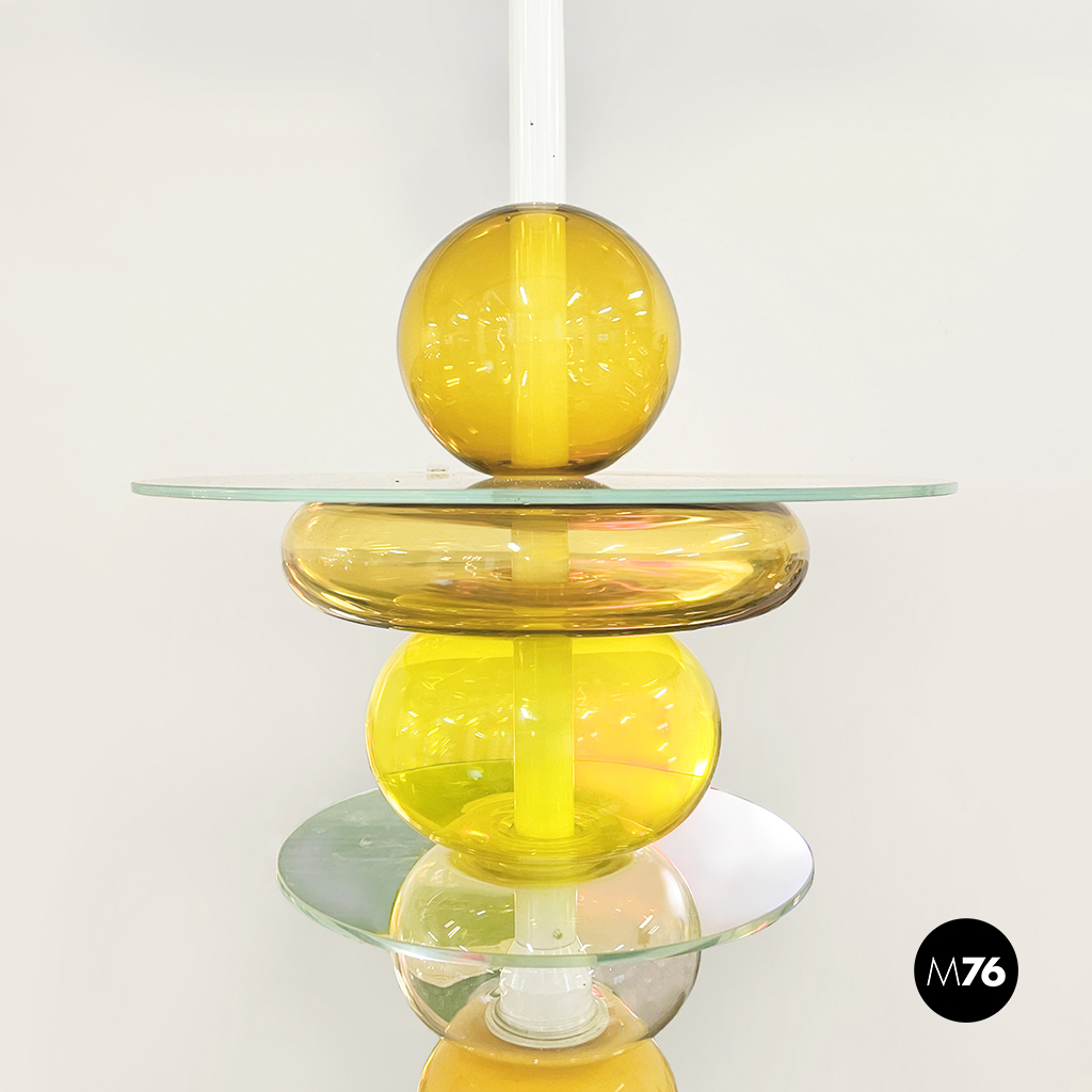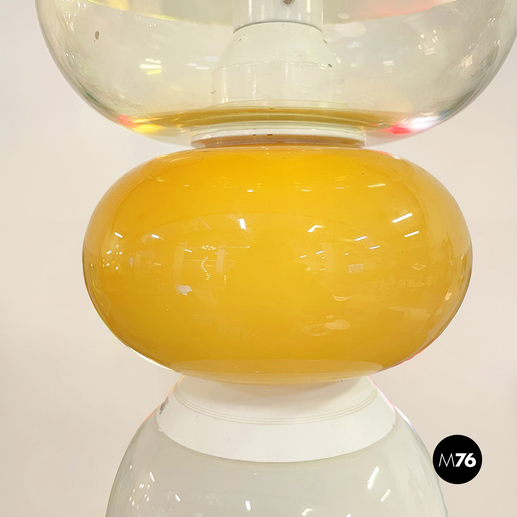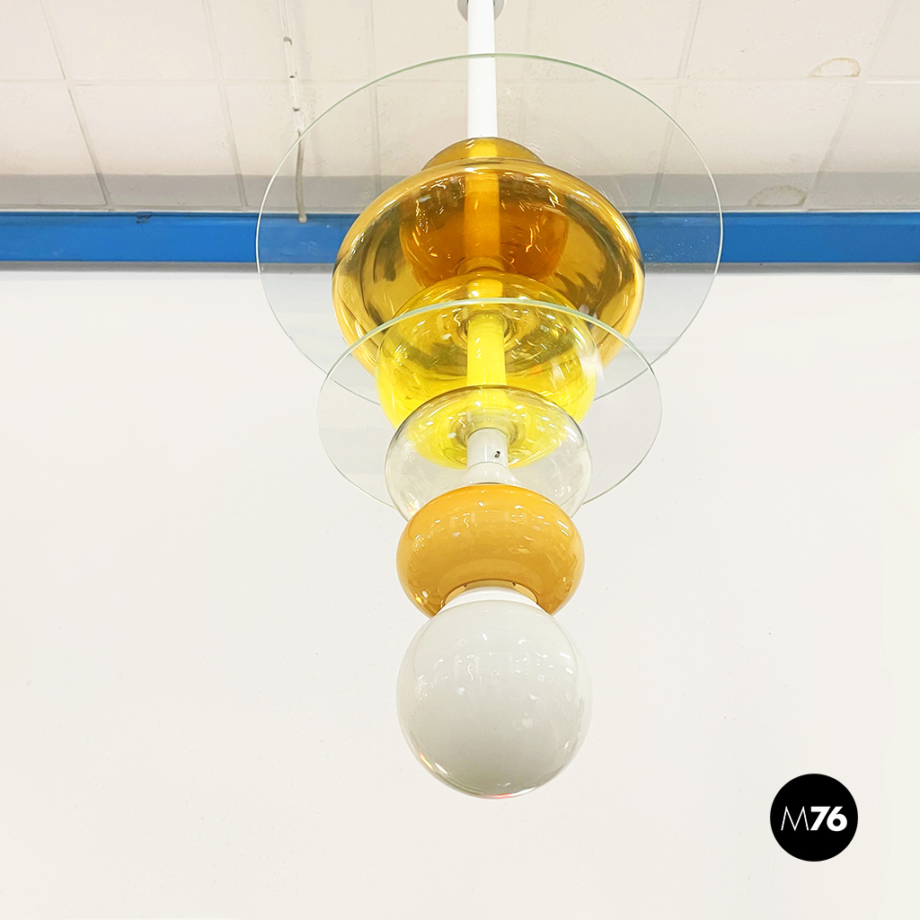 Lampadario modello Firenze composto da una serie di sfere in vetro trasparente e giallo, intervallati di dischi tondi in vetro. Struttura in metallo verniciato bianco.