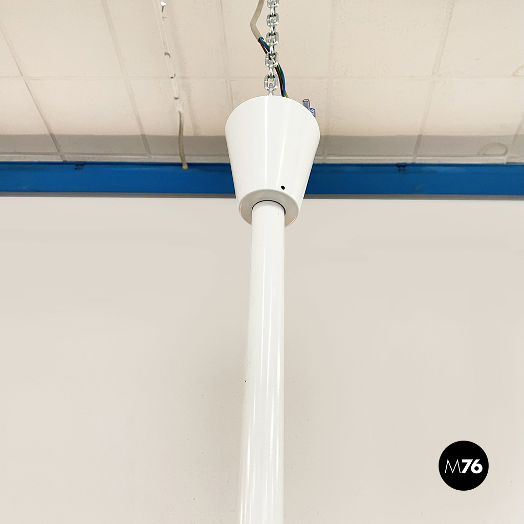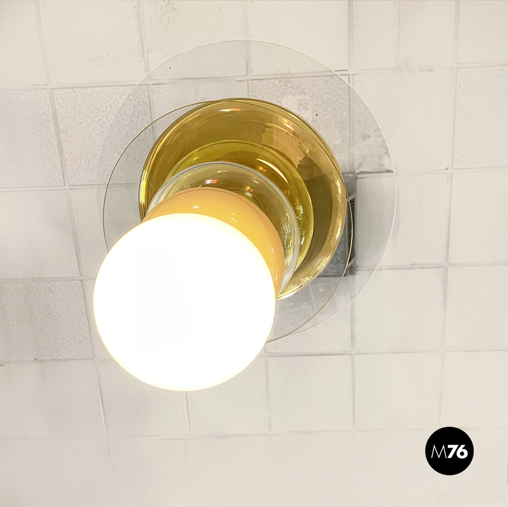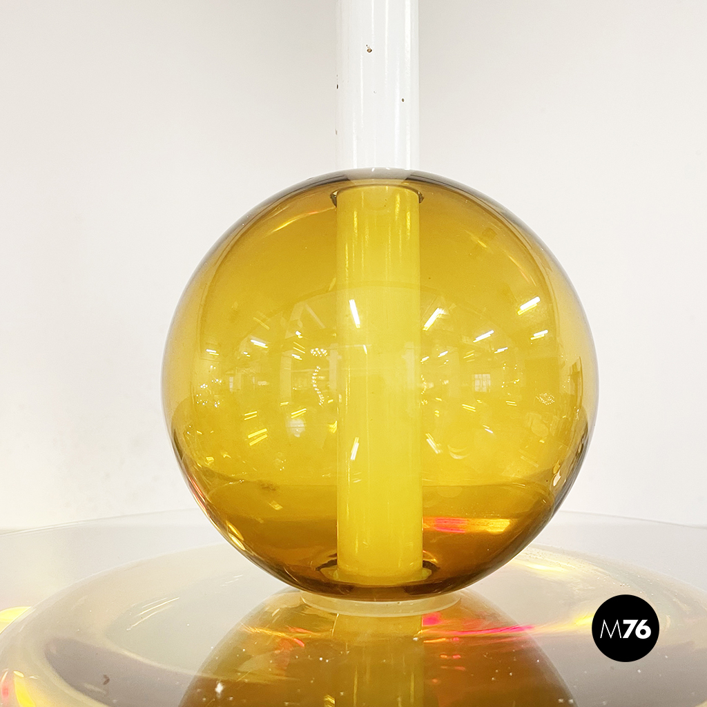 Lampadario modello Firenze composto da una serie di sfere in vetro trasparente e giallo, intervallati di dischi tondi in vetro. Struttura in metallo verniciato bianco.