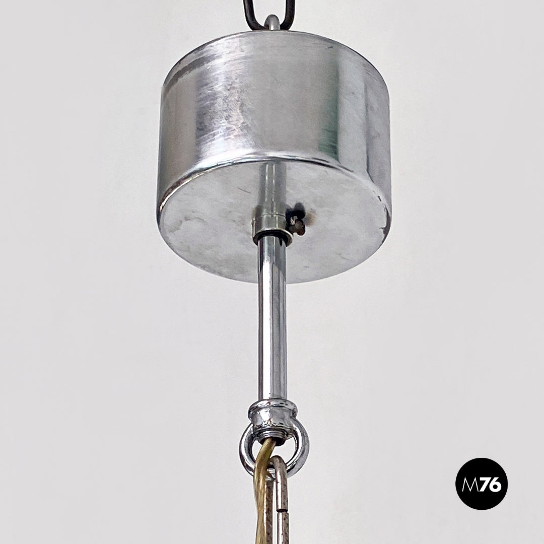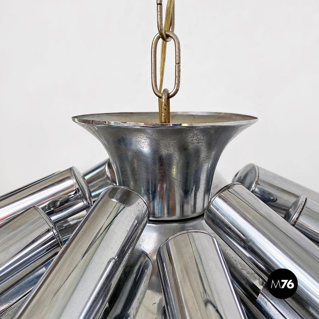 Lampadario in acciaio cromato a dodici luci nella parte terminale della struttura formata da dodici cilindri e stelo a catena originale dell’epoca.