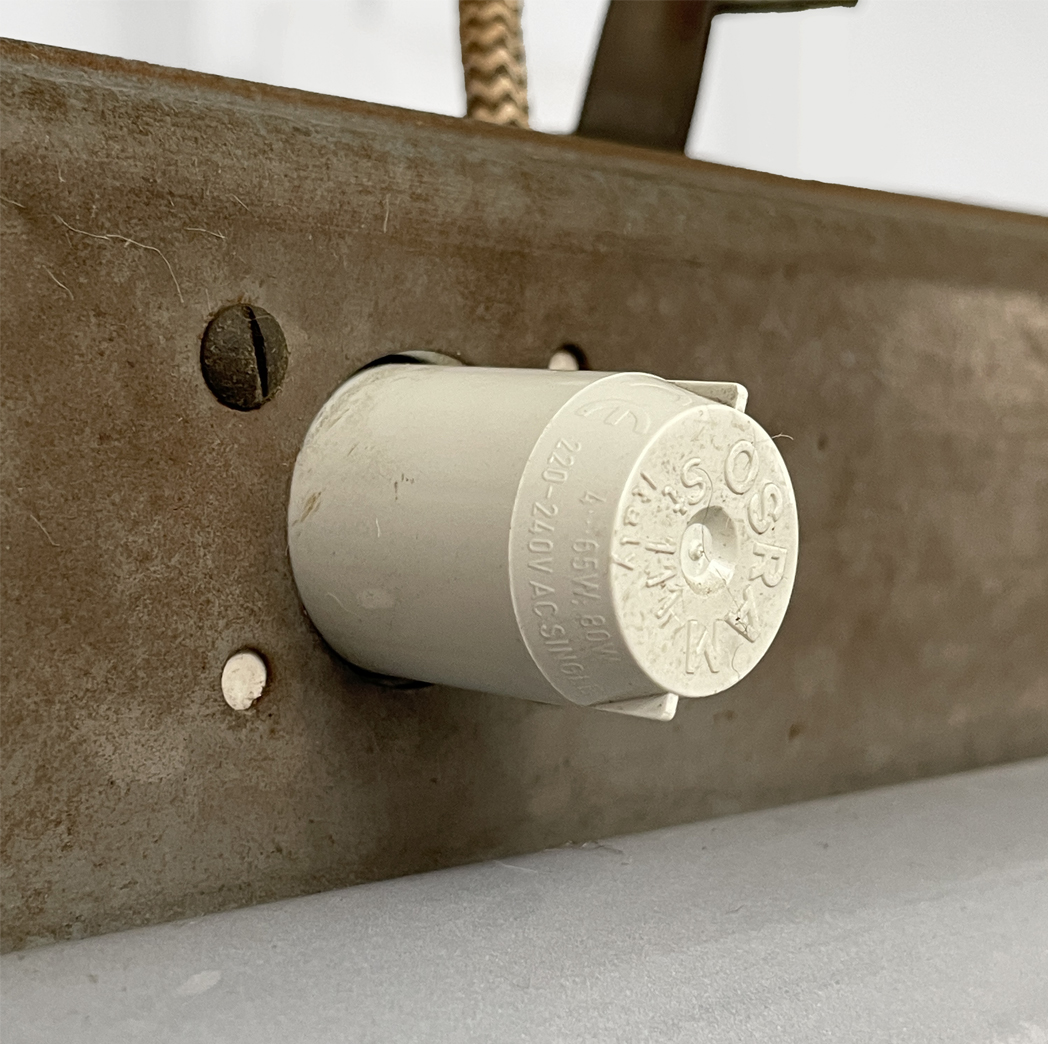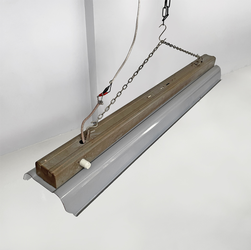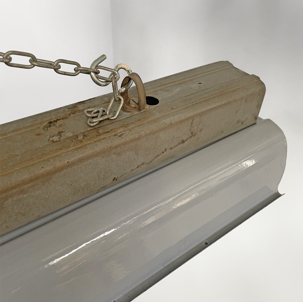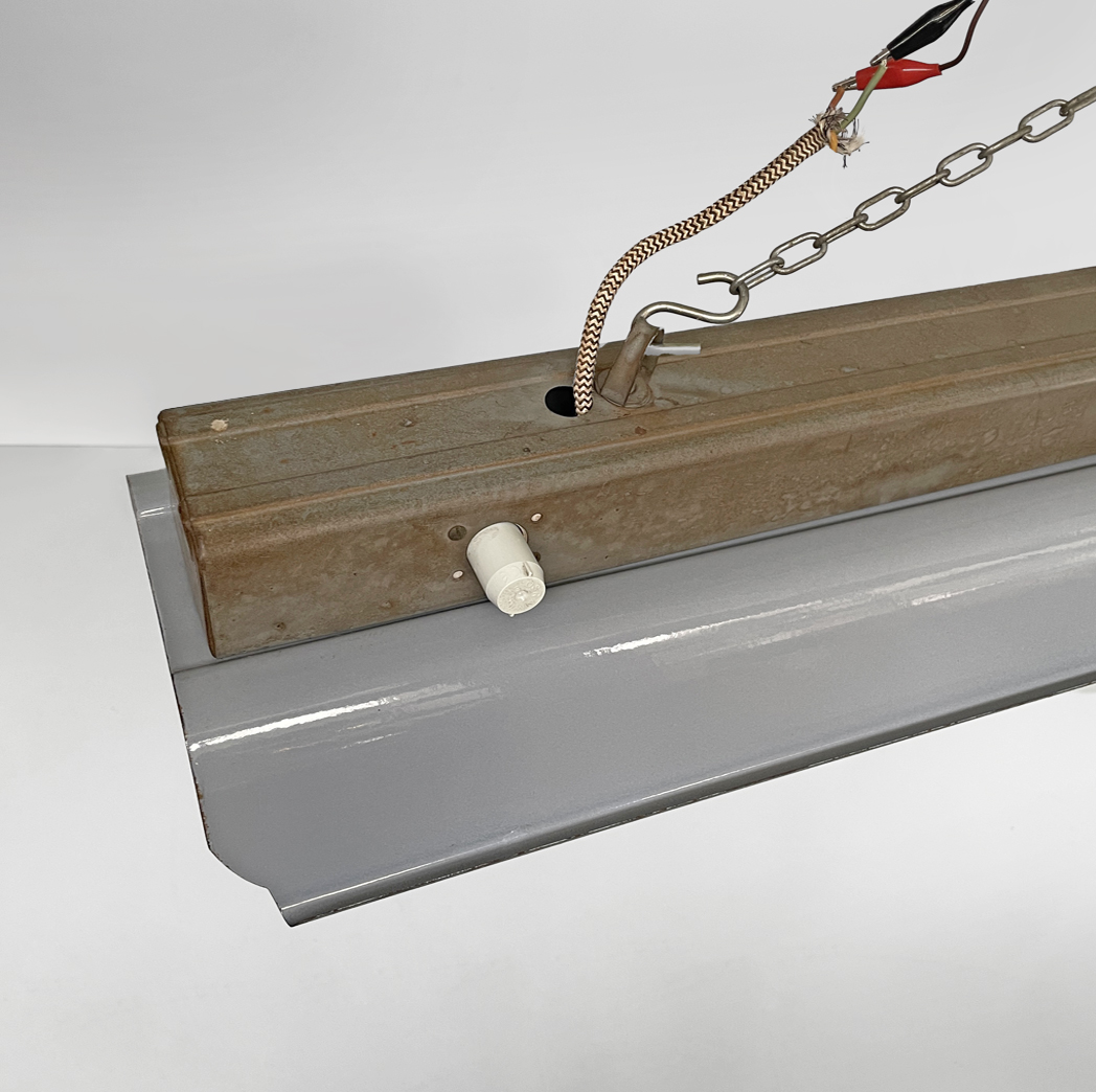 Lampadario industriale di forma rettangolare in metallo smaltato grigio scuro con catenina per la sospensione abbinata.
