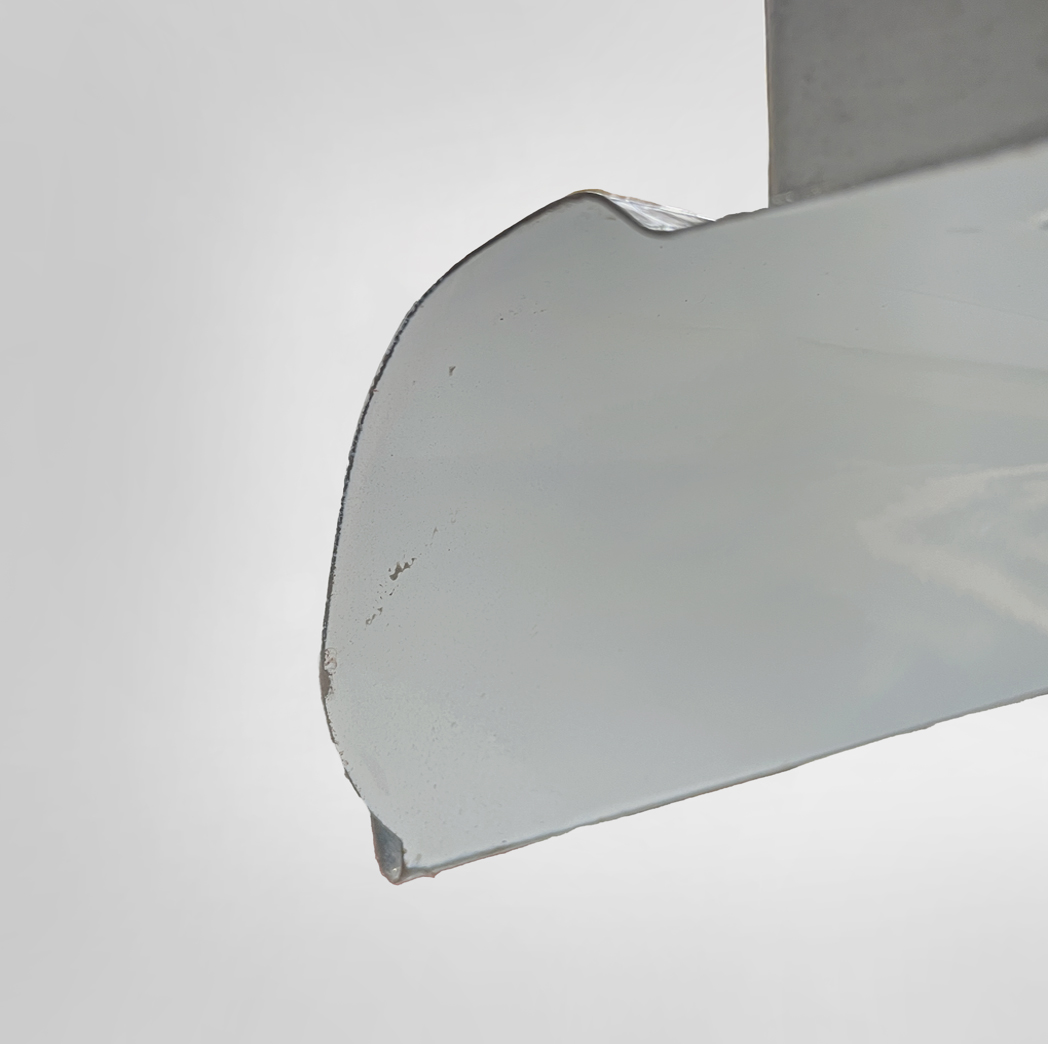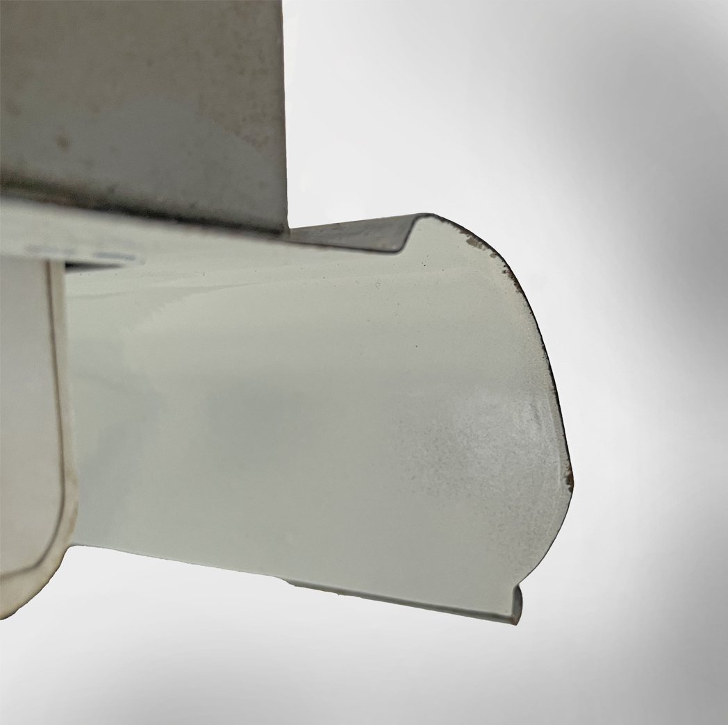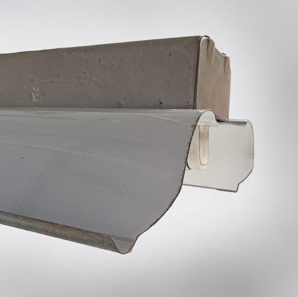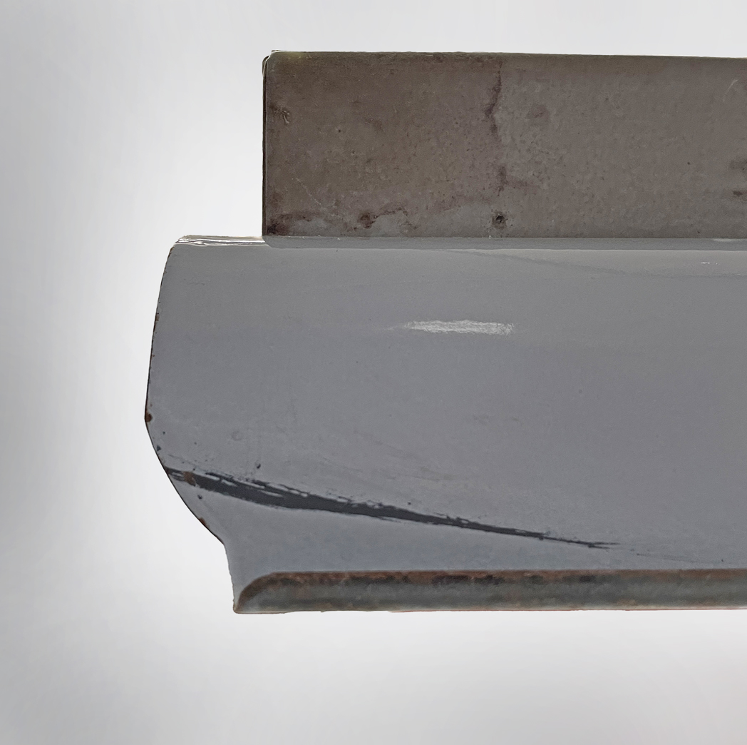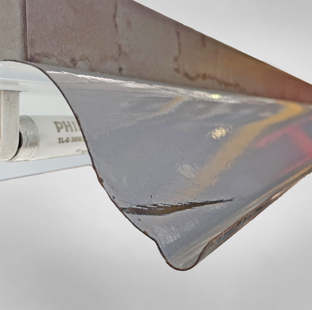 Lampadario industriale di forma rettangolare in metallo smaltato grigio scuro con catenina per la sospensione abbinata.