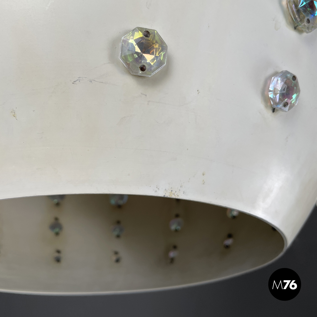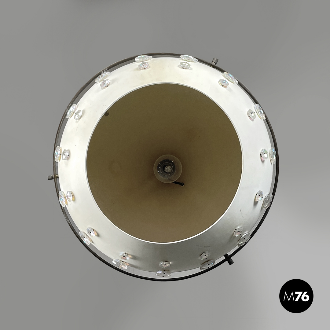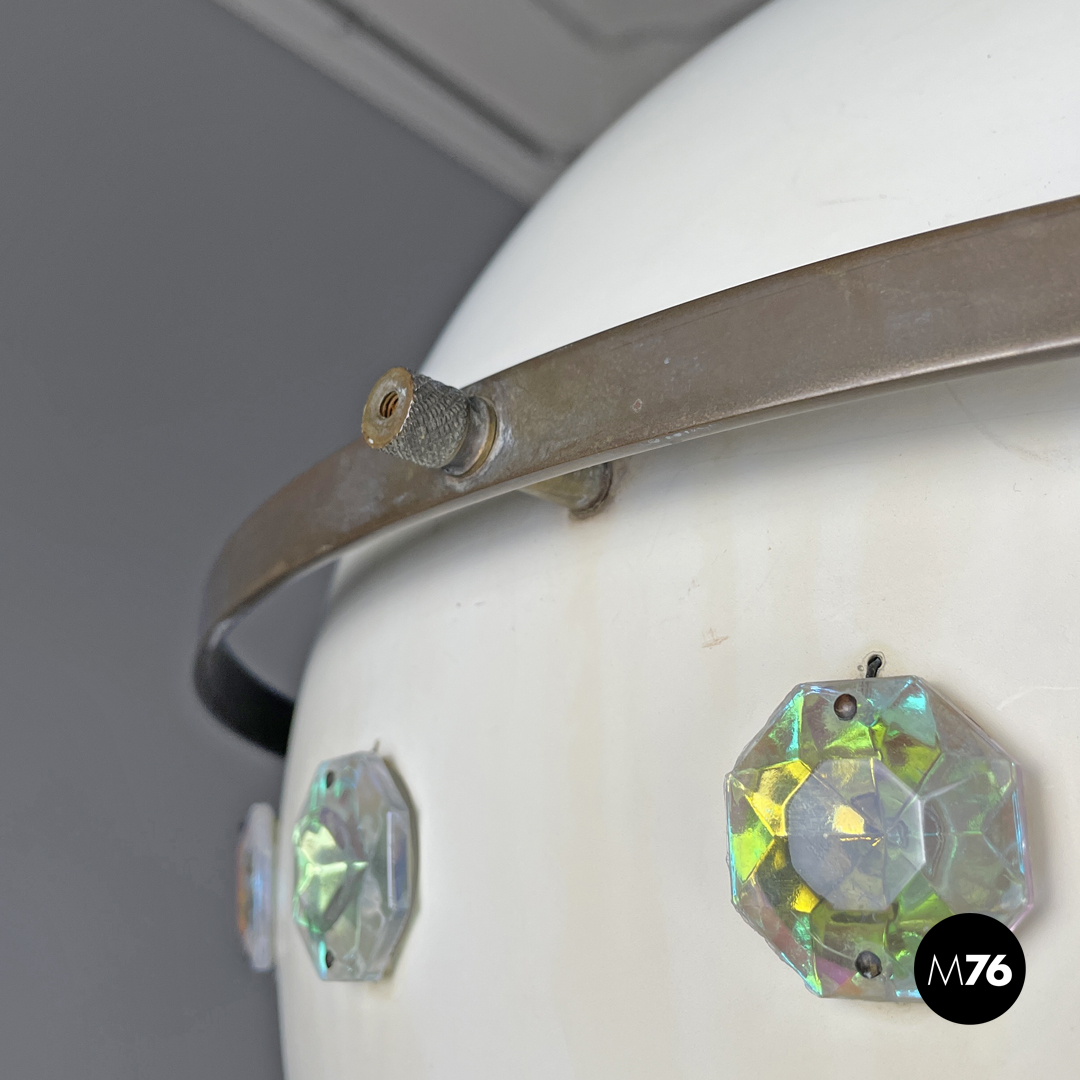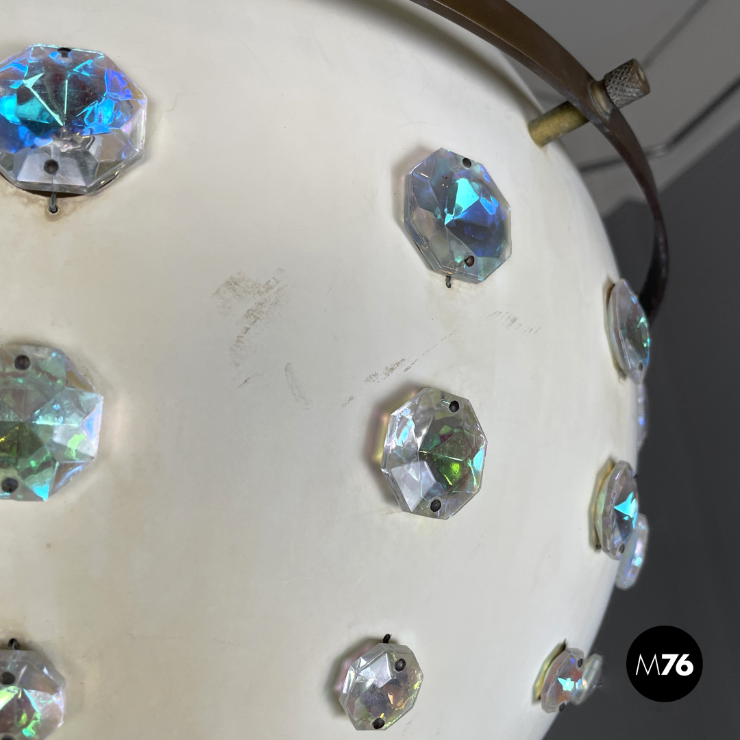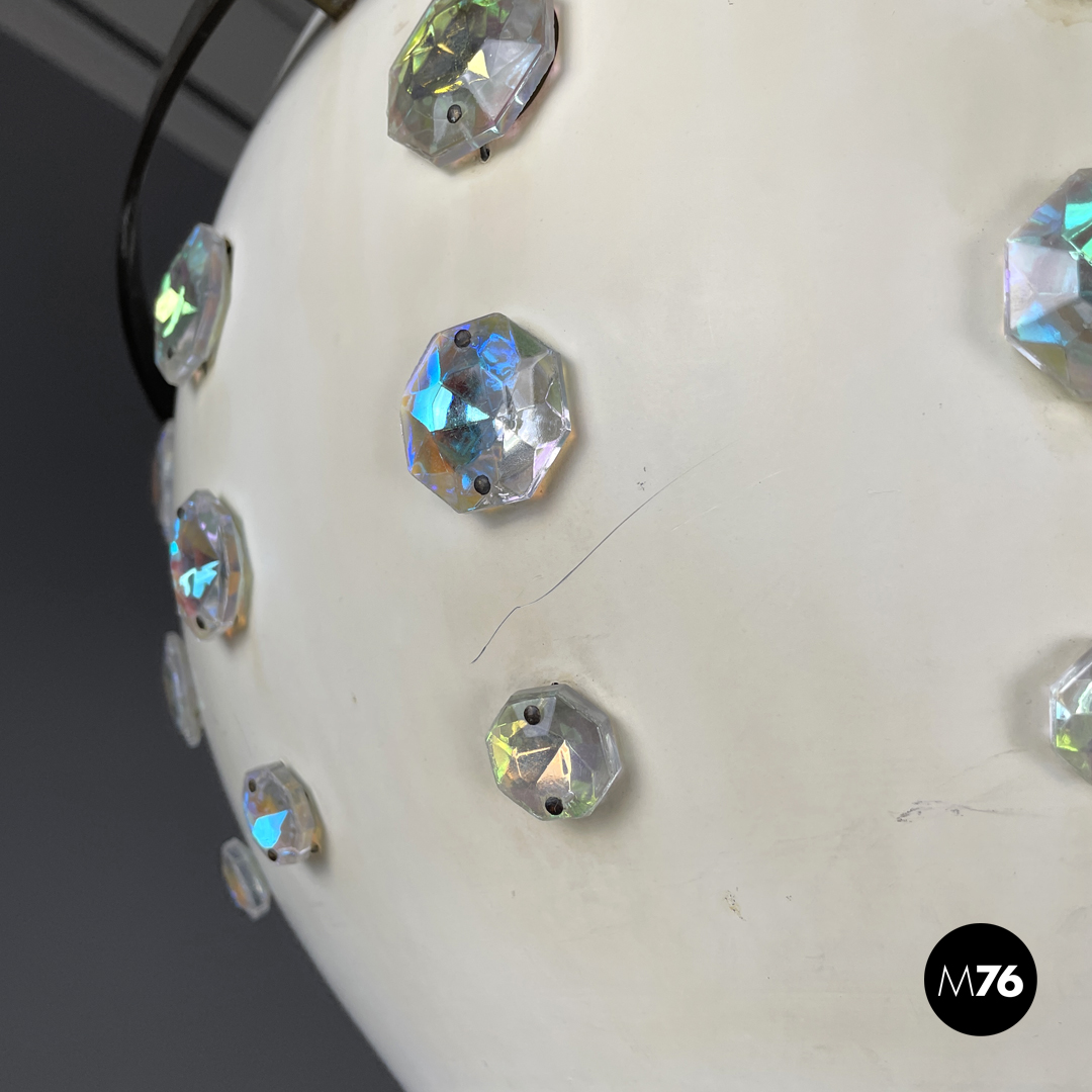 Lampadario tondo in metallo. La struttura sferica in metallo è verniciata di bianco, nella parte bassa presenta tre file di applicazioni decorative in vetro sfaccettato con riflesso multicolore sui toni del rosa e dell’azzurro. Nella parte alta si trova un cerchio in ottone più largo e collegato alla struttura tramite dei distanziatori. L’attacco al soffitto in ottone è a forma di cupola.