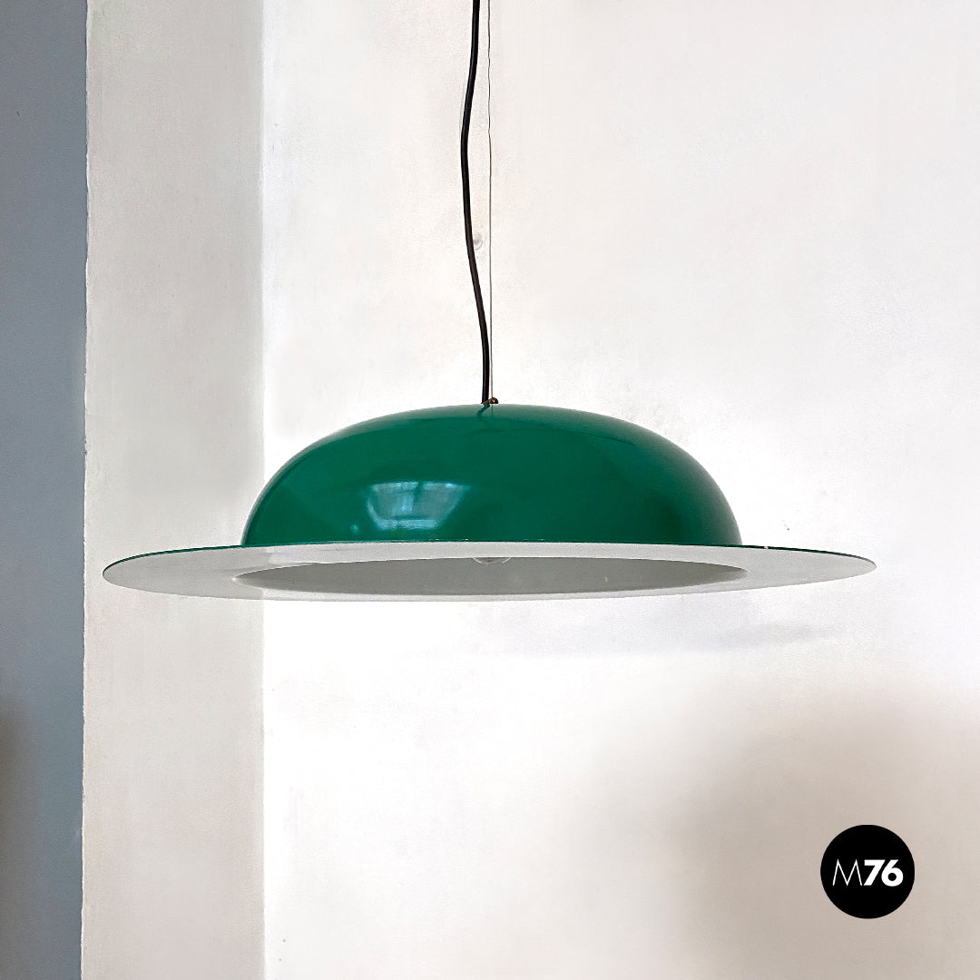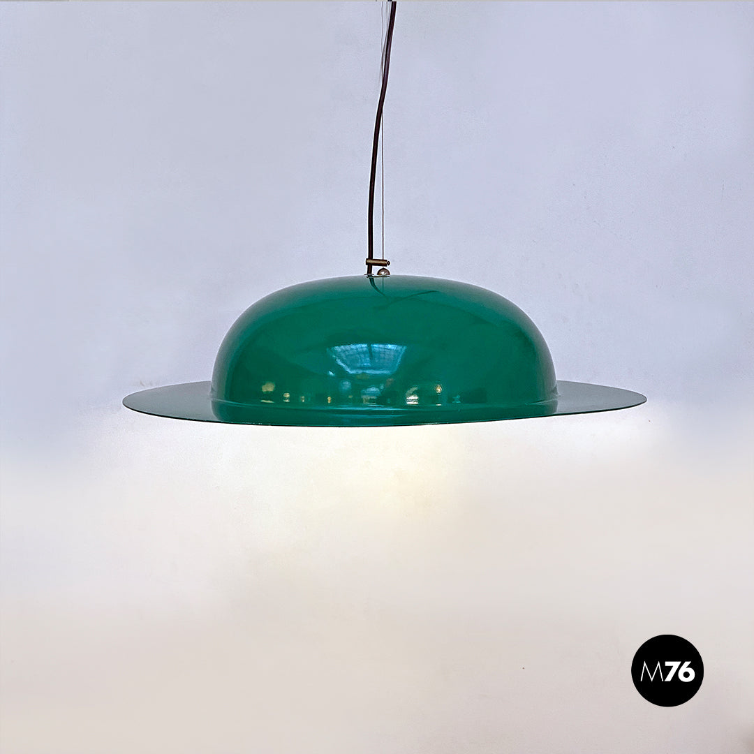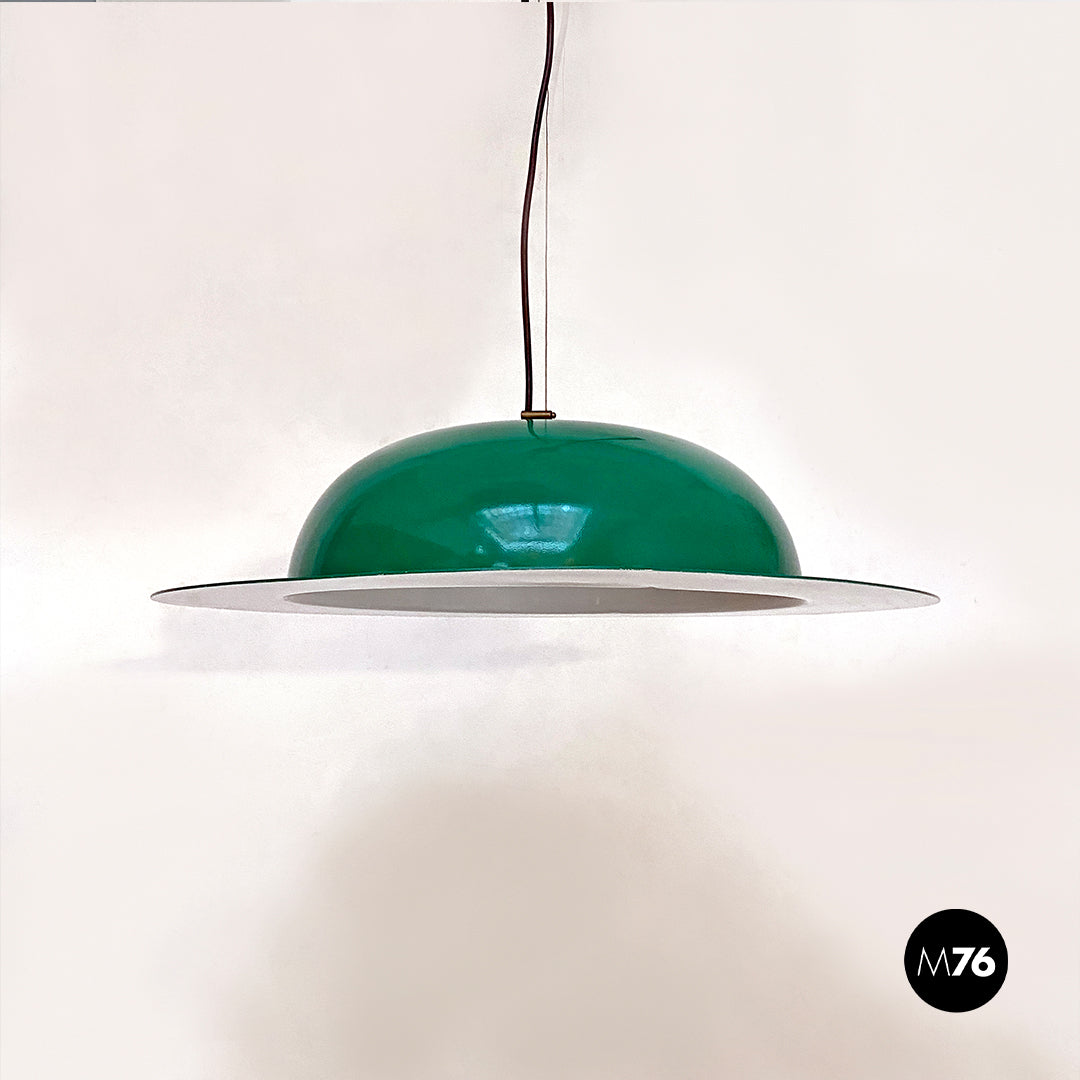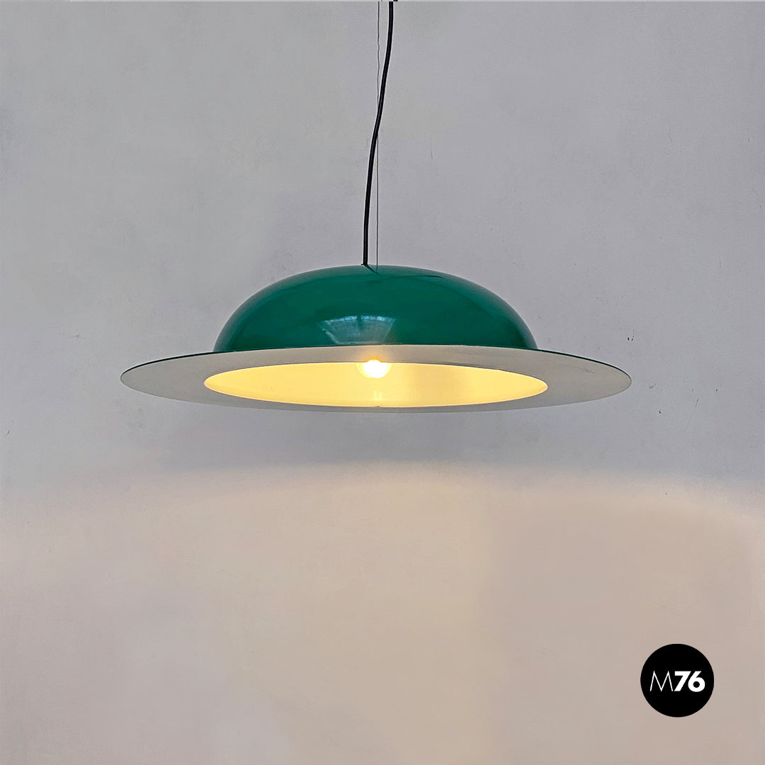 Lampadario a forma di cappello, in metallo verniciato verde lucido all’esterno e bianco opaco all’interno.