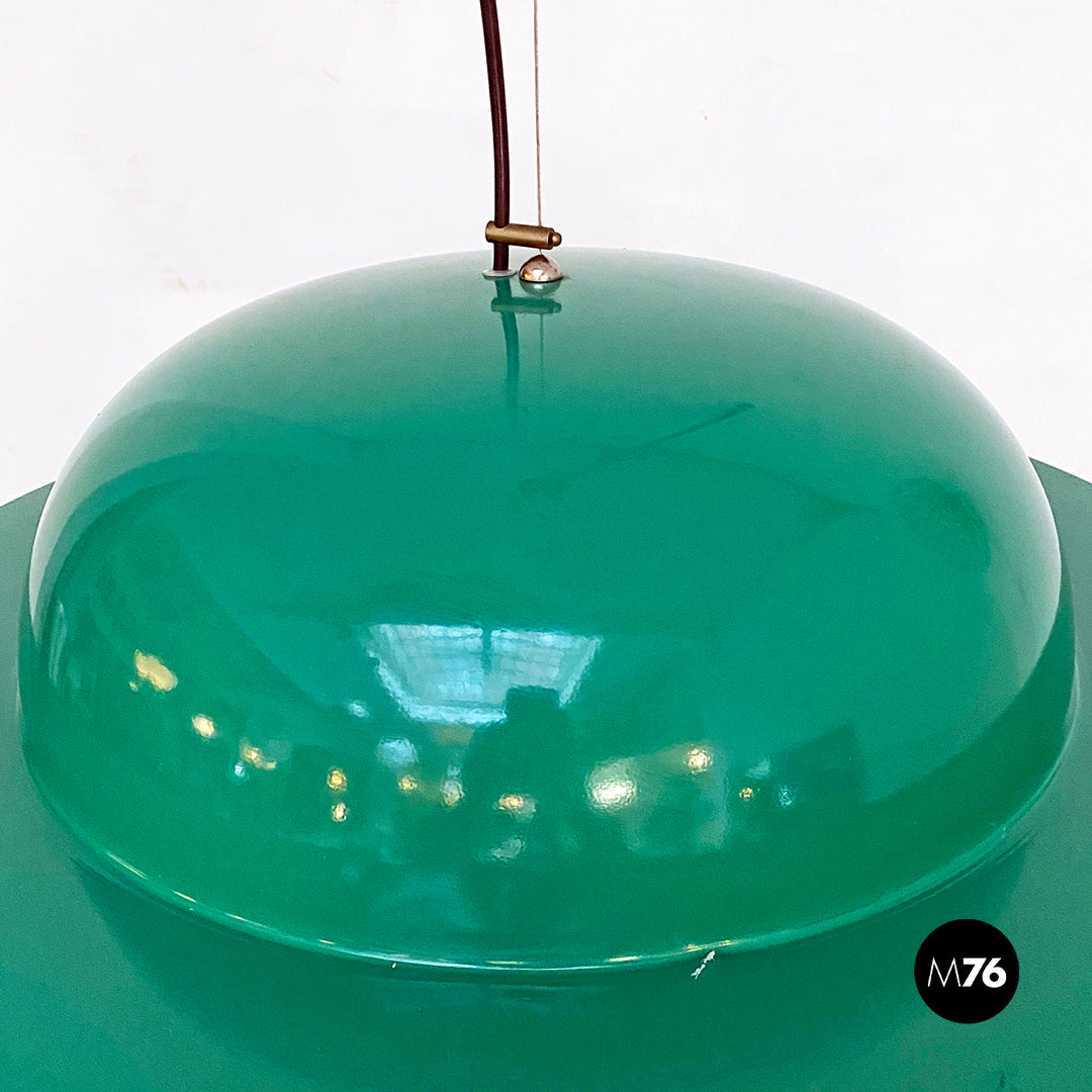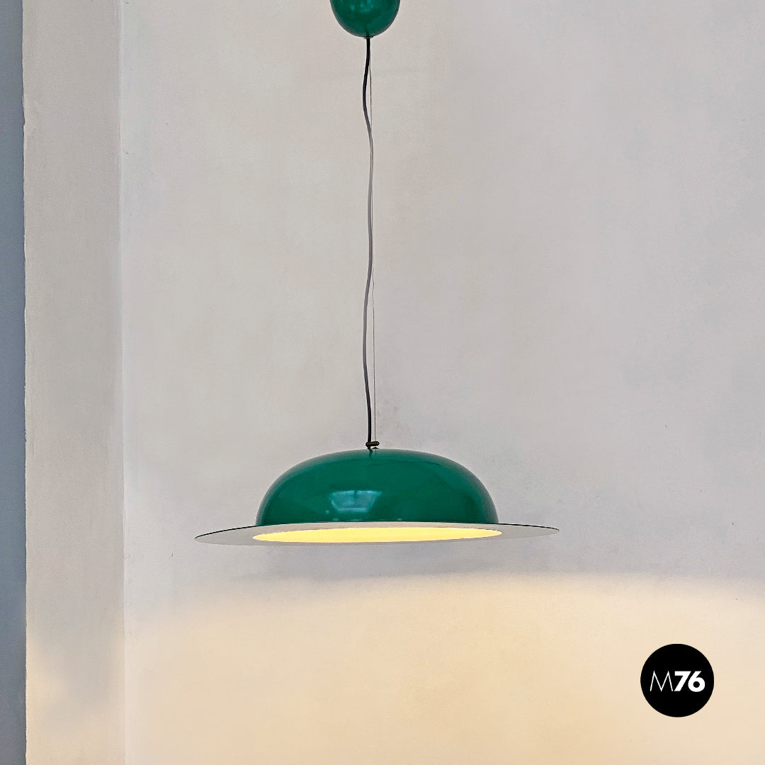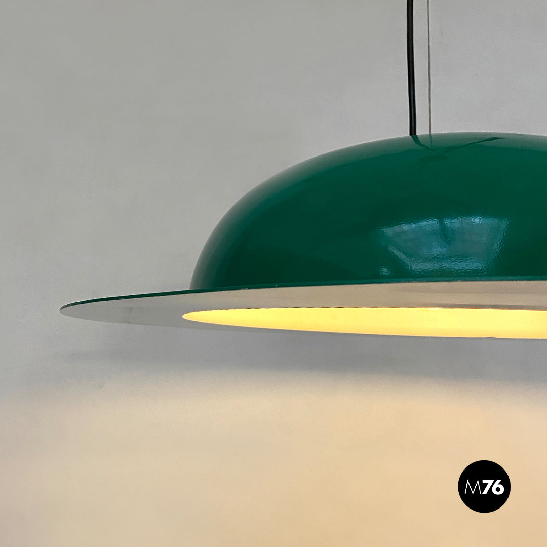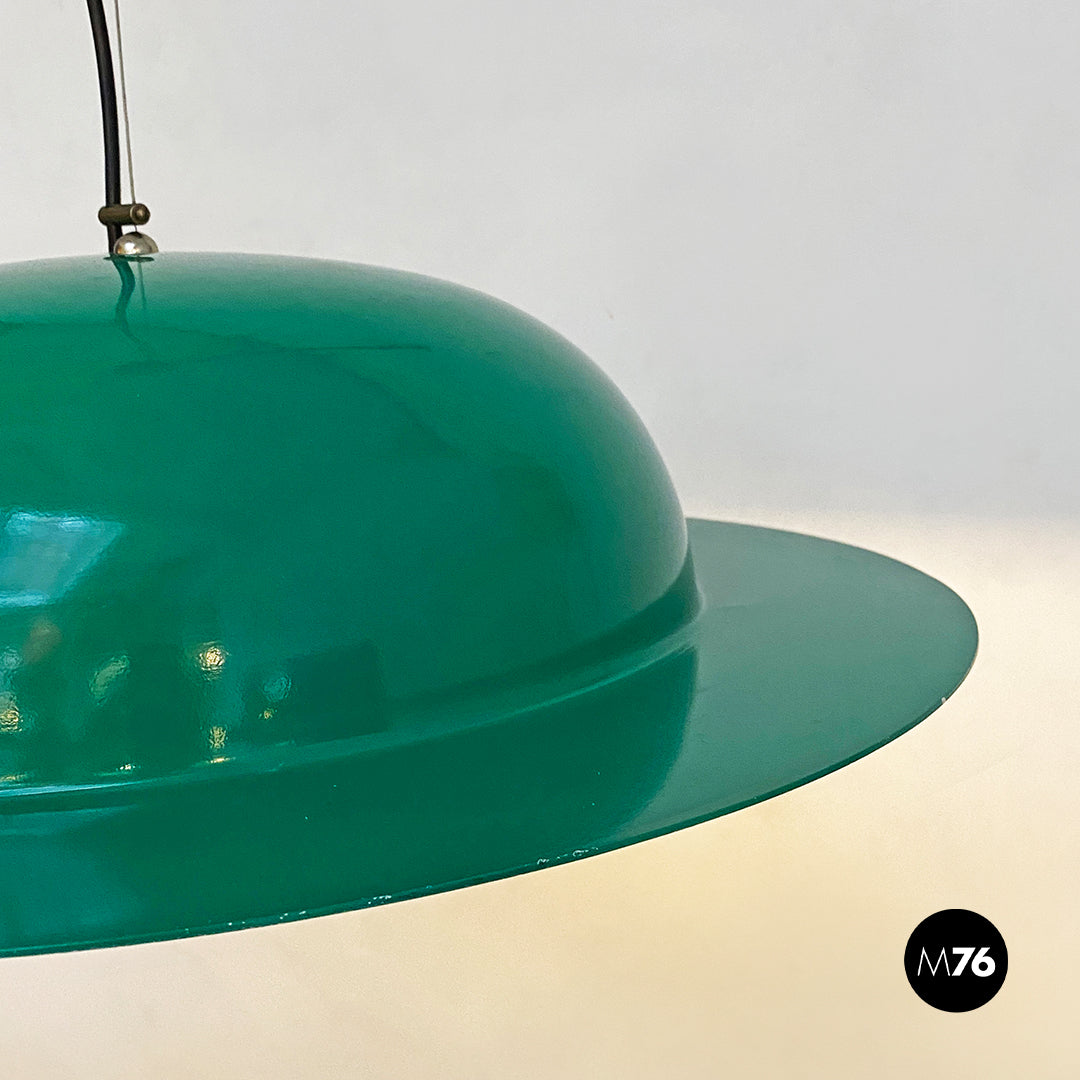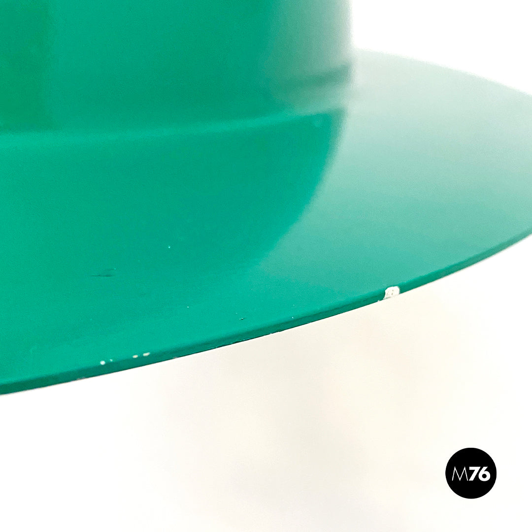 Lampadario a forma di cappello, in metallo verniciato verde lucido all’esterno e bianco opaco all’interno.