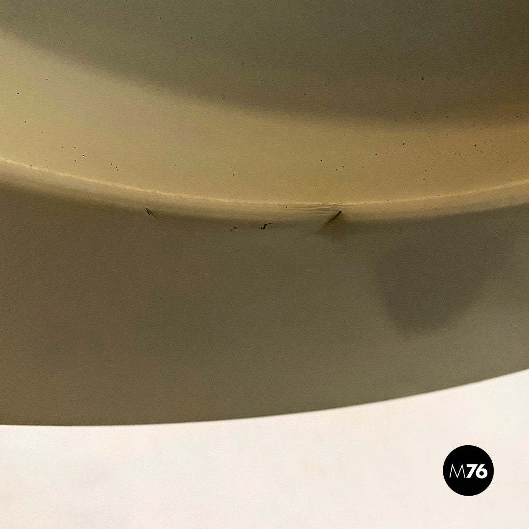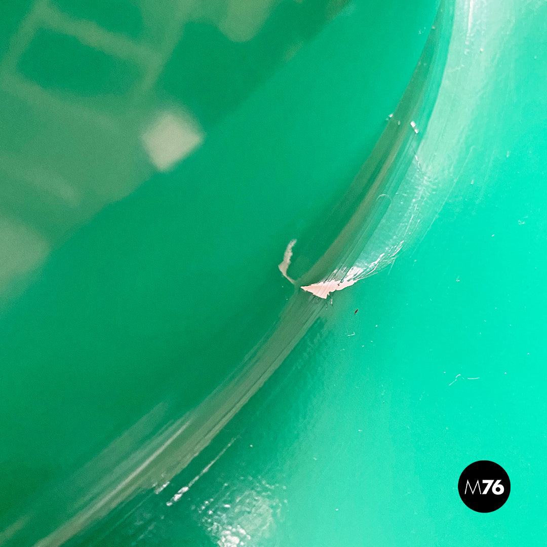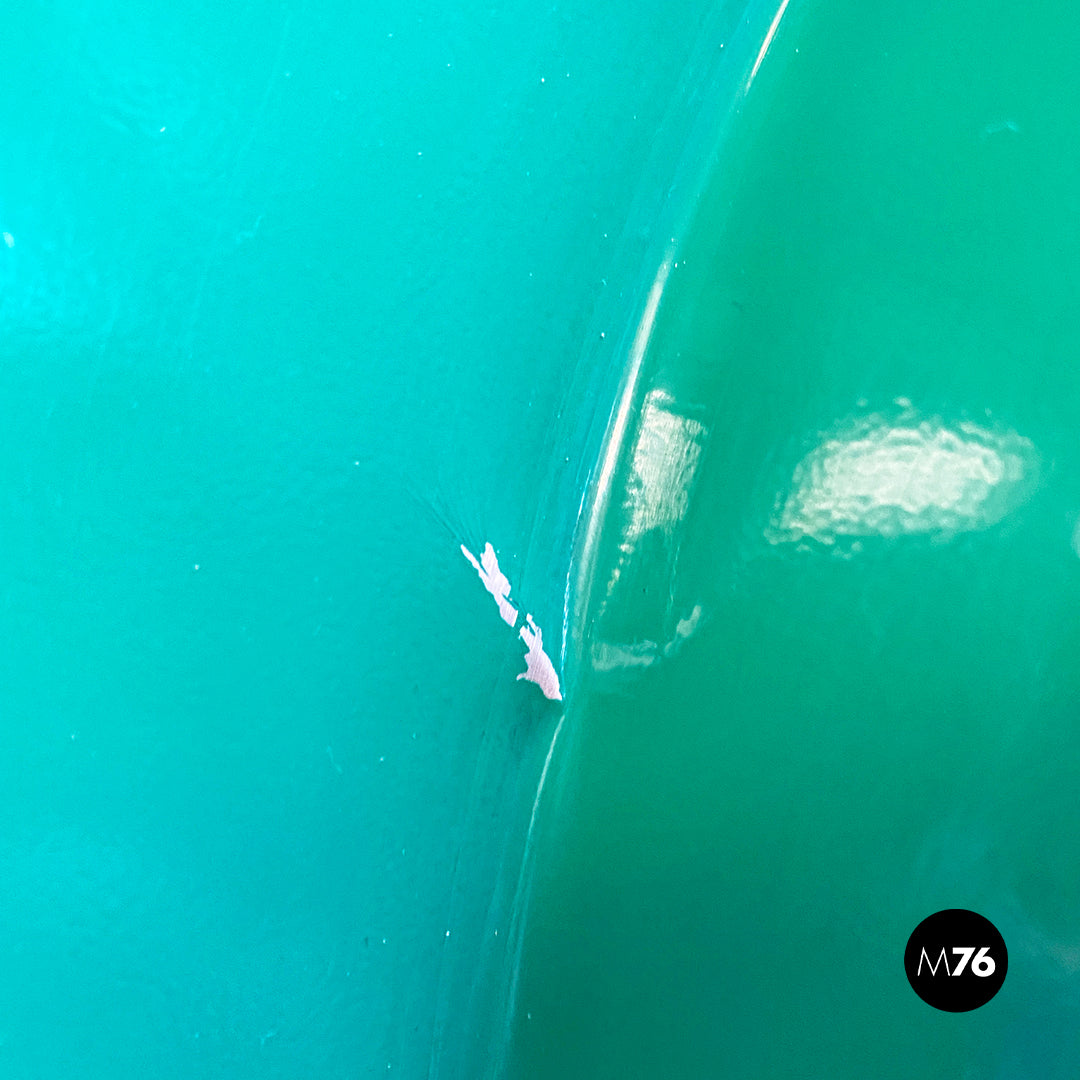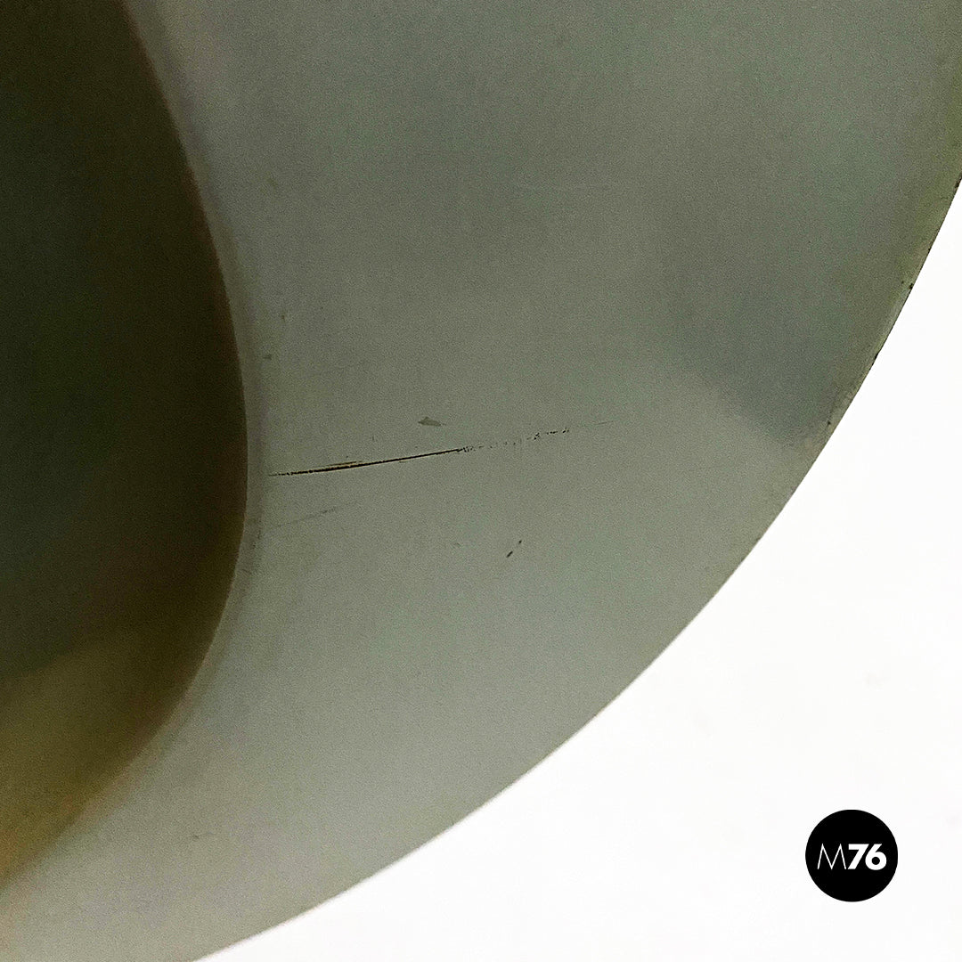 Lampadario a forma di cappello, in metallo verniciato verde lucido all’esterno e bianco opaco all’interno.