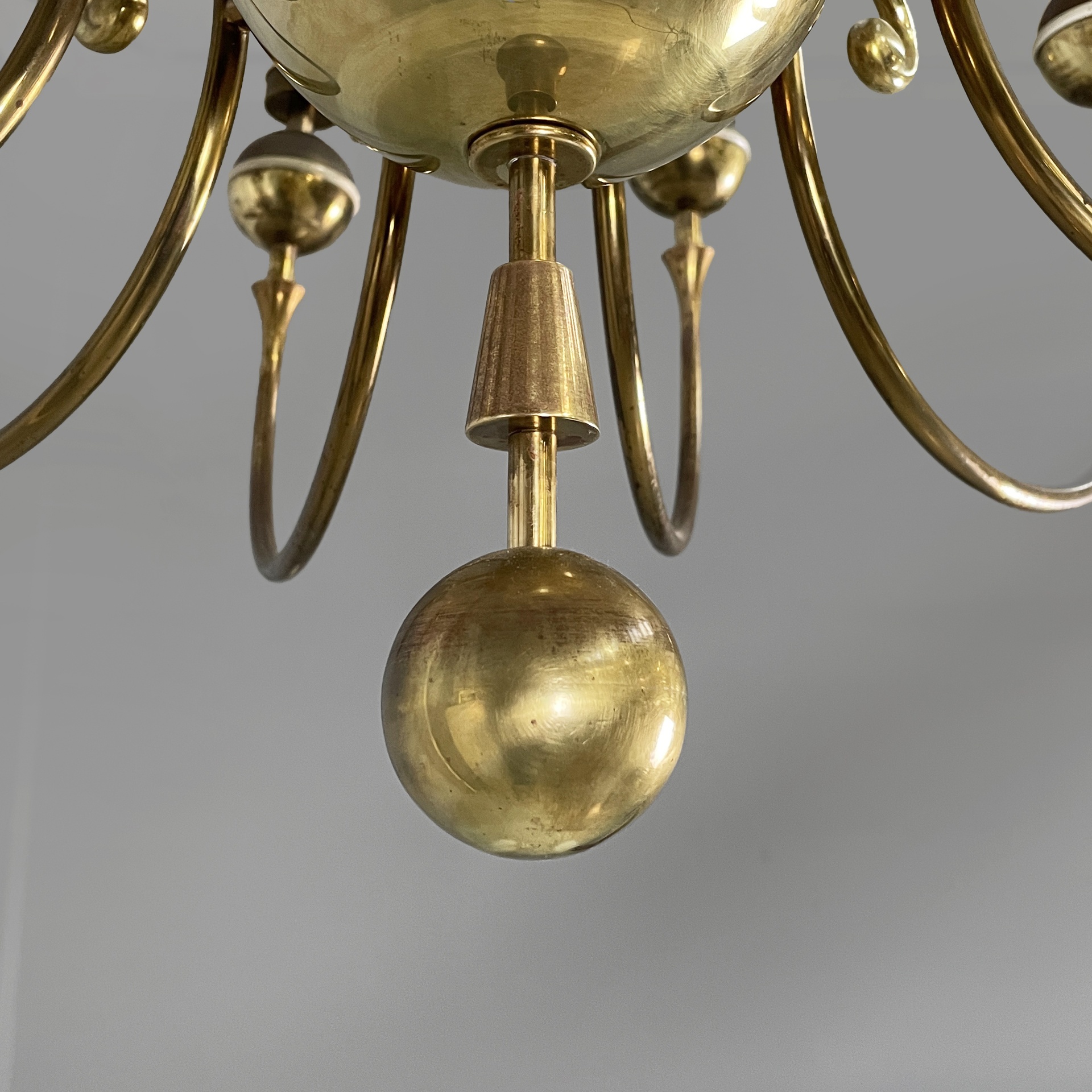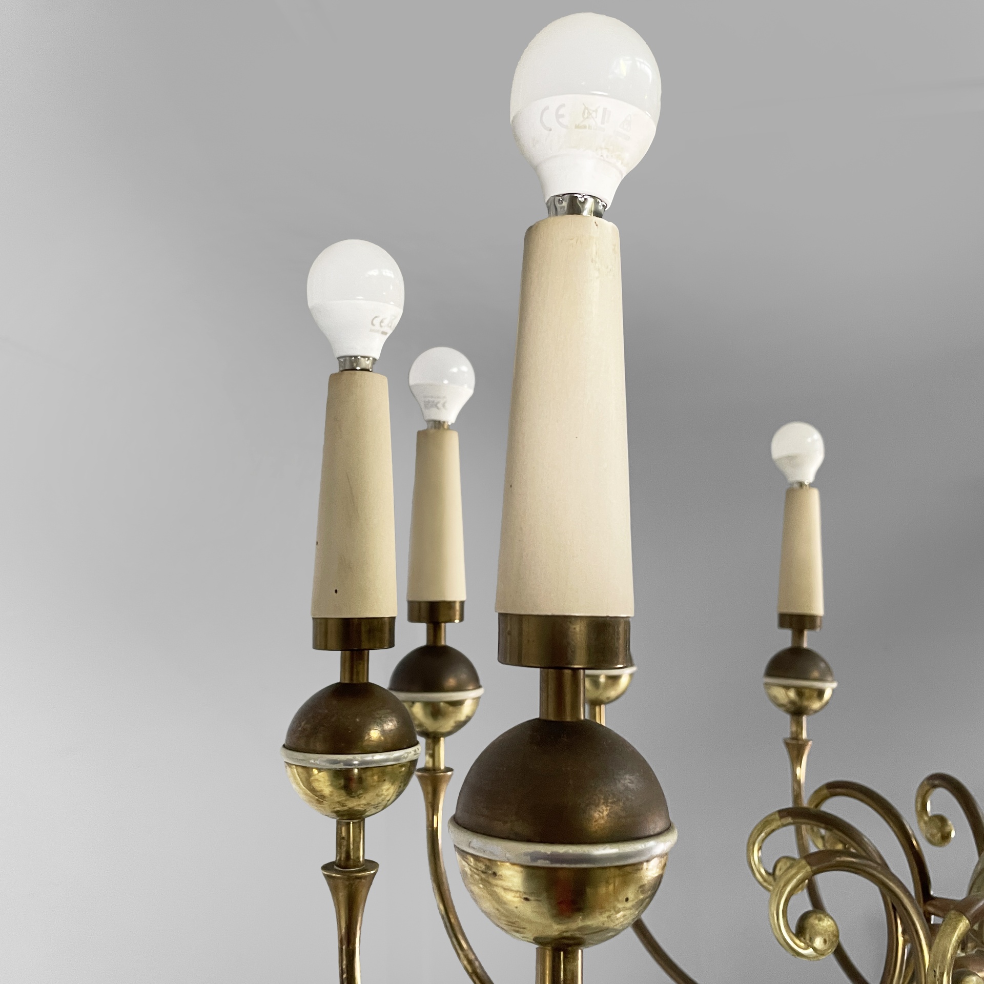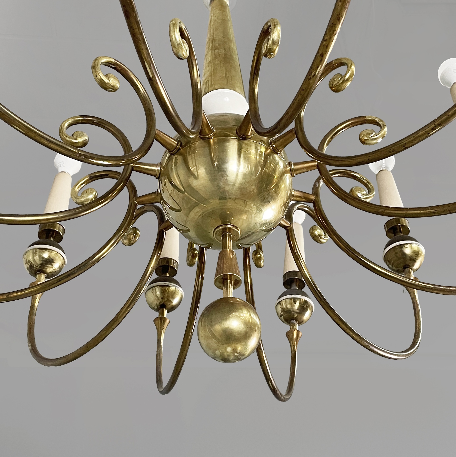 Lampadario a dodici bracci in tondino di ottone con sfere decorative e dettagli in metallo verniciato bianco. Il porta-lampadina è in legno verniciato bianco. La struttura centrale è composta da una sfera in ottone e uno stelo sagomato in ottone e metallo bianco. Attacco a soffitto in ottone.