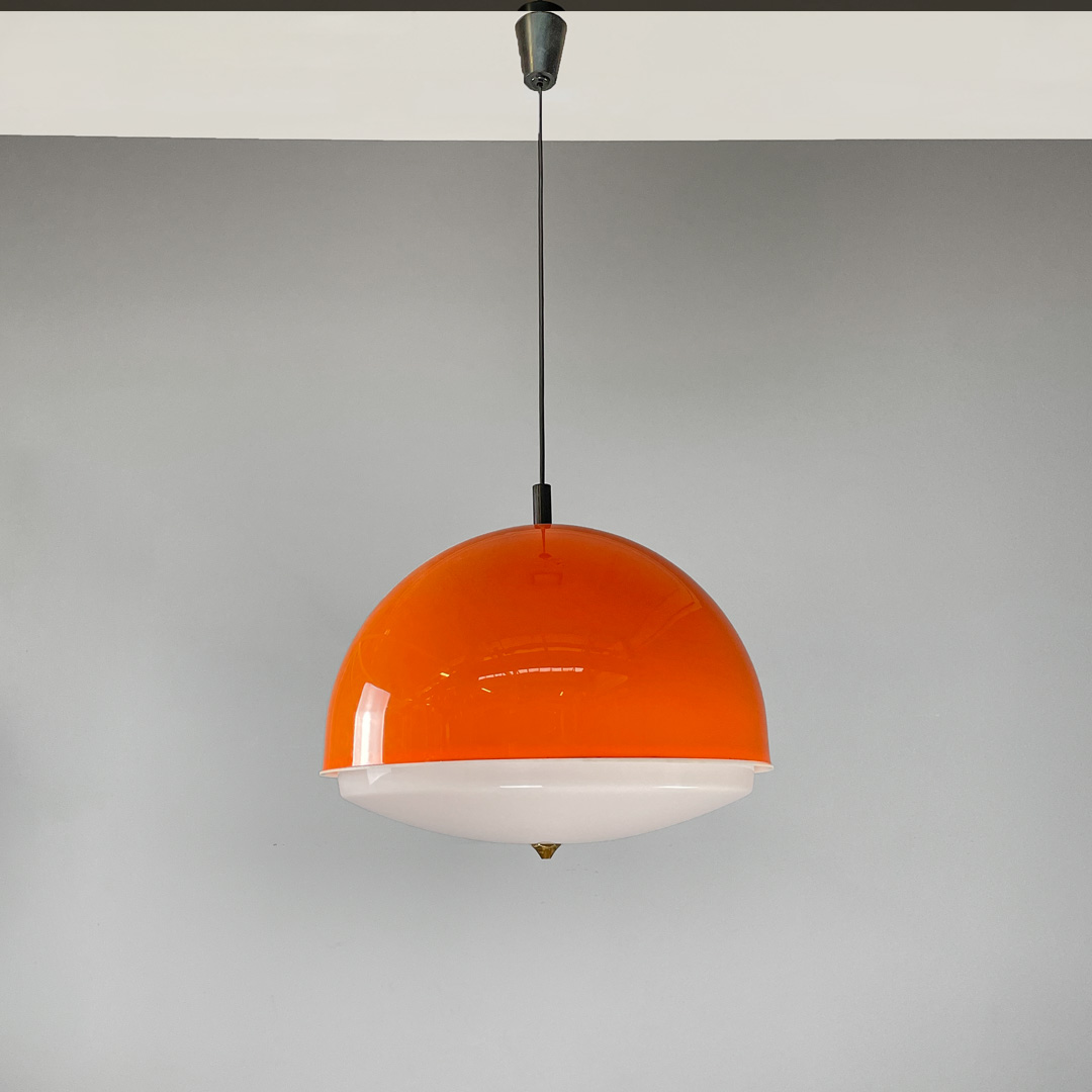 Lampadario a base tonda con diffusore a cupola in plastica arancione. La parte inferiore è di plastica bianca. Attacco al soffitto conico in metallo nero e in corrispondenza del cavo centrale si trova un elemento in metallo di colore dorato. Space age.