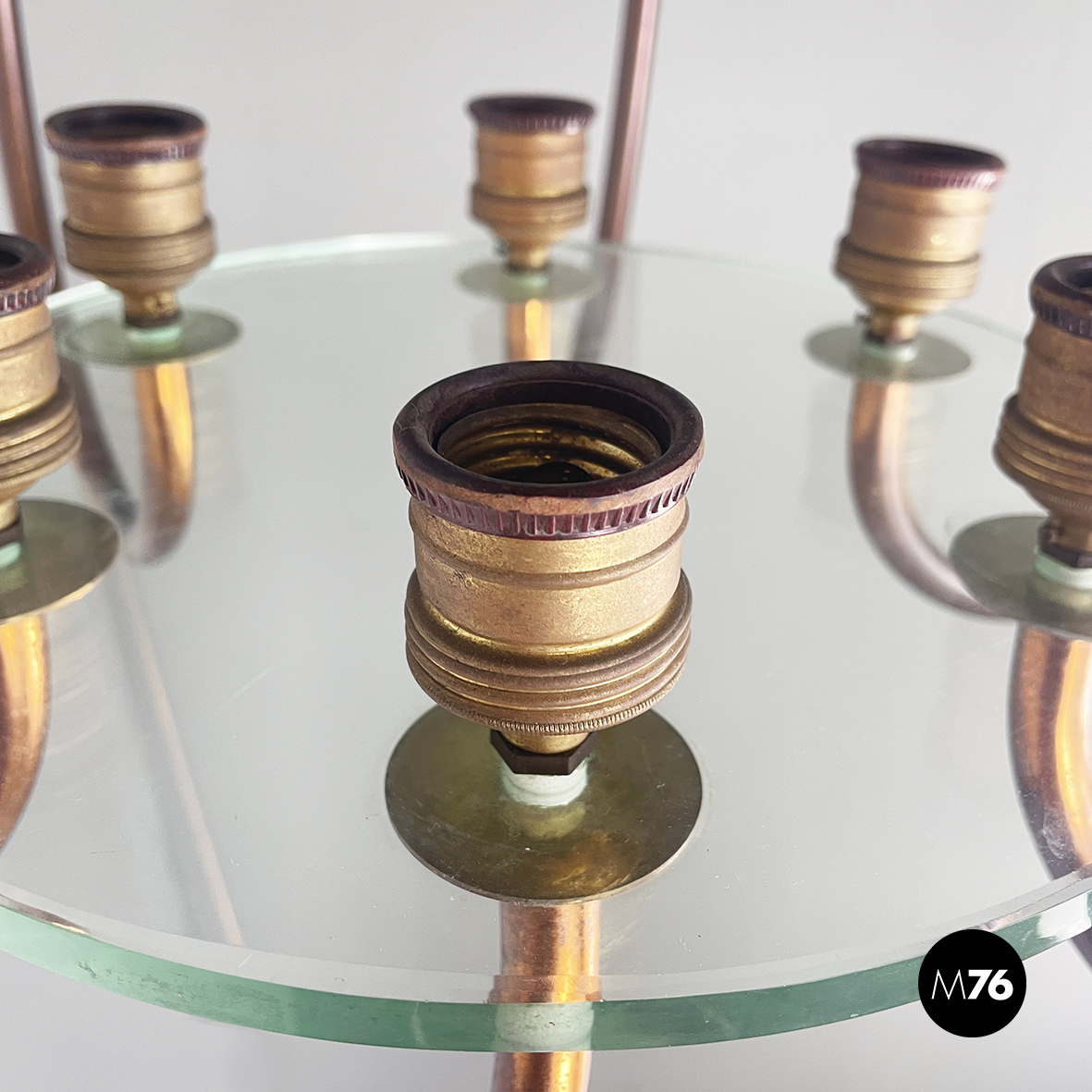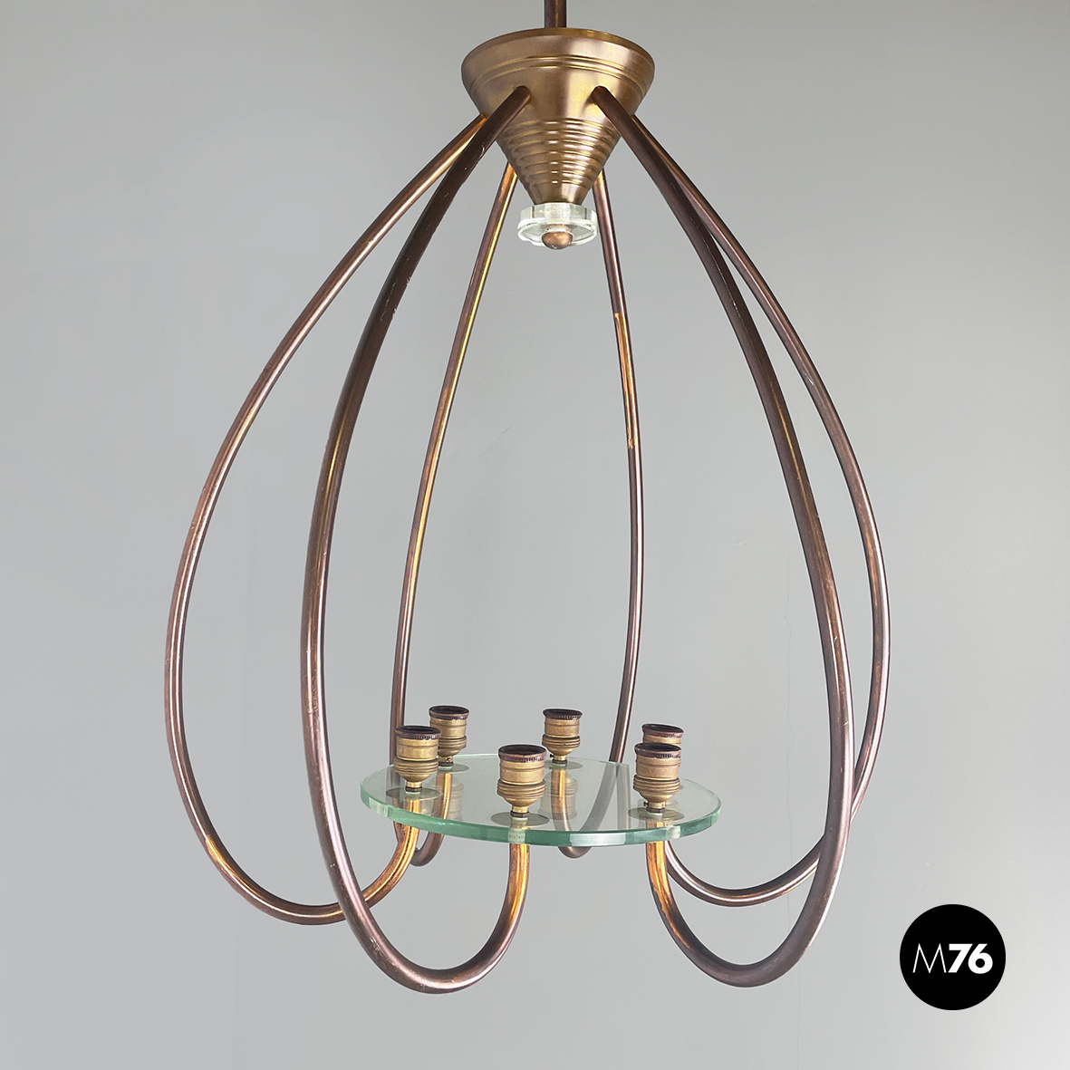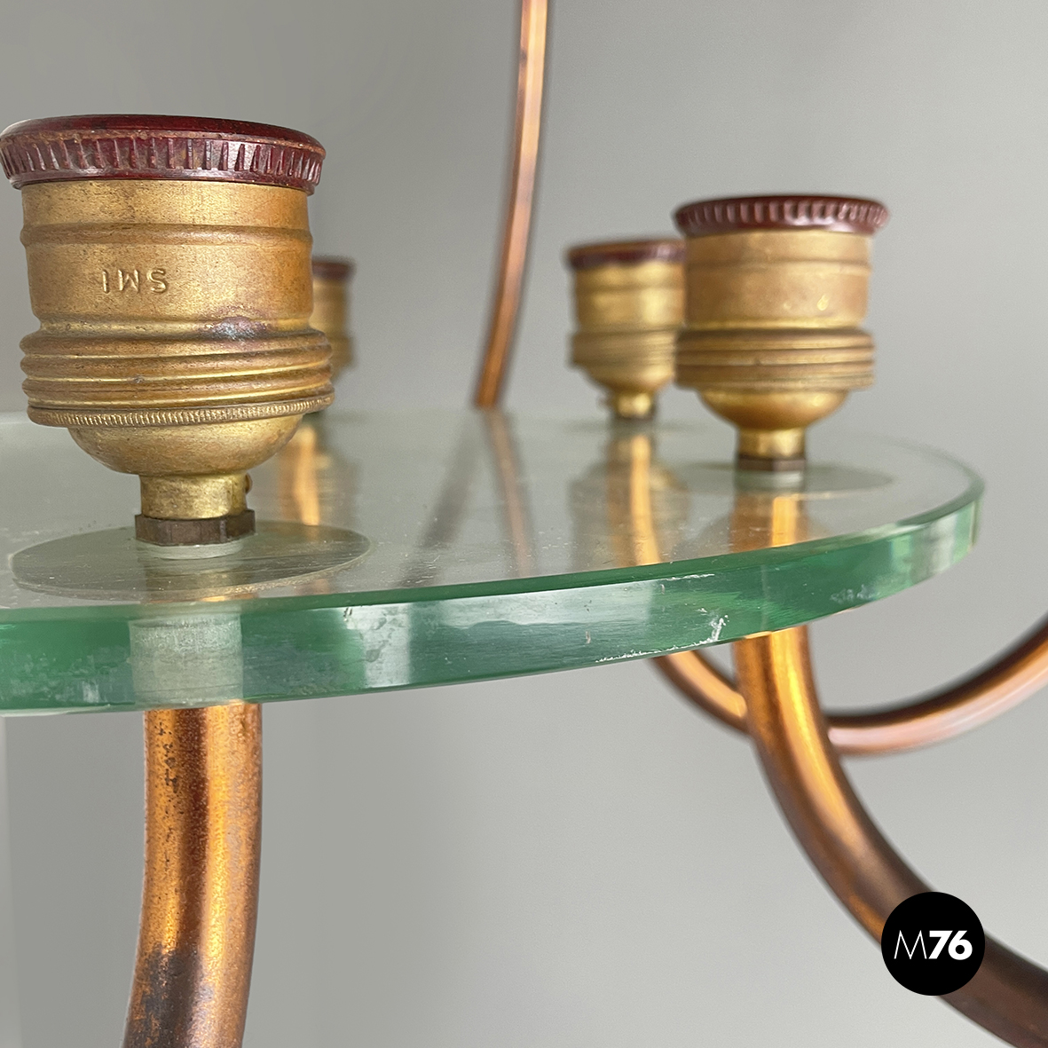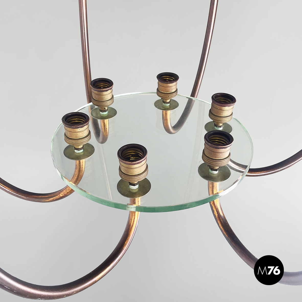 Lampadario composto da sei bracci ricurvi verso l’interno in tondino di rame. I bracci sono uniti al centro da una lastra tonda in vetro di grosso spessore, sulla quale sono poste le sei fonti luminose. La struttura è composta da una parte conica in rame con un dettaglio tondo in vetro spesso, un tondino di rame e una base tonda, anche essa in rame. Art Deco.